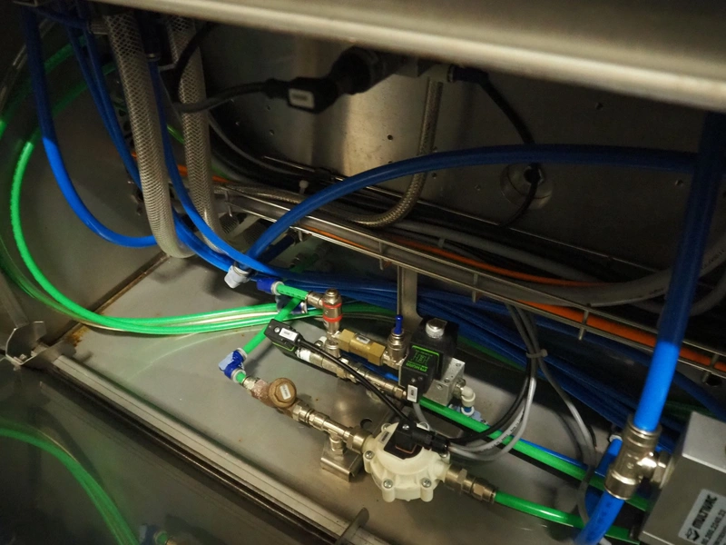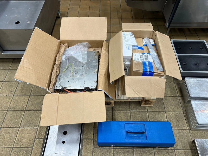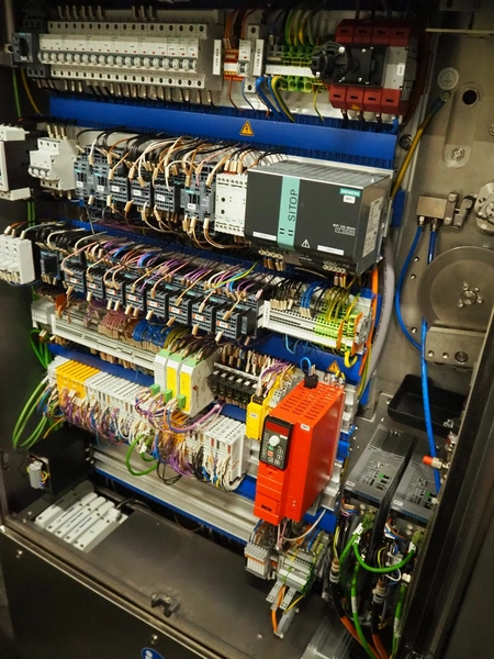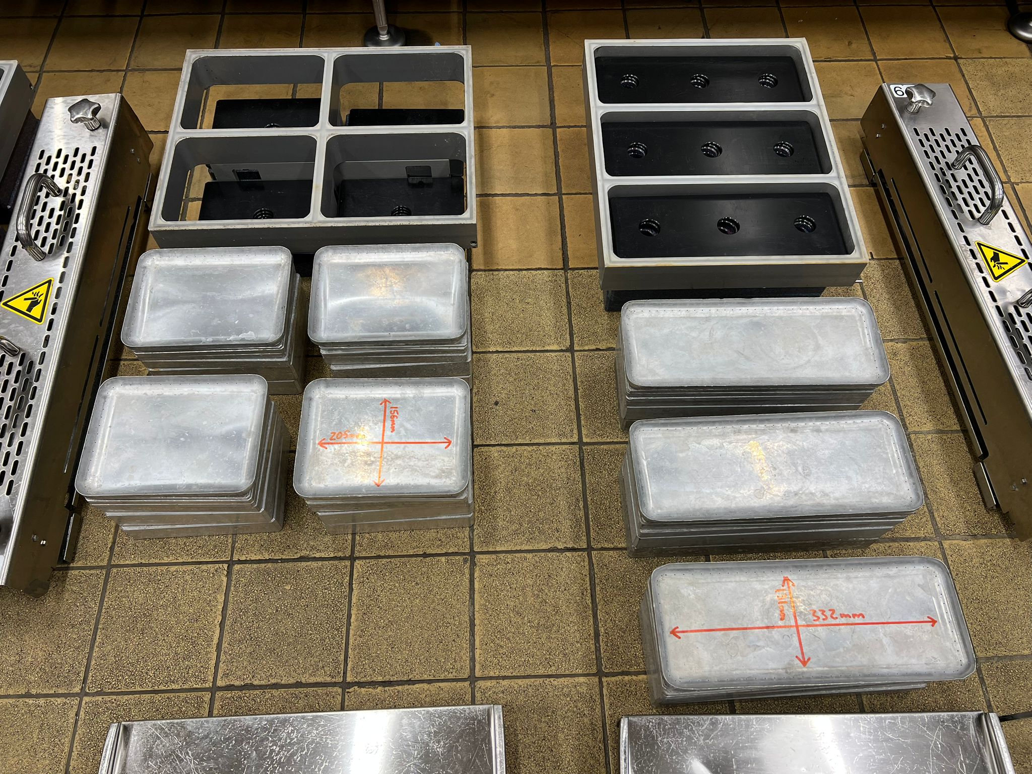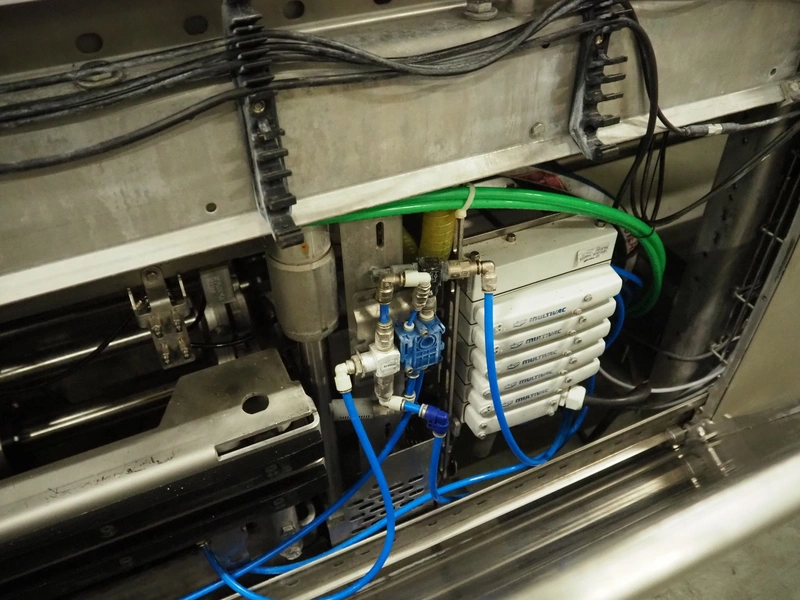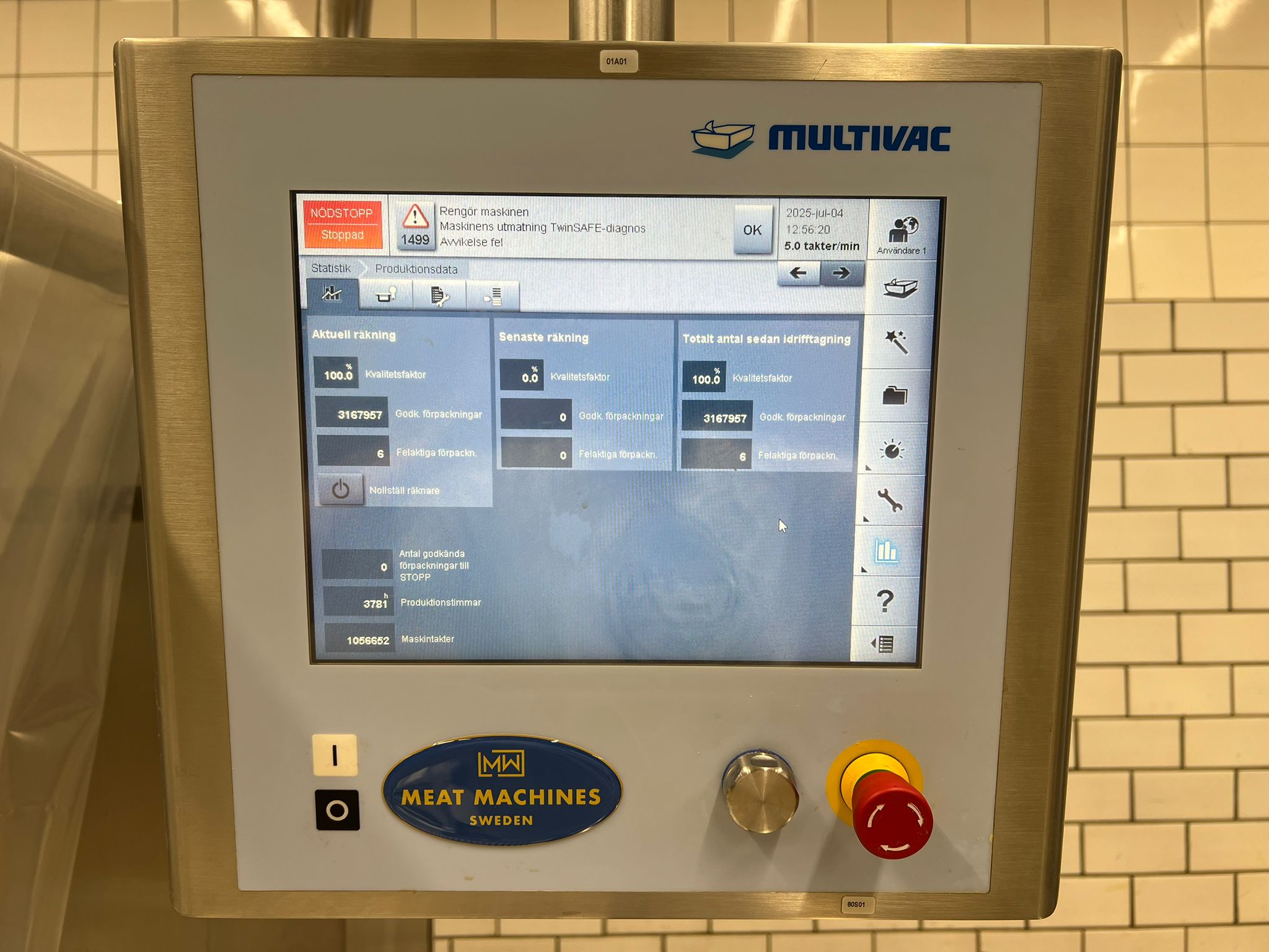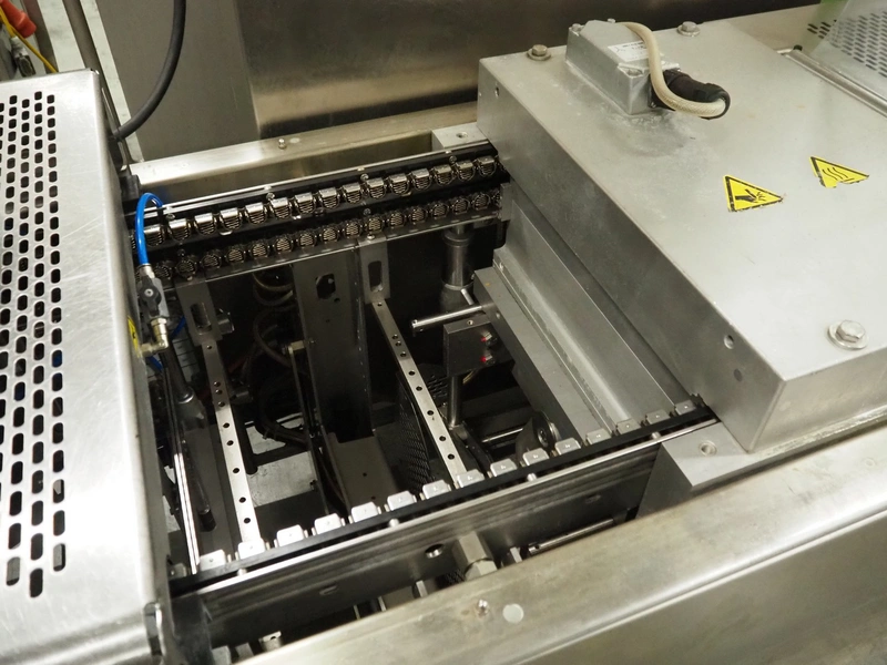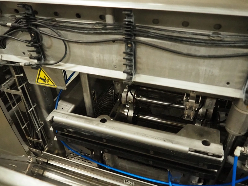 Multivac thermoformer, type: R245, serial number: 228342, year of construction: 2016, 400/230 V, 3 Ph, 50 Hz, 36/50 A, 14 kW, film width: 460 mm, dye: 322 mm x 425 mm, plastic mesh outfeed belt, belt width: 430 mm, Busch vacuum pump, type: RA 0100 F 503, capacity: 100 m³ per hour, total dimensions: 6400 mm x 1150 mm x 2350 mm, s/s trolley with parts, dimensions dye: (3x) 332 mm x 131mm, (2x) 332 mm x 205 mm, dimensions trolley: 1000 mm x 800 mm x 1400 mm.