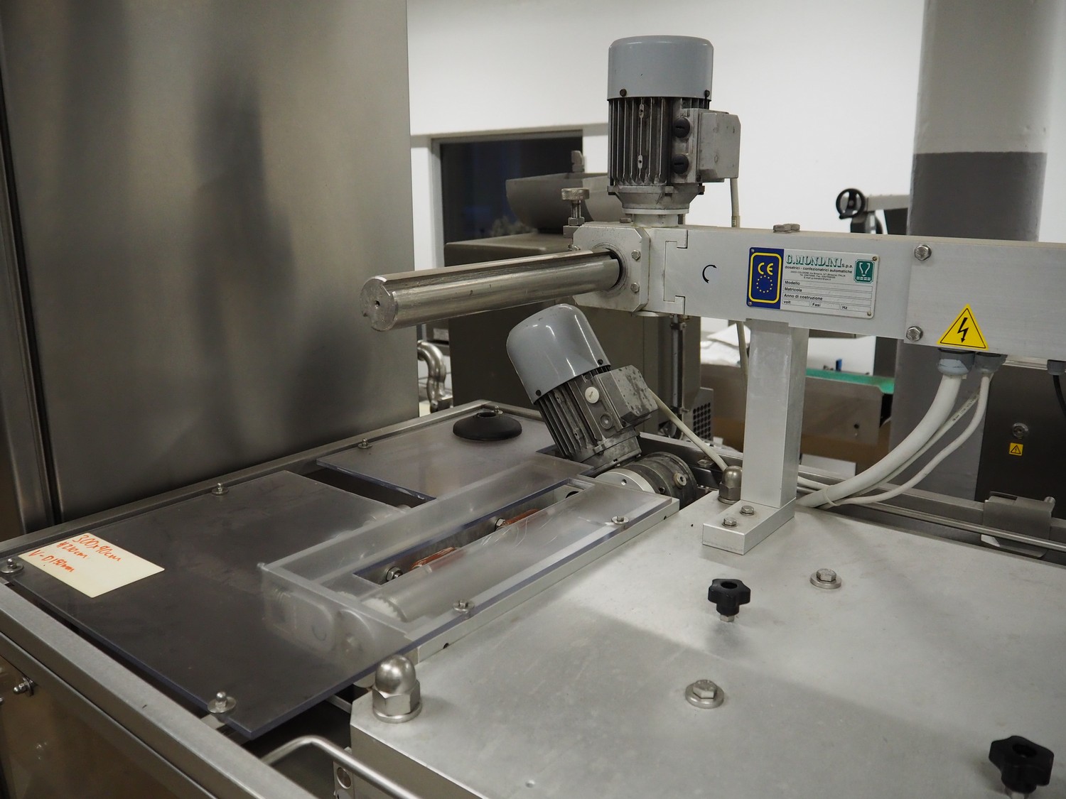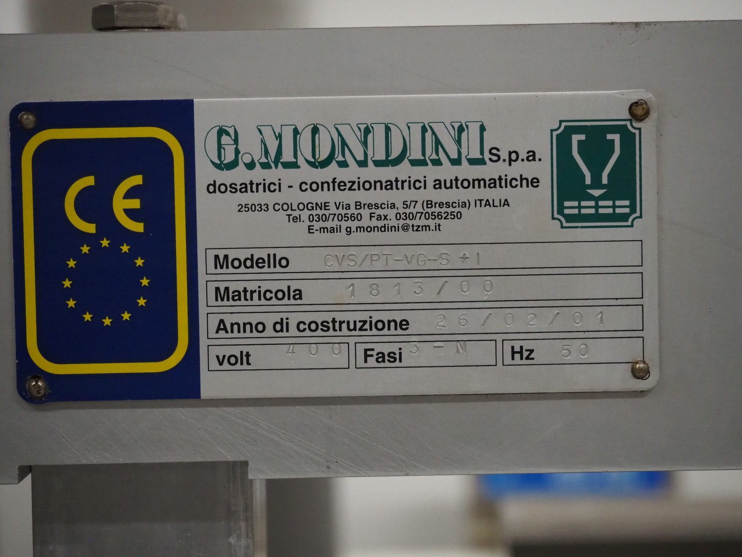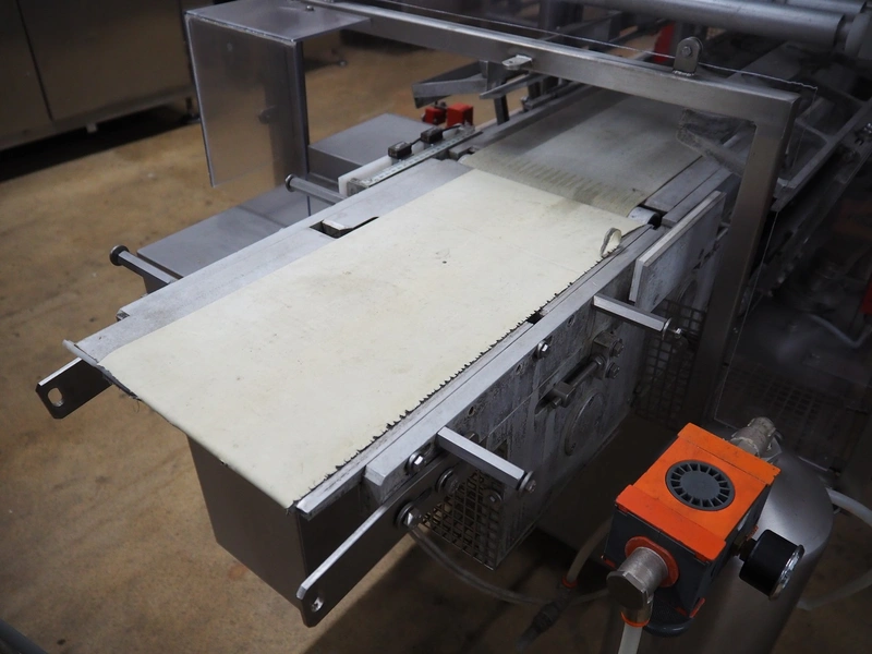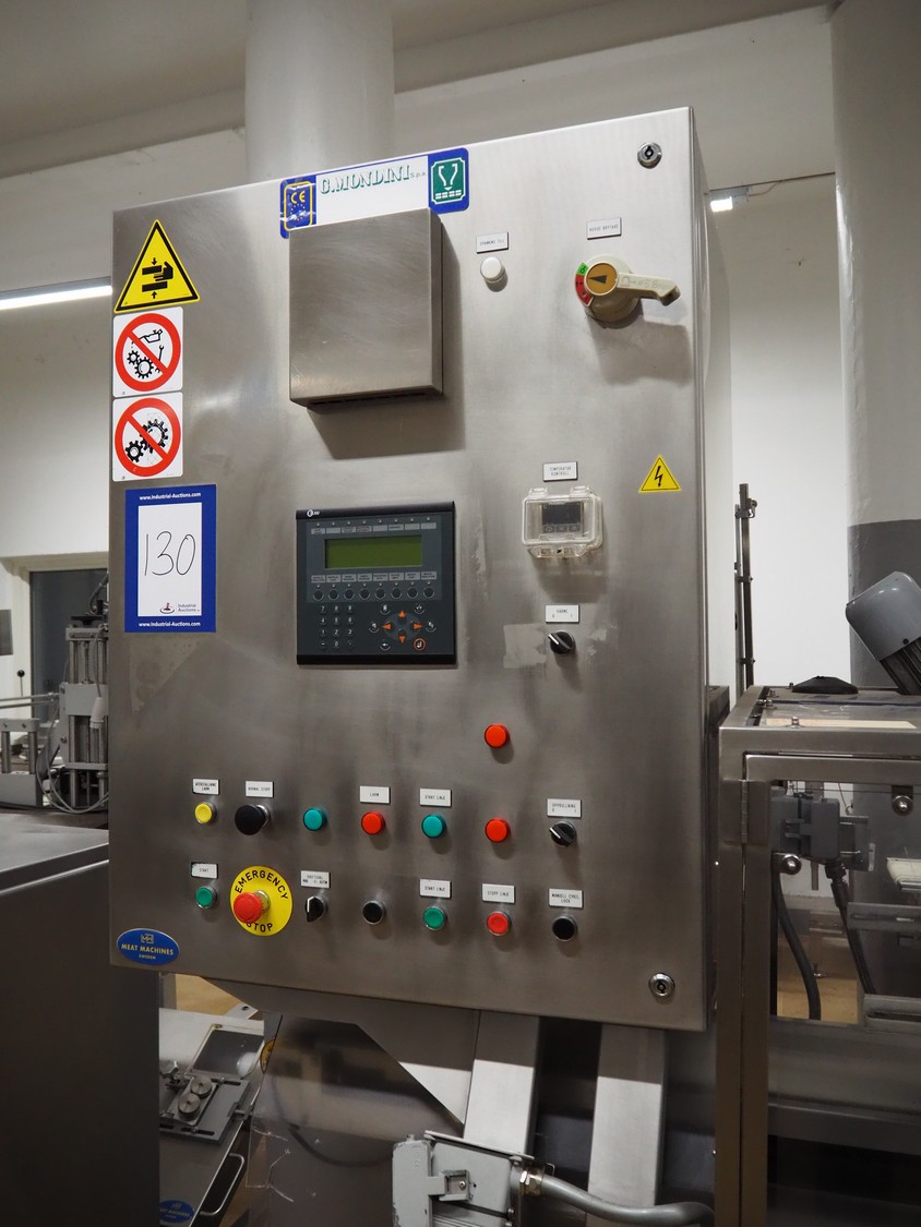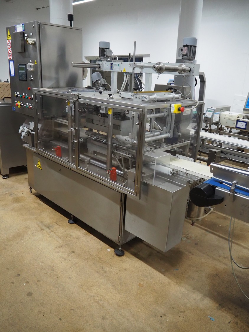 G.Mondini S.p.a. traysealer, model: CVS/PT-VG-S+I, number: 1813/00, year of construction: 26/02/01, 400 V, 3 Ph, 50 Hz, 60 A, 30 kW, dye: (3x) Ø 135 mm, plastic belts, belt width: (1x) 270 mm x (2x) 210 mm, total dimensions: 3000 mm x 950 mm x 2300 mm.