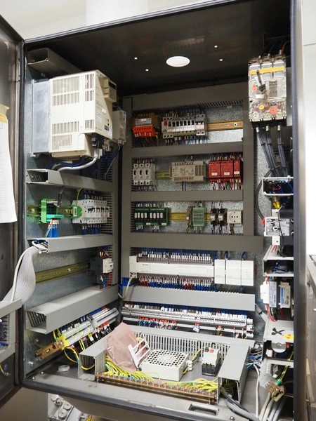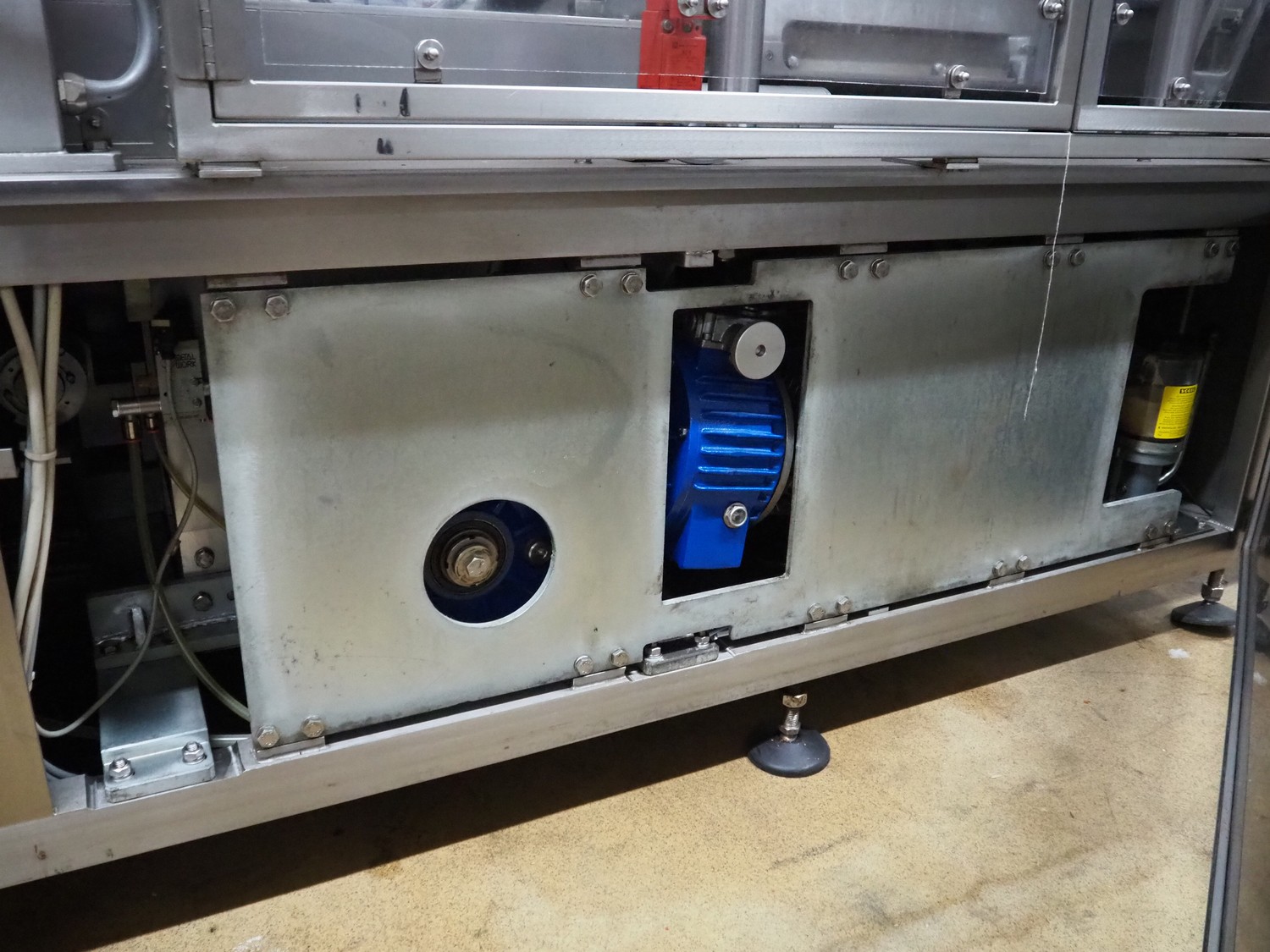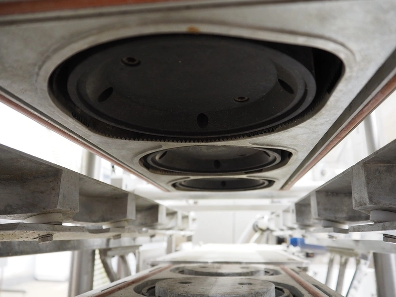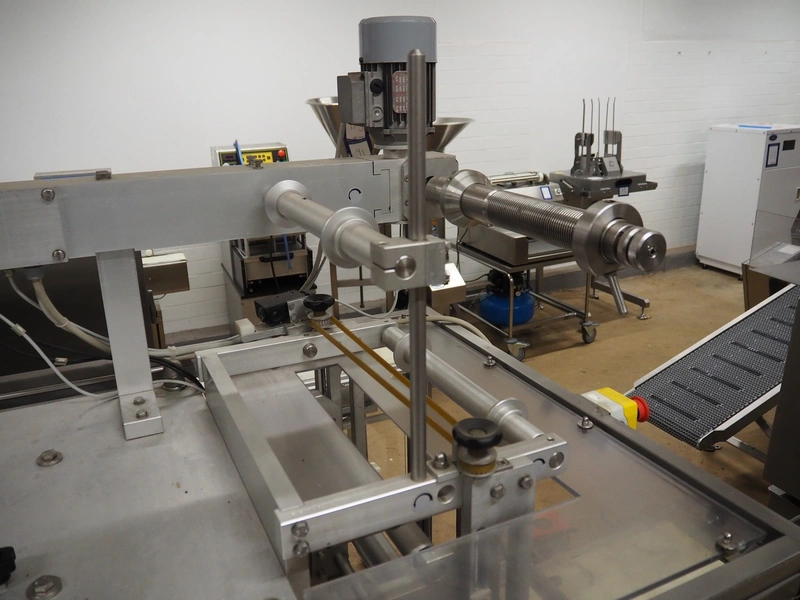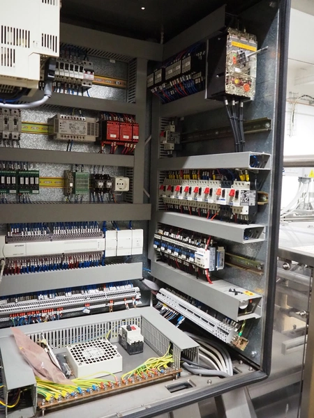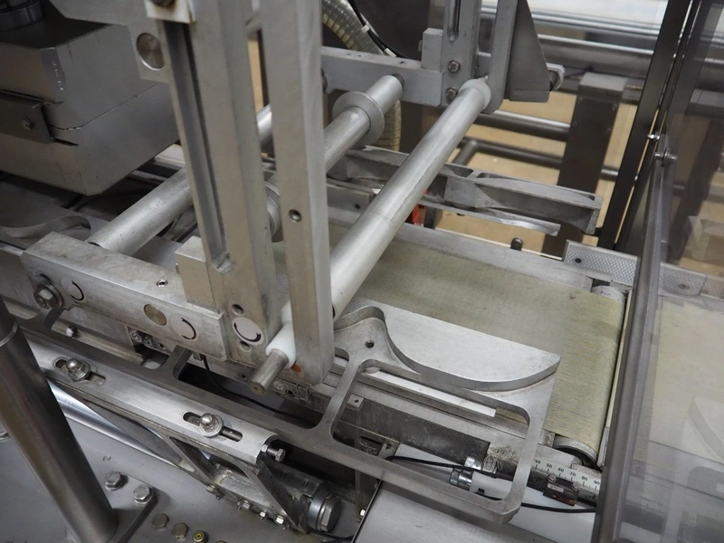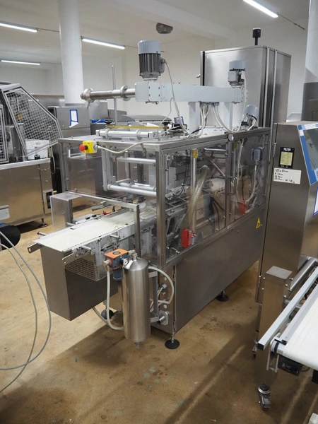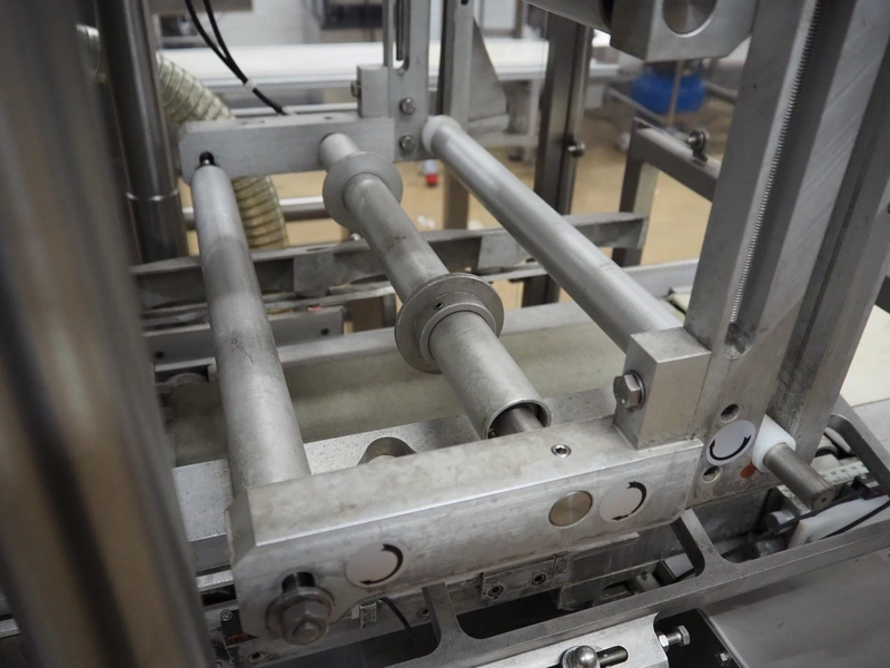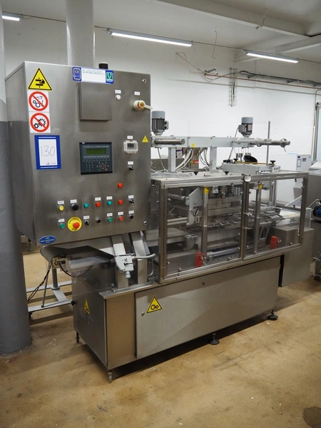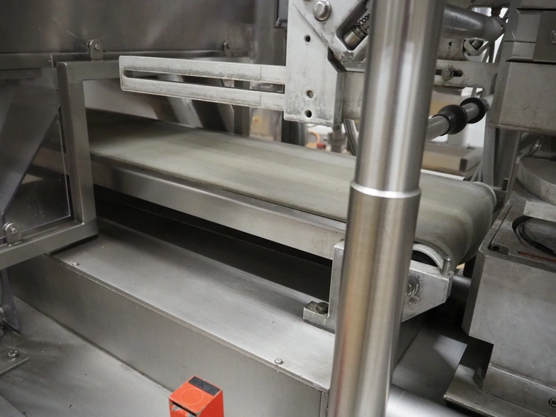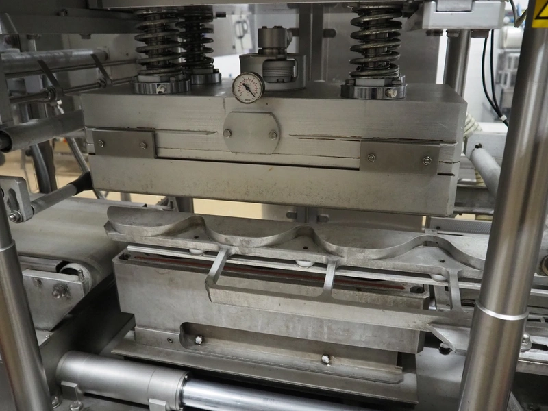 G.Mondini S.p.a. traysealer, model: CVS/PT-VG-S+I, number: 1813/00, year of construction: 26/02/01, 400 V, 3 Ph, 50 Hz, 60 A, 30 kW, dye: (3x) Ø 135 mm, plastic belts, belt width: (1x) 270 mm x (2x) 210 mm, total dimensions: 3000 mm x 950 mm x 2300 mm.