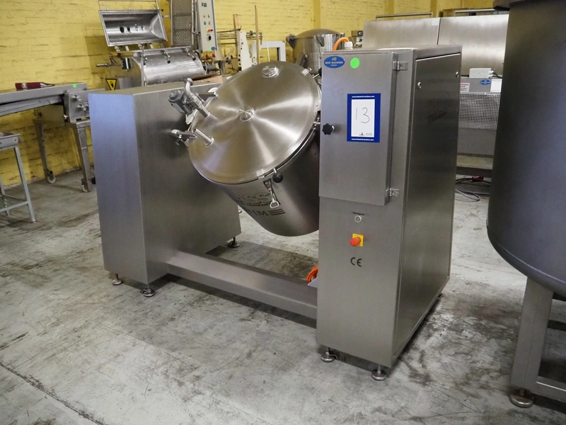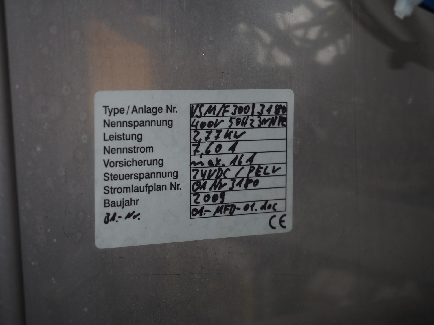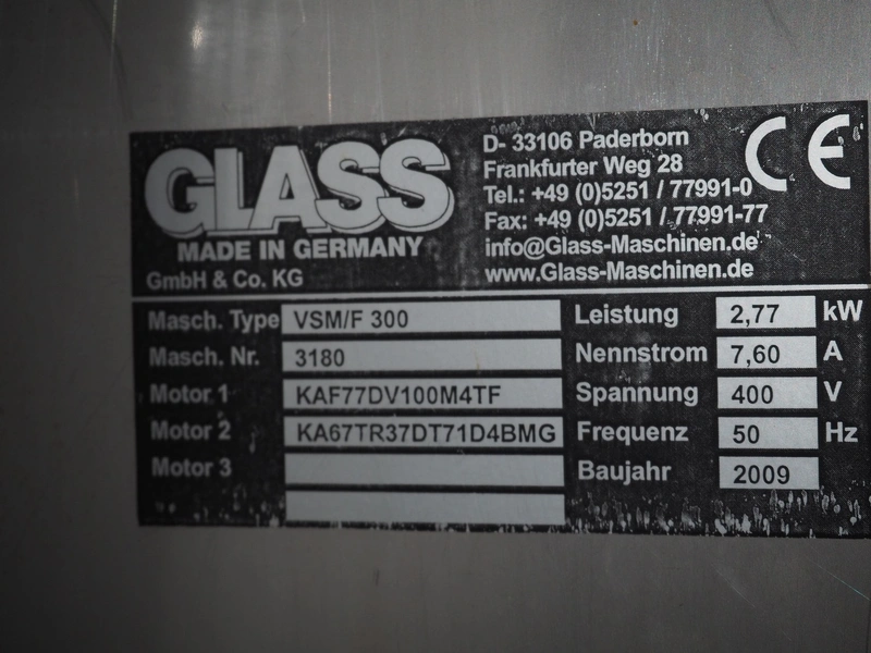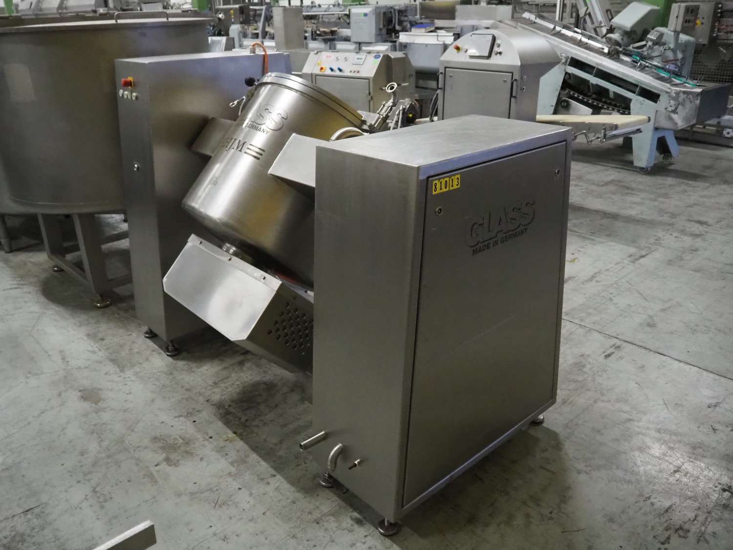 Glass GmbH tiltable vacuum tumbler, type: VSM/F 300, machine number: 3180, year of construction: 2009, 400 V, 50 Hz, 7.60 A, 2.77 kW, volume: 300 liter, dimensions: 1800mm x 1100 mm x 1800 mm. Without vacuum pump.