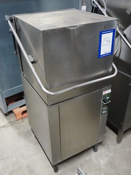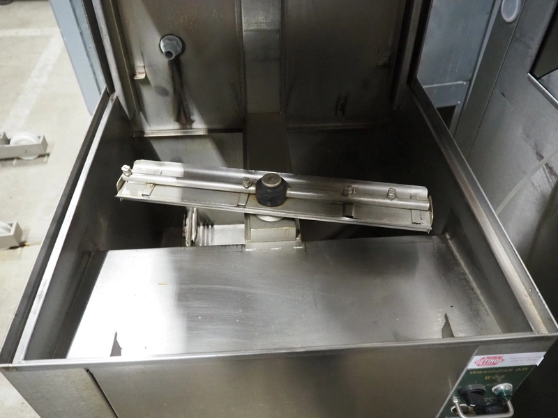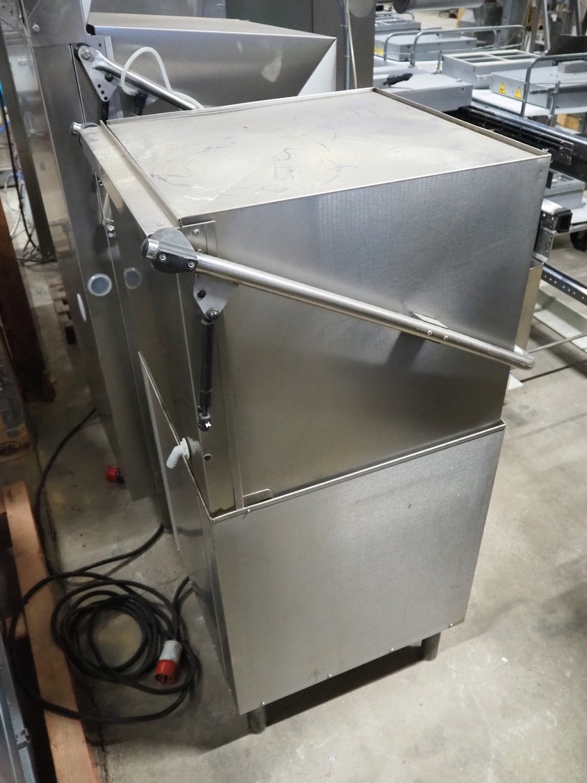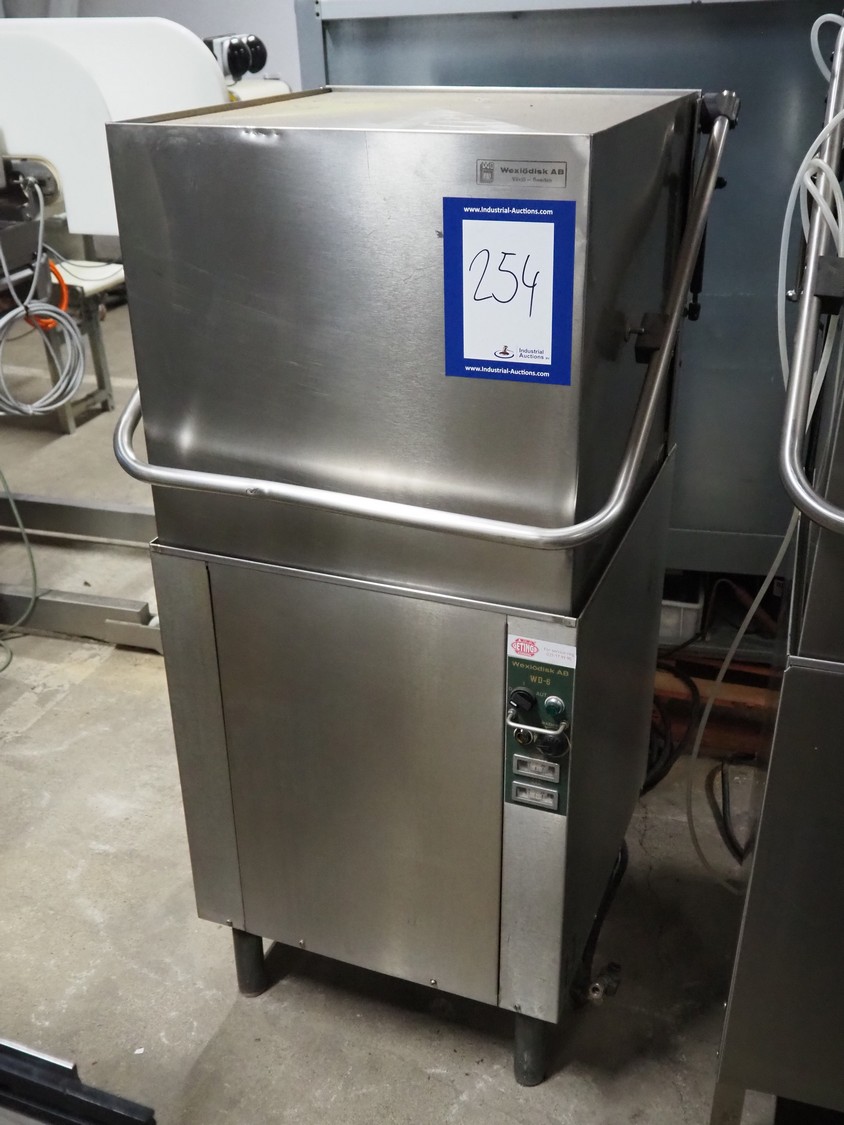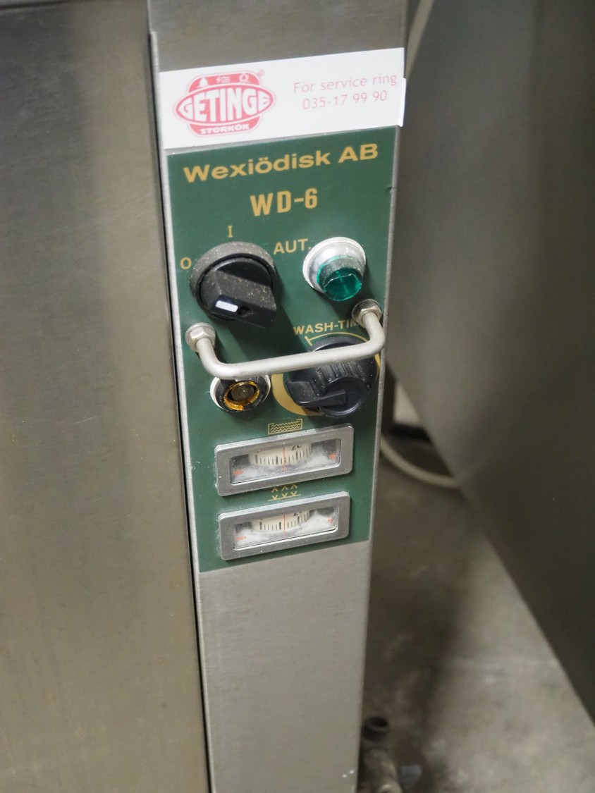 Wexiödisk AB dishwasher, type: WD-6, number: 90 533, 380 V, 3 Ph, 50 Hz, 15 A, 1.1/10.5 kW, clearance: 520 mm x 550 mm, total dimensions: 700 mm x 730 mm x 1410 mm.