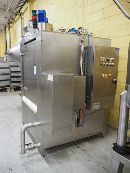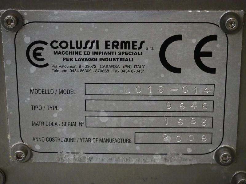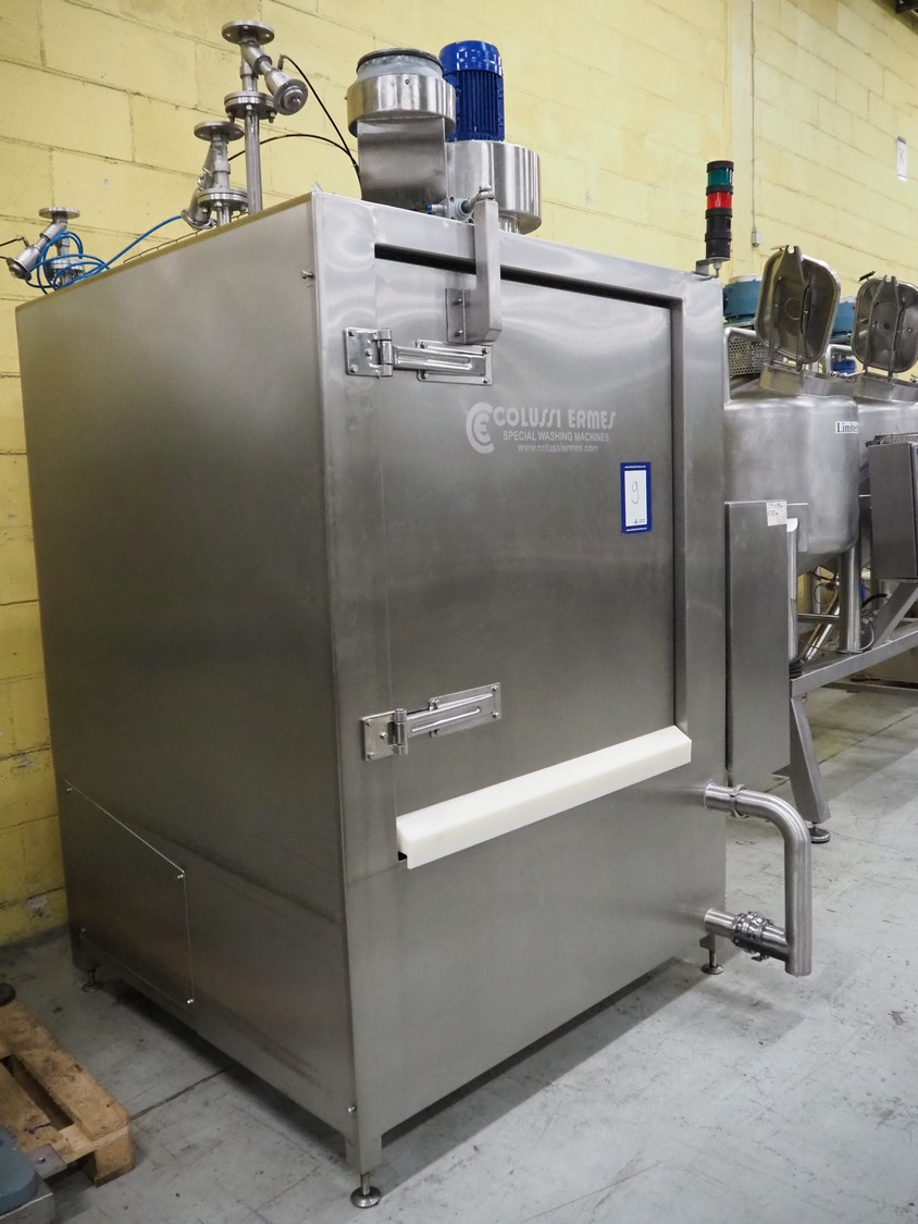 Colussi Ermers S.r.l. meat bin washer, model: L013-014, type: 9646, serial number: 1683, year of construction: 2008, dimensions: 1950 mm x 1950 mm x 2800. Including s/s fences.