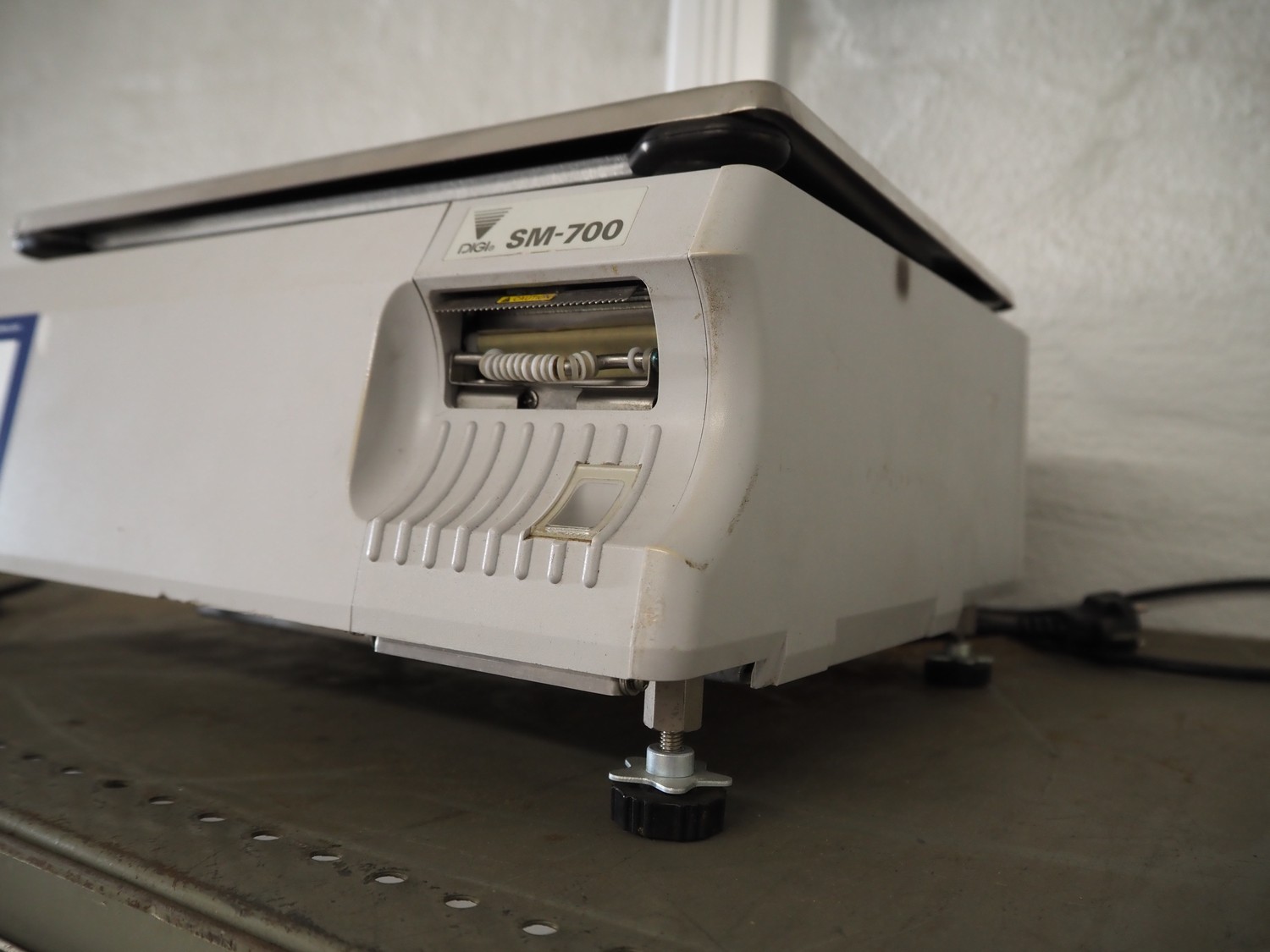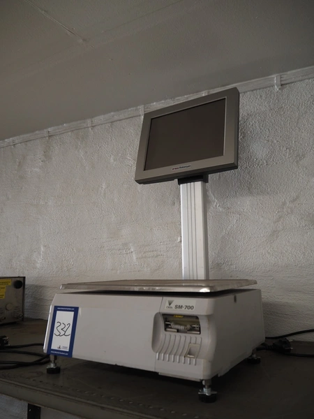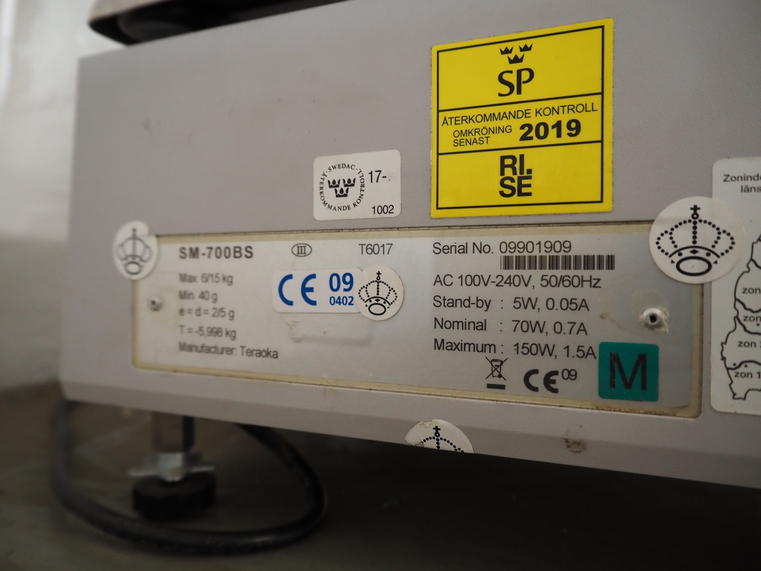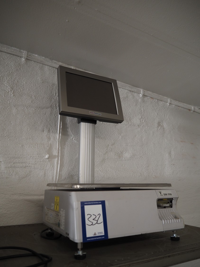 Teraoka weighing scale with label printer, model: SM-700 BS, serial number: 09901909, 100-240 V, 50/60 Hz, 0.7 A, 70 W, maximum: 6/15 kg, minimum: 40 gram, e=d= 2/5 gram, T= -5.998 kg, dimensions scale: 380 mm x 275 mm, total dimensions: 400 mm x 400 mm x 710 mm.