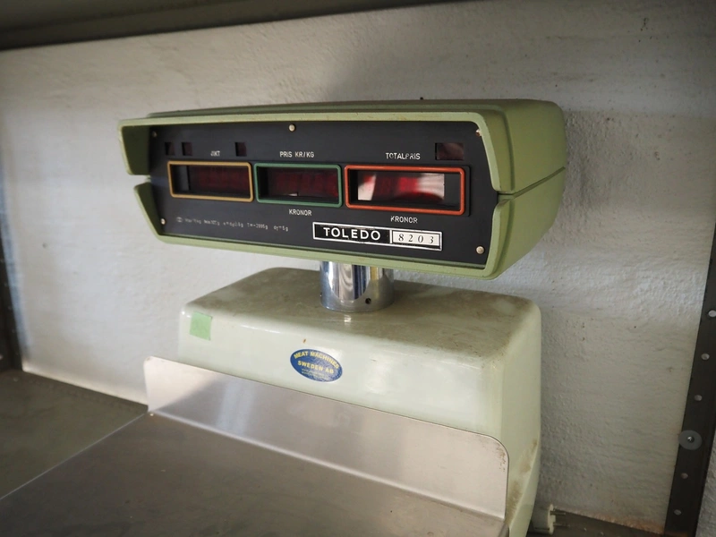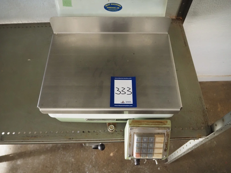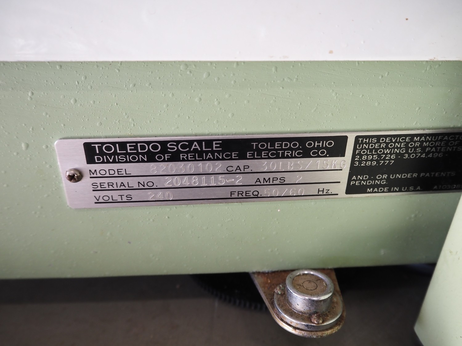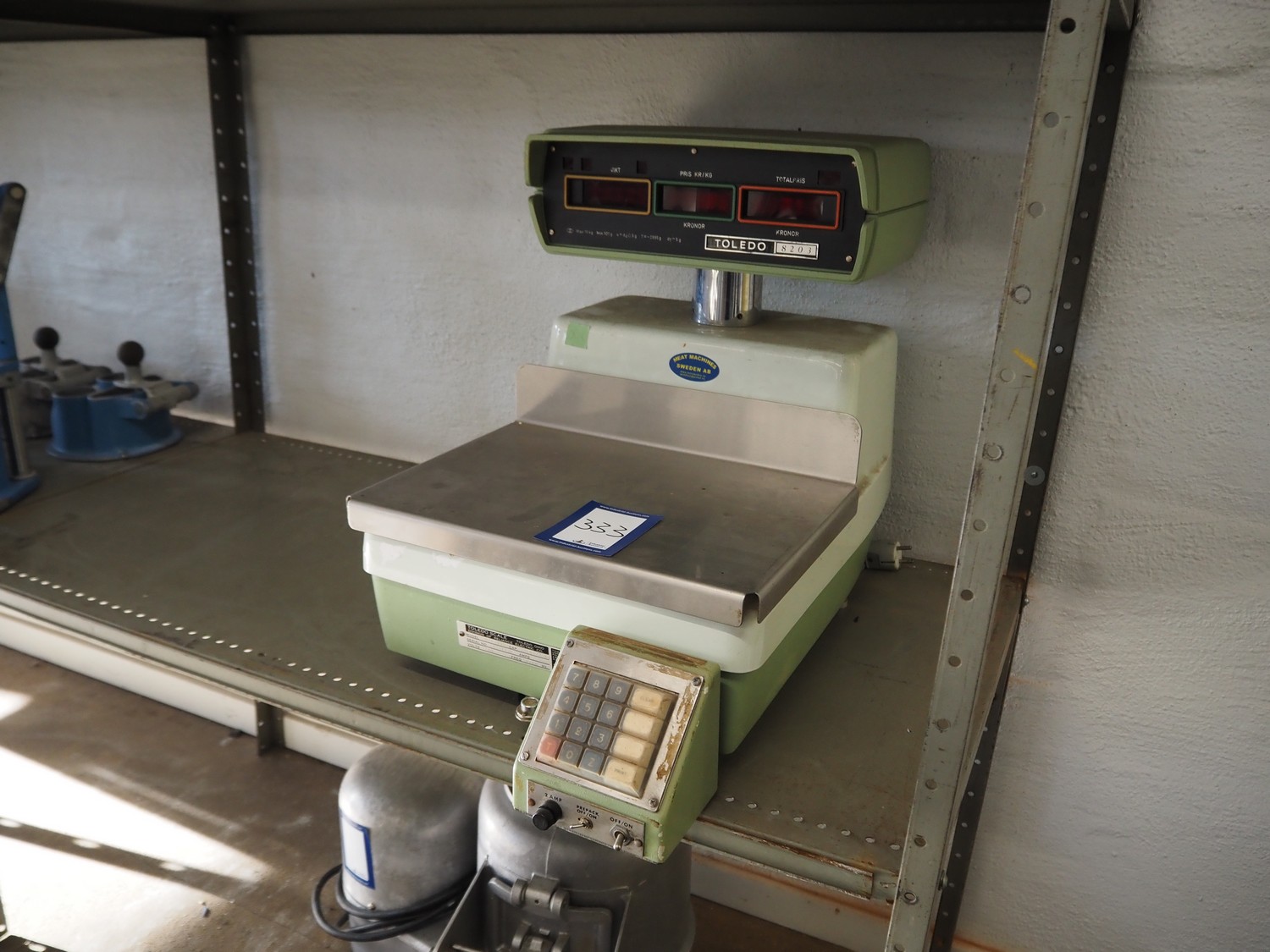 Toledo weighing scale, model: 82030102, serial number: 2048115-2, 240 V, 50/60 Hz, 2 A, maximum weight: 15 kg, minimum weight: 100 gram, e=d=: 5 gram, T= -9995 gram, screen on 2 sides, dimensions scale: 410 mm x 290 mm, total dimensions: 650 mm x 550 mm x 450 mm.