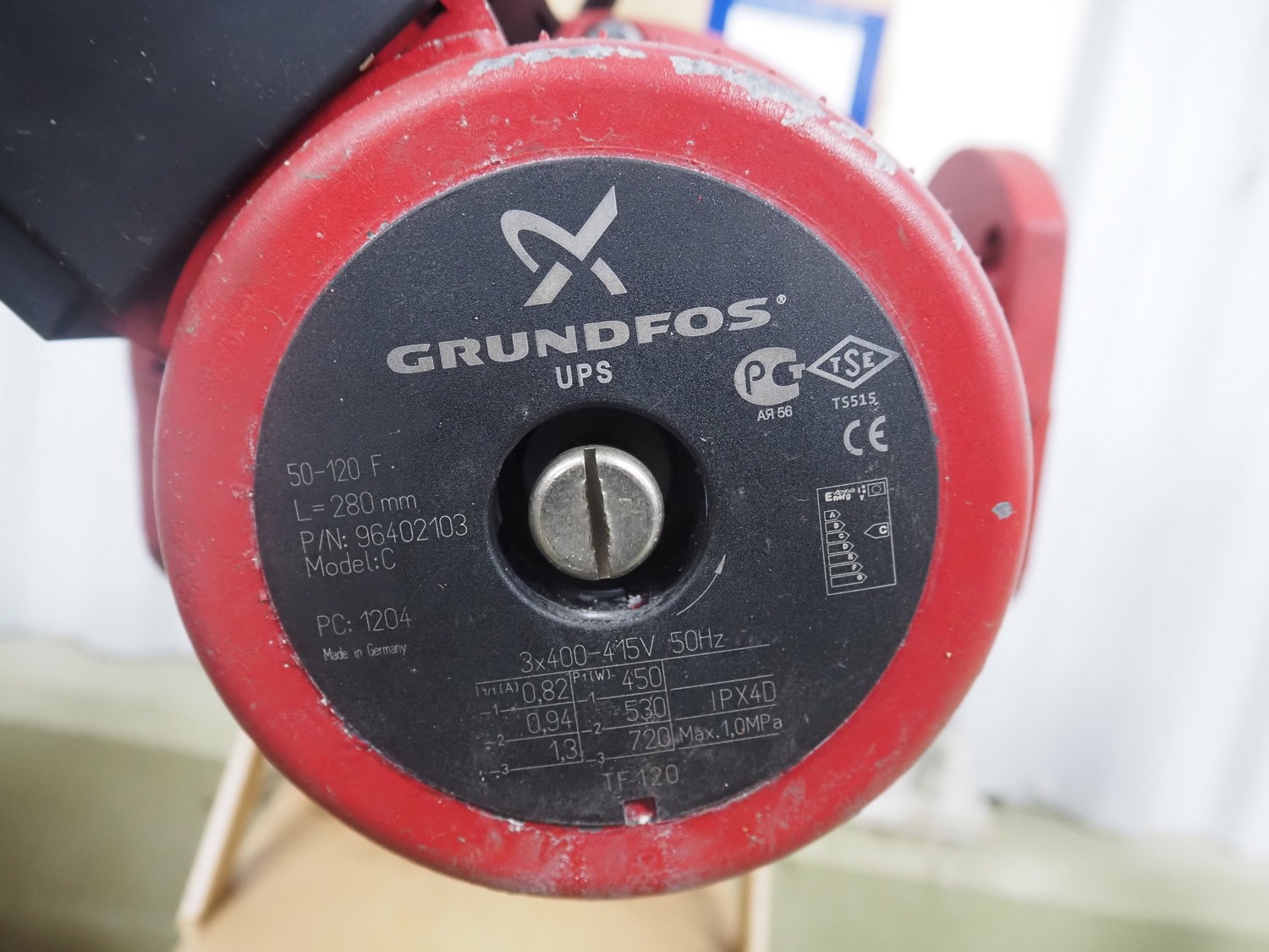 Grundfos circulation pump, type: UPS 50-120 F, serial number: 96402103, 3 x 400-415 V, 50 Hz, dimensions: 300 mm x 300 mm x 900 mm. Lot located on another location in Sövestad (SE), viewing and pick up in consultation with Industrial Auctions BV.
