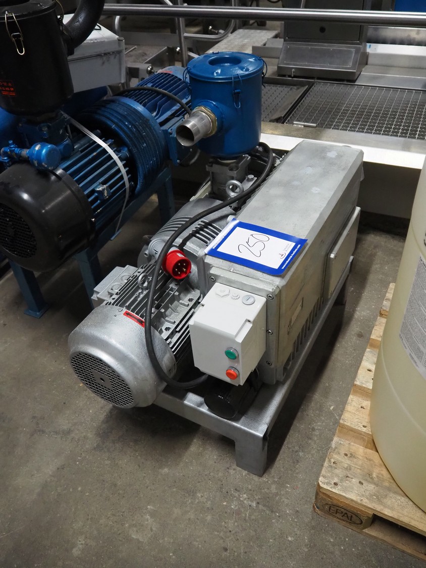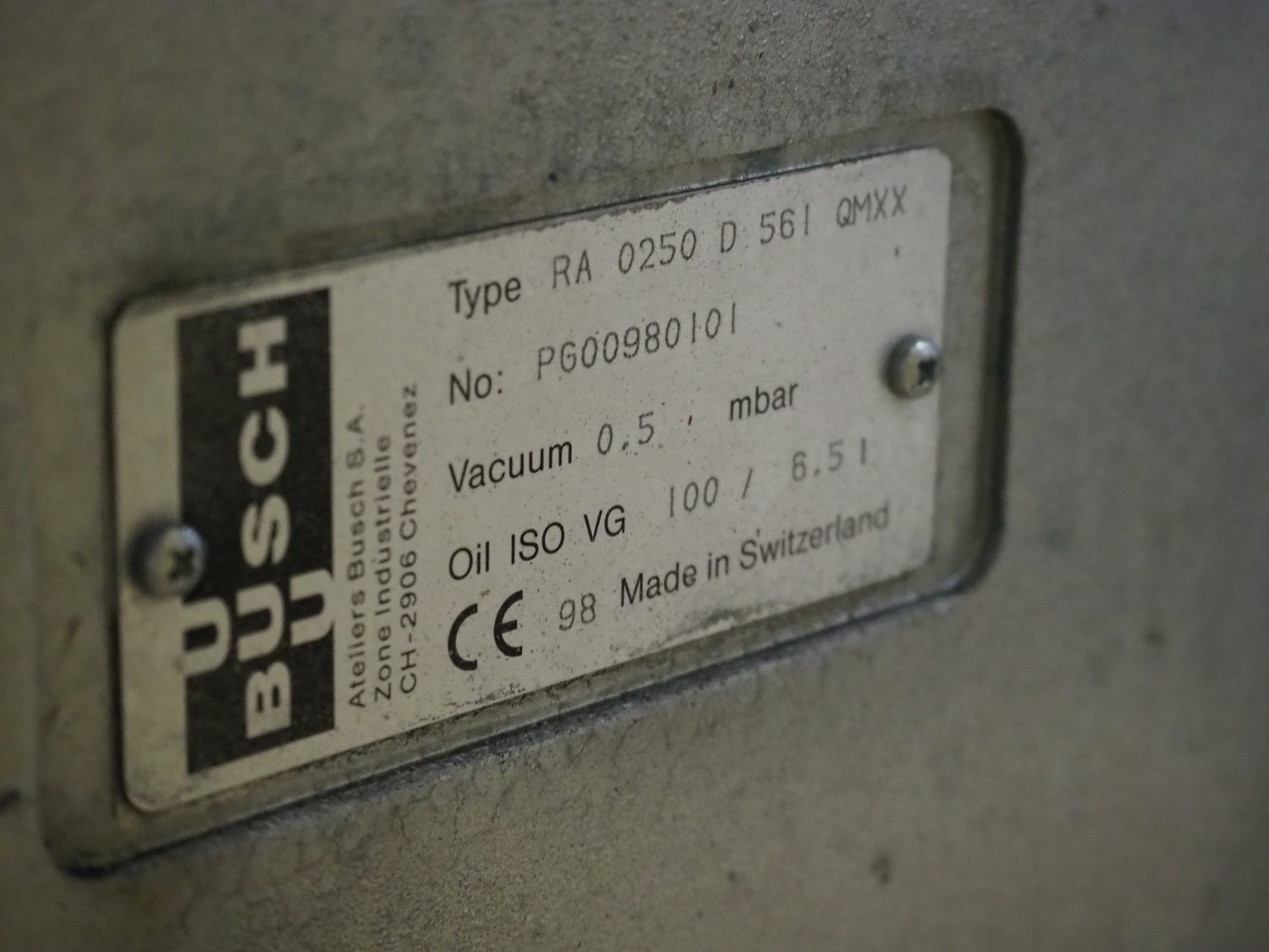 Busch vacuum pump, type: RA 0250 D 561 QMXX, number: P600980101, capacity: 250 m³ per hour, dimensions: 1100 mm x 500 mm x 900 mm.
