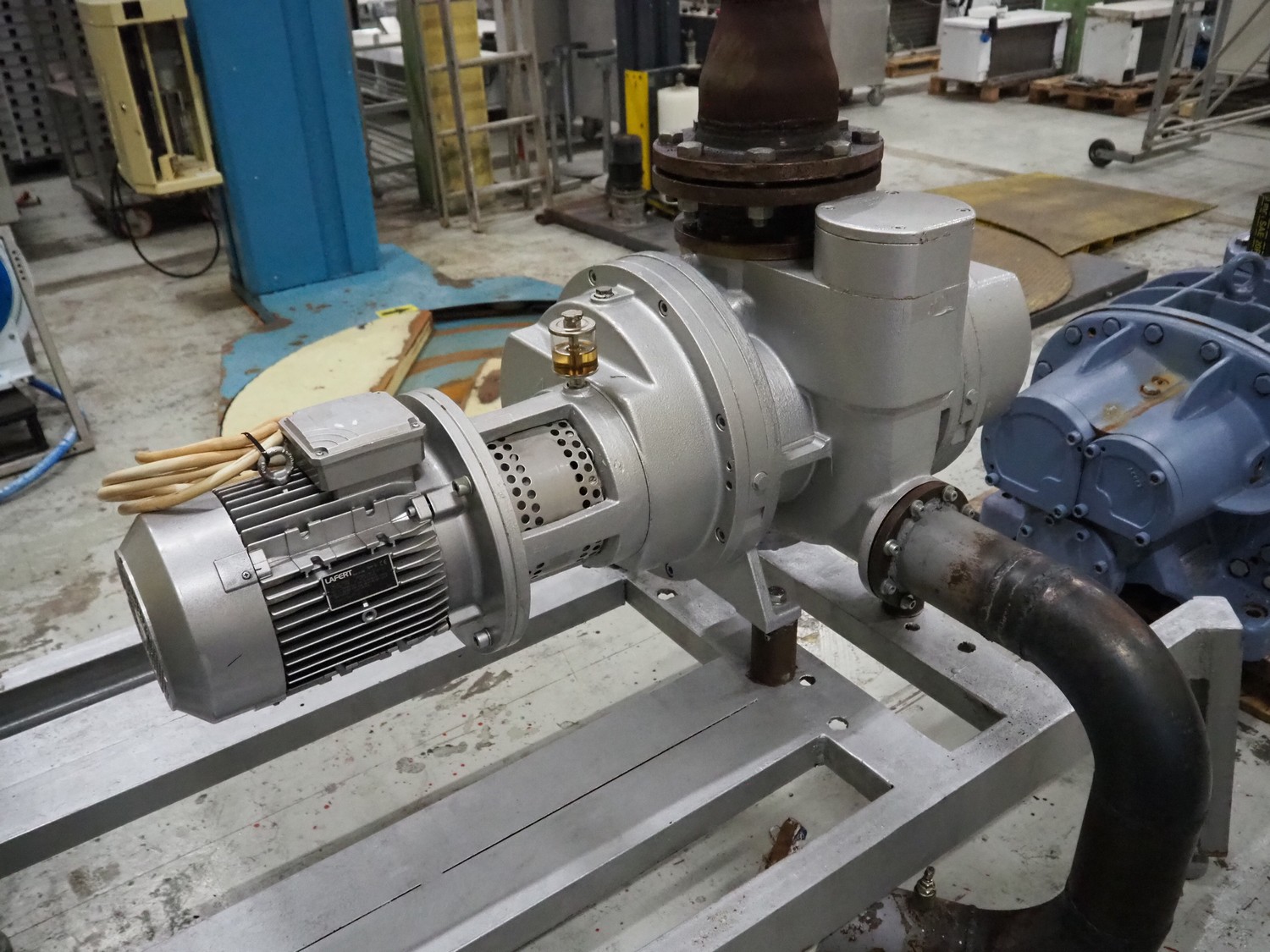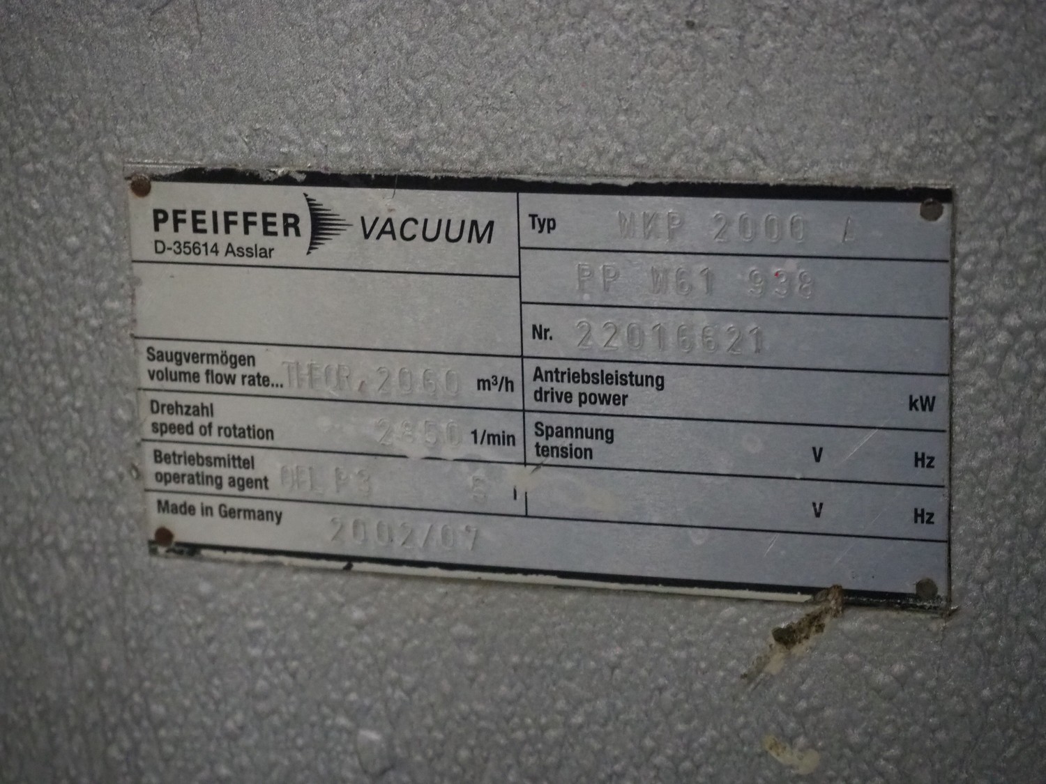Pfeiffer Vacuum roots pump, type: WKP 2000 A, number: 22016621, year of construction: 07/2002, capacity: 2060 m³ per hour, dimensions: 1750 mm x 1150 mm x 1200 mm.