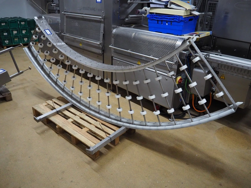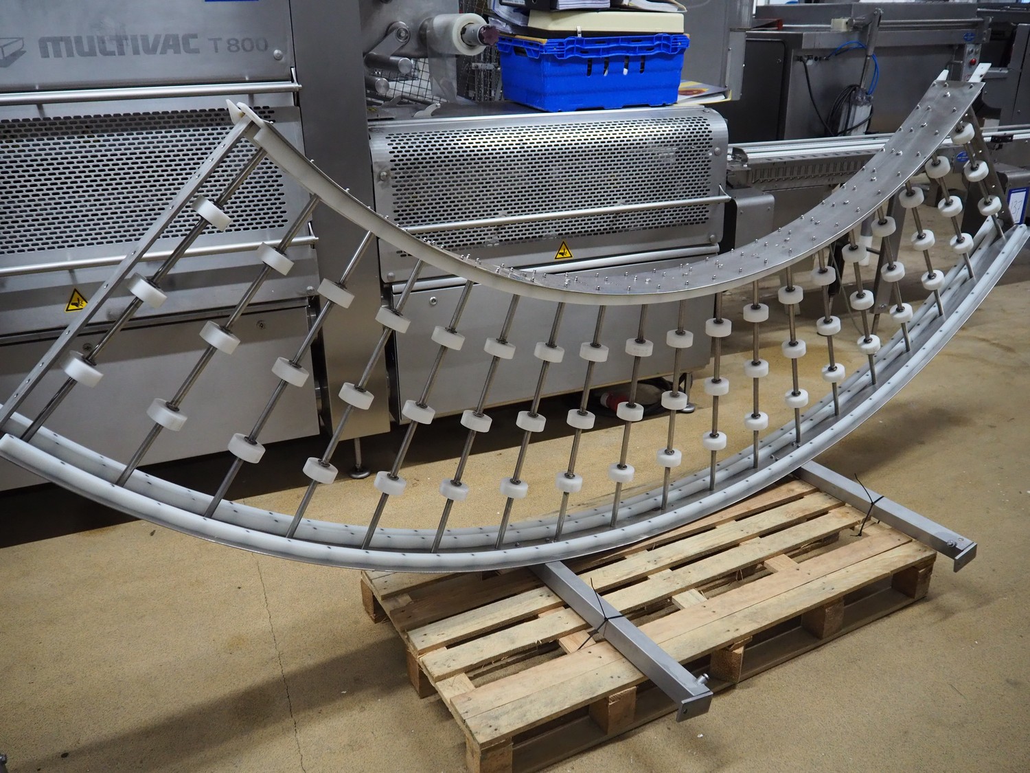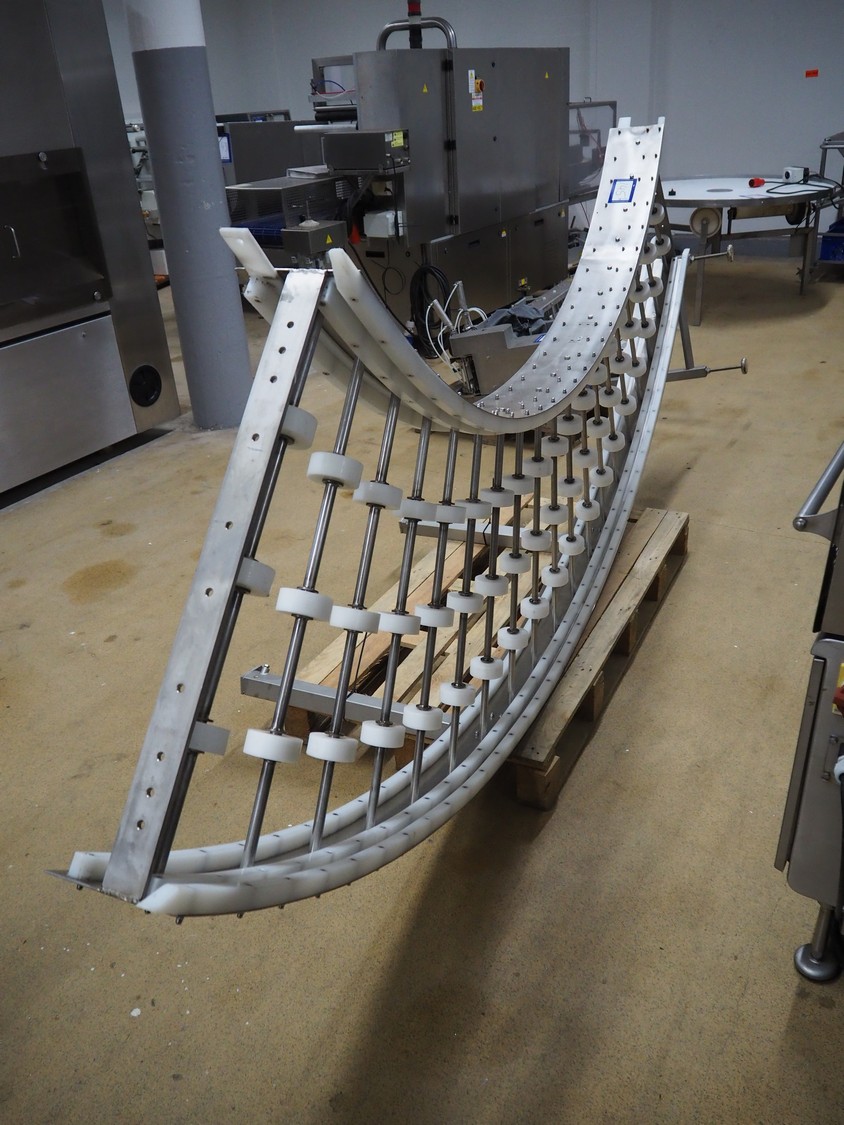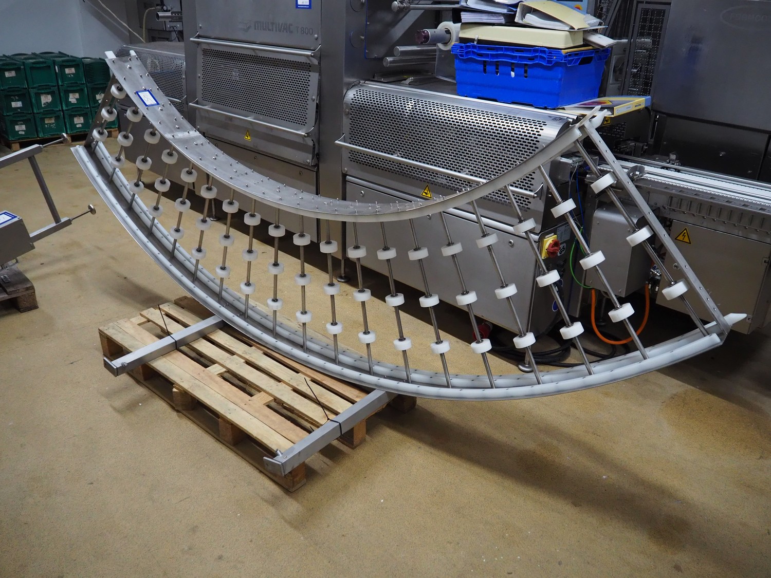 Frame for curve conveyor, approximate belt width: 650 mm, total dimensions: 3200 mm x 800 mm x 1400 mm. Missing belt.