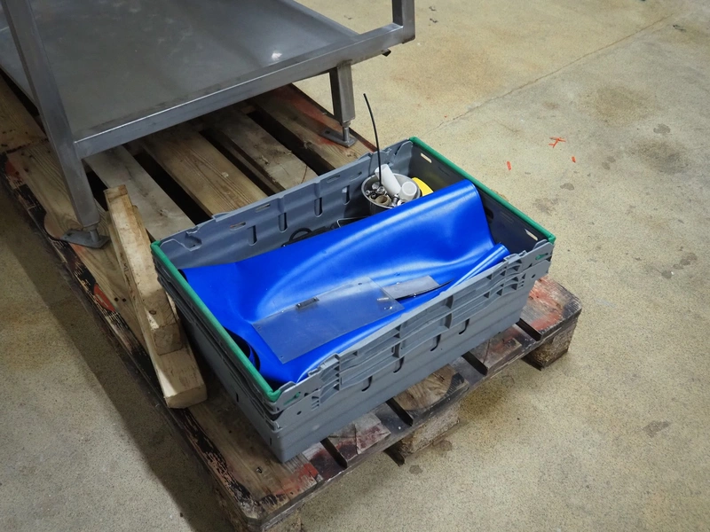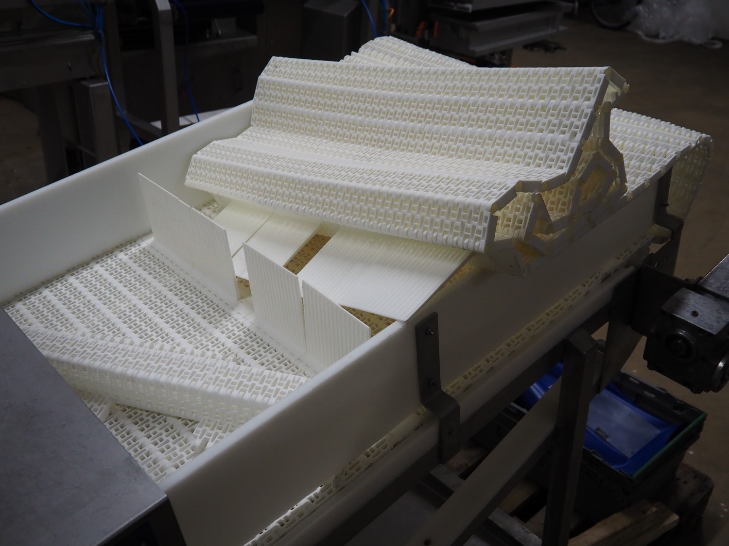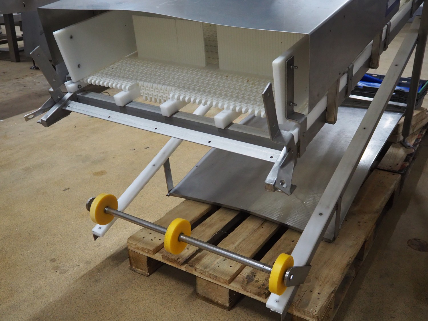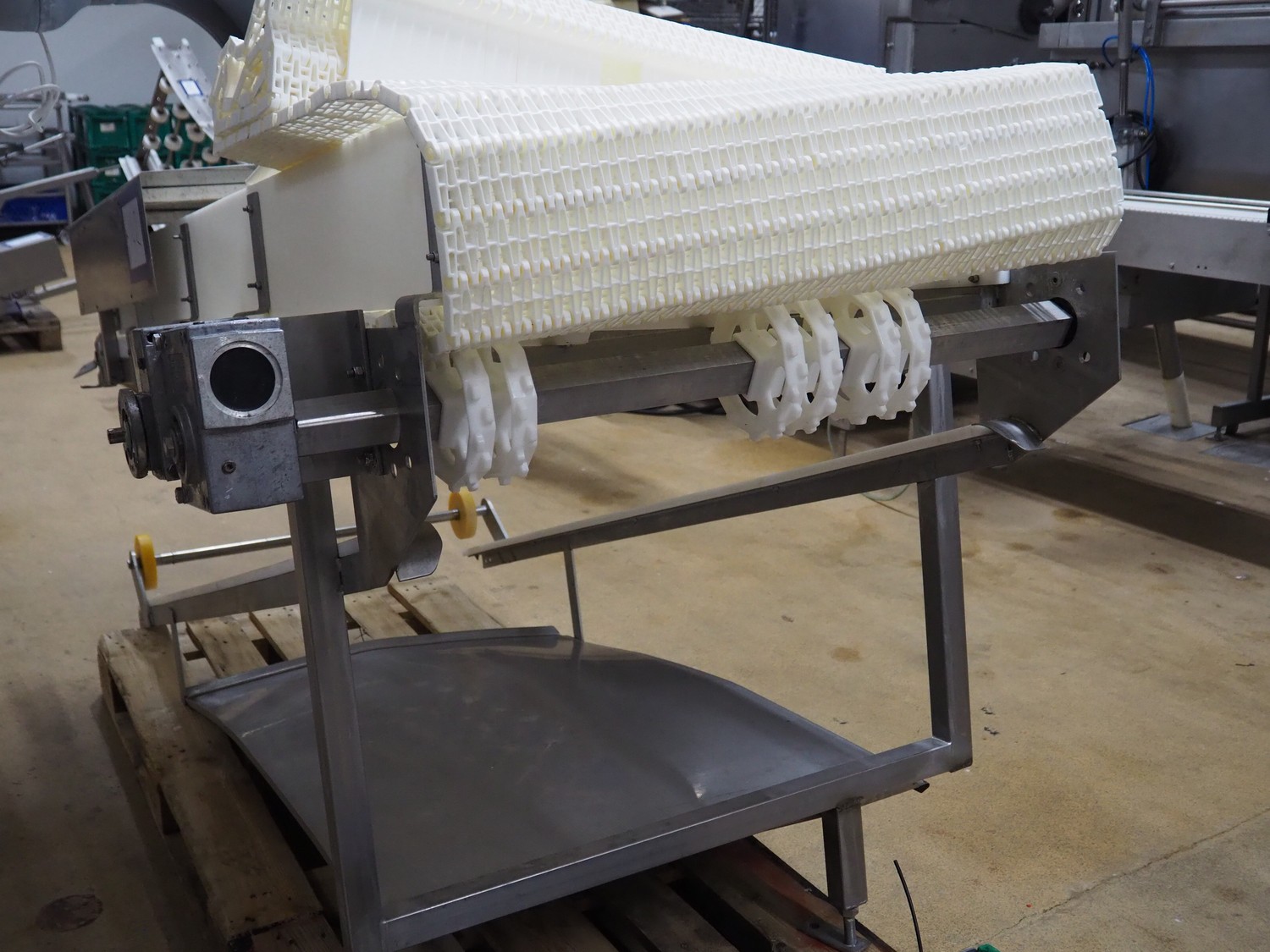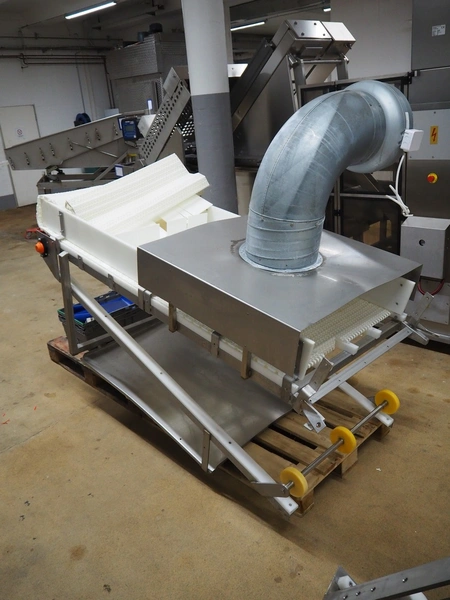 Elevating belt with blower, plastic belt with dividers, belt width: 720 mm, divider height: 150 mm, distance between dividers: 510 mm, elevating height: 1150 mm, total dimensions: 2100 mm x 950 mm x 1600 mm. Missing motor. Technical condition unknown.