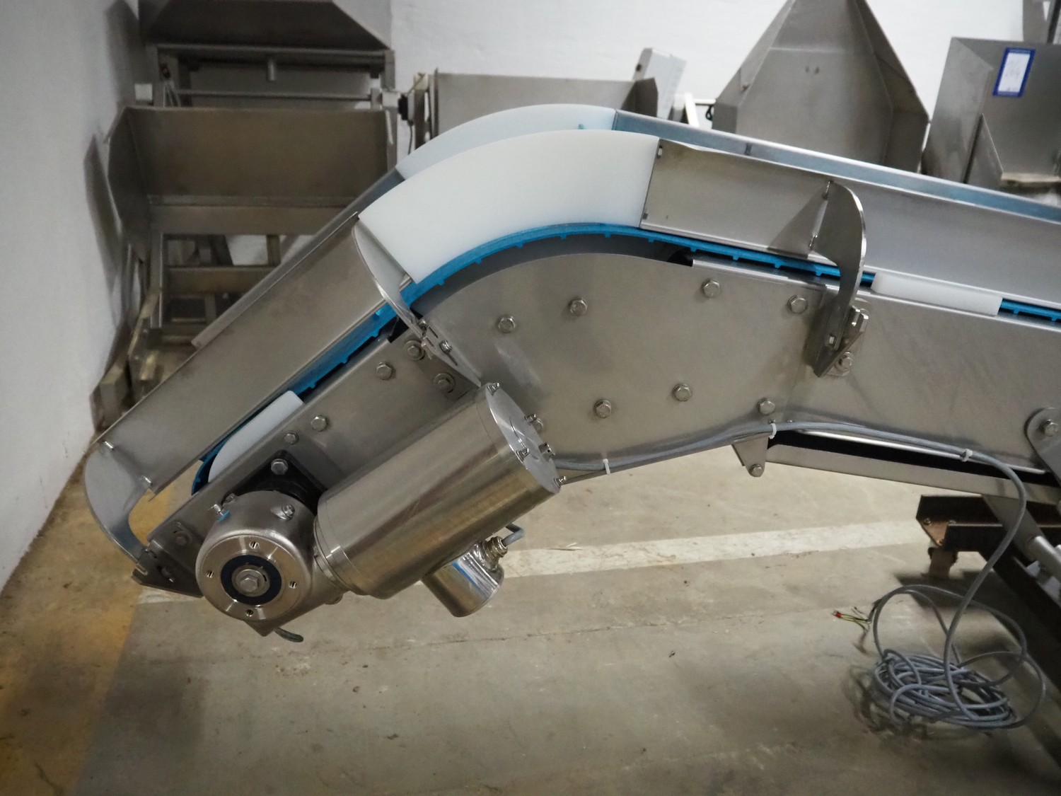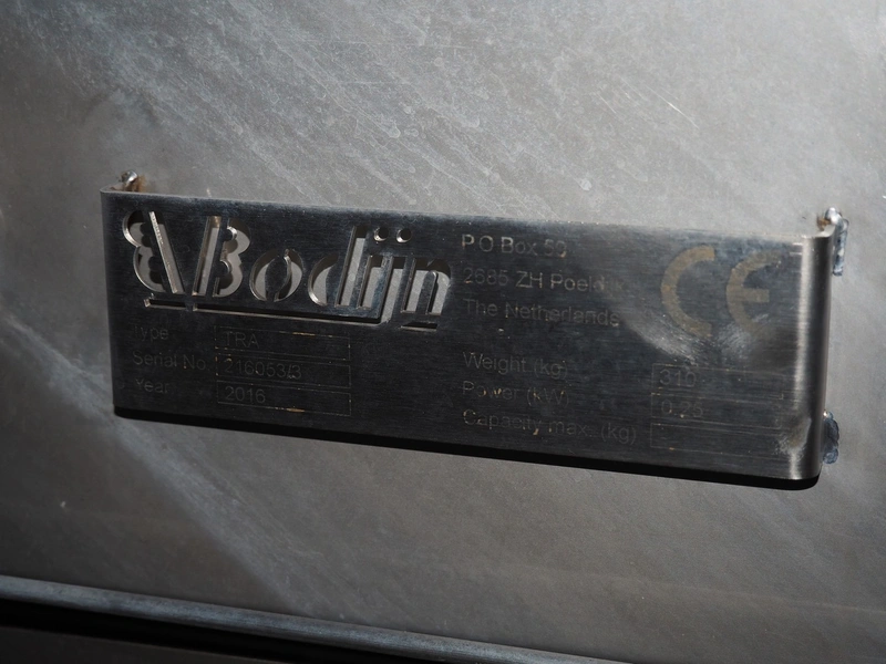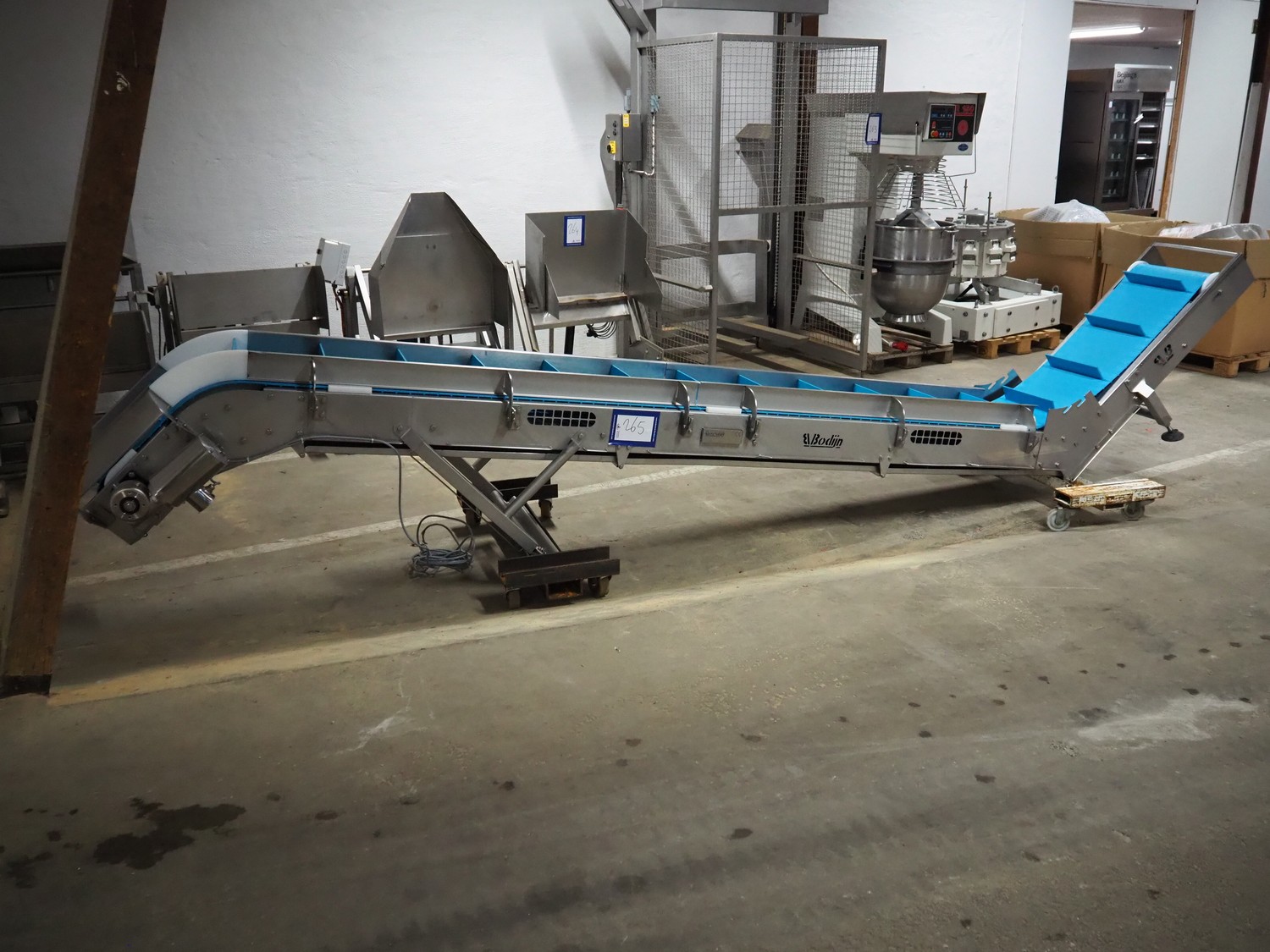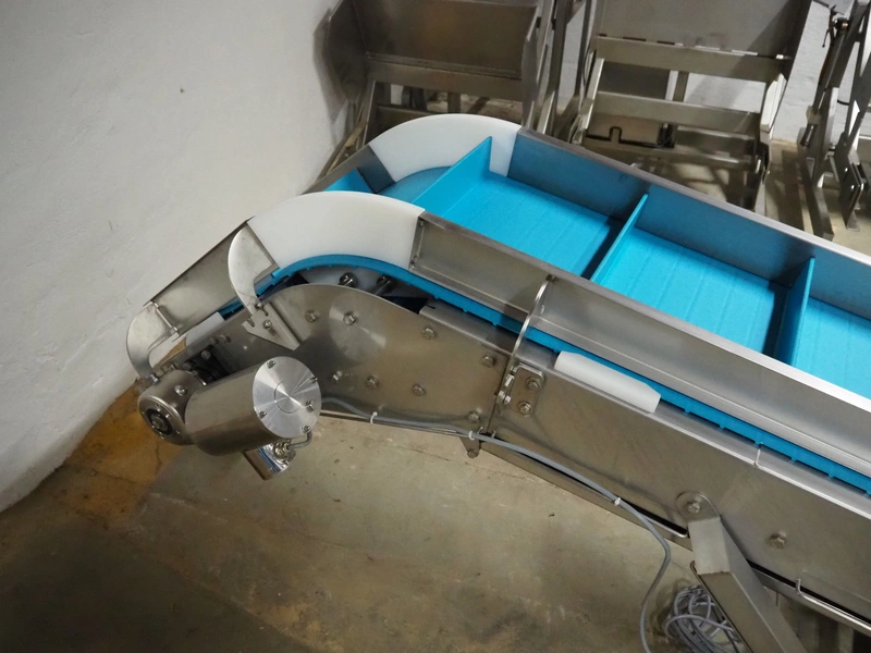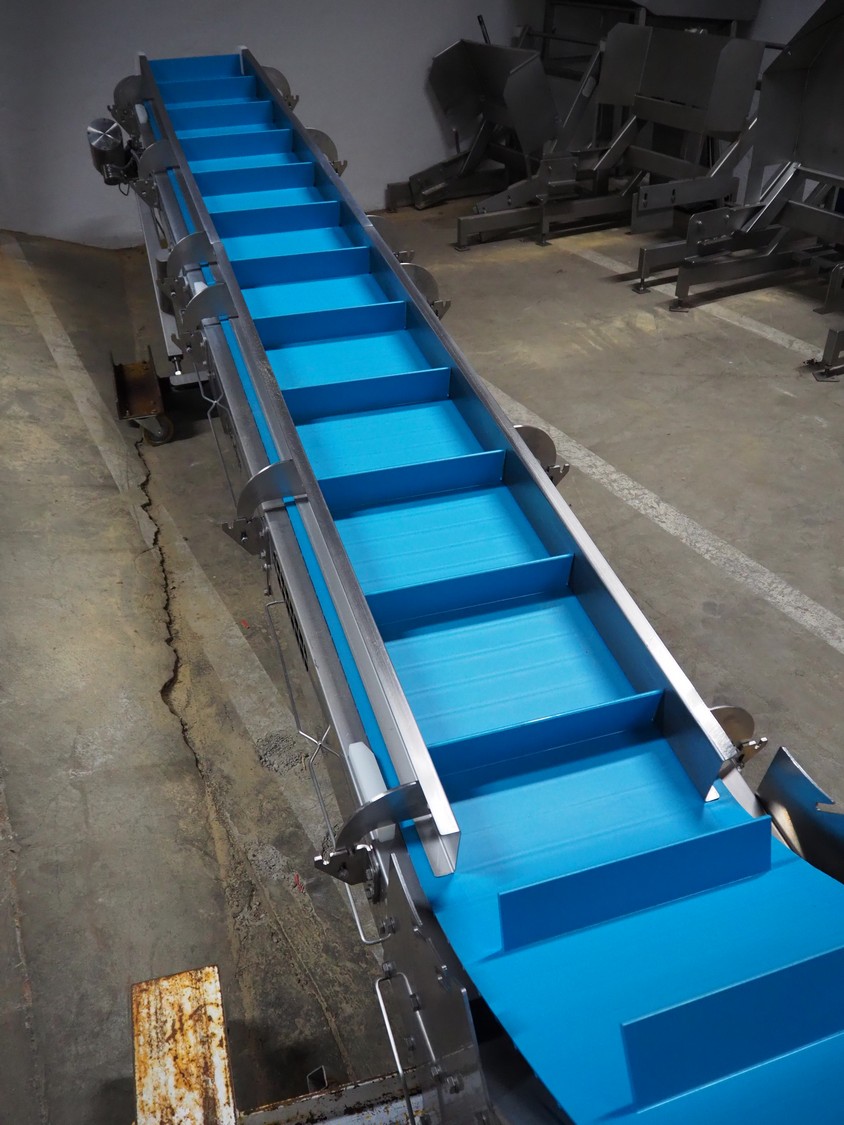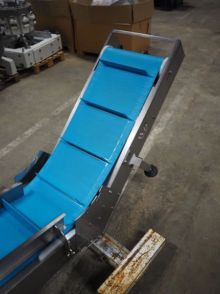 Bodijn elevating belt, type: TRA, serial number: 216053/3, year of construction: 2016, 0.25 kW, weight: 310 kg, plastic belt with dividers, belt width: 450 mm, divider height: 75 mm, distance between dividers: 300 mm, total dimensions: 3000 mm x 700 mm x 1130 mm.