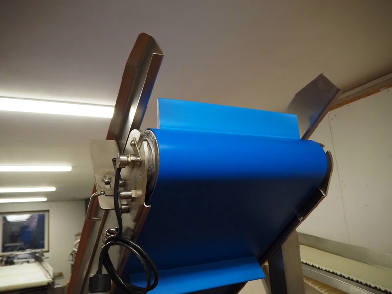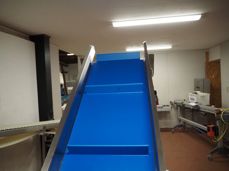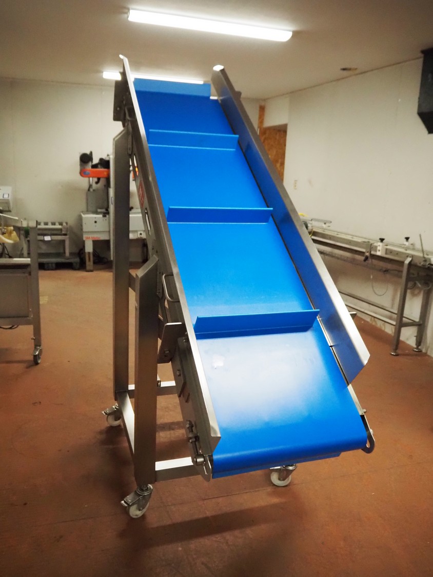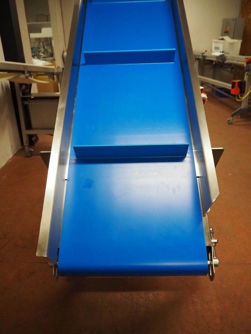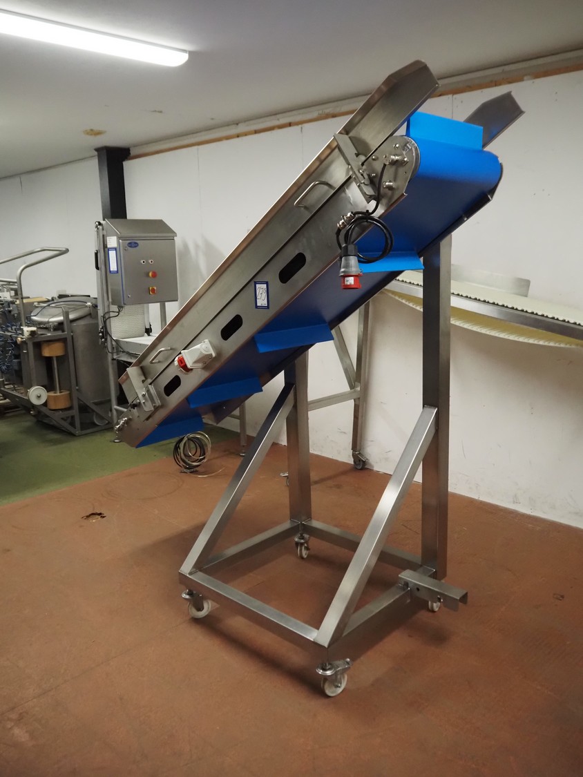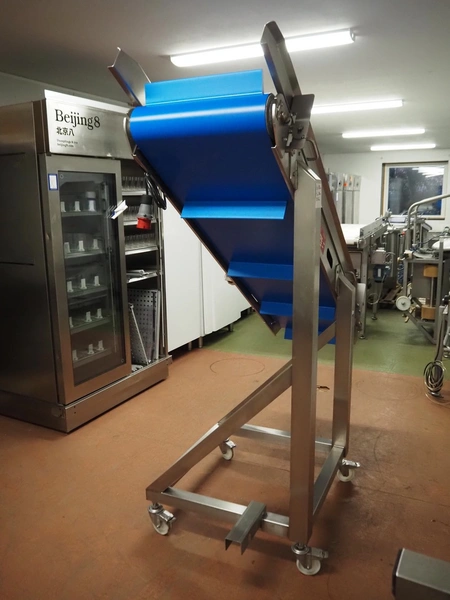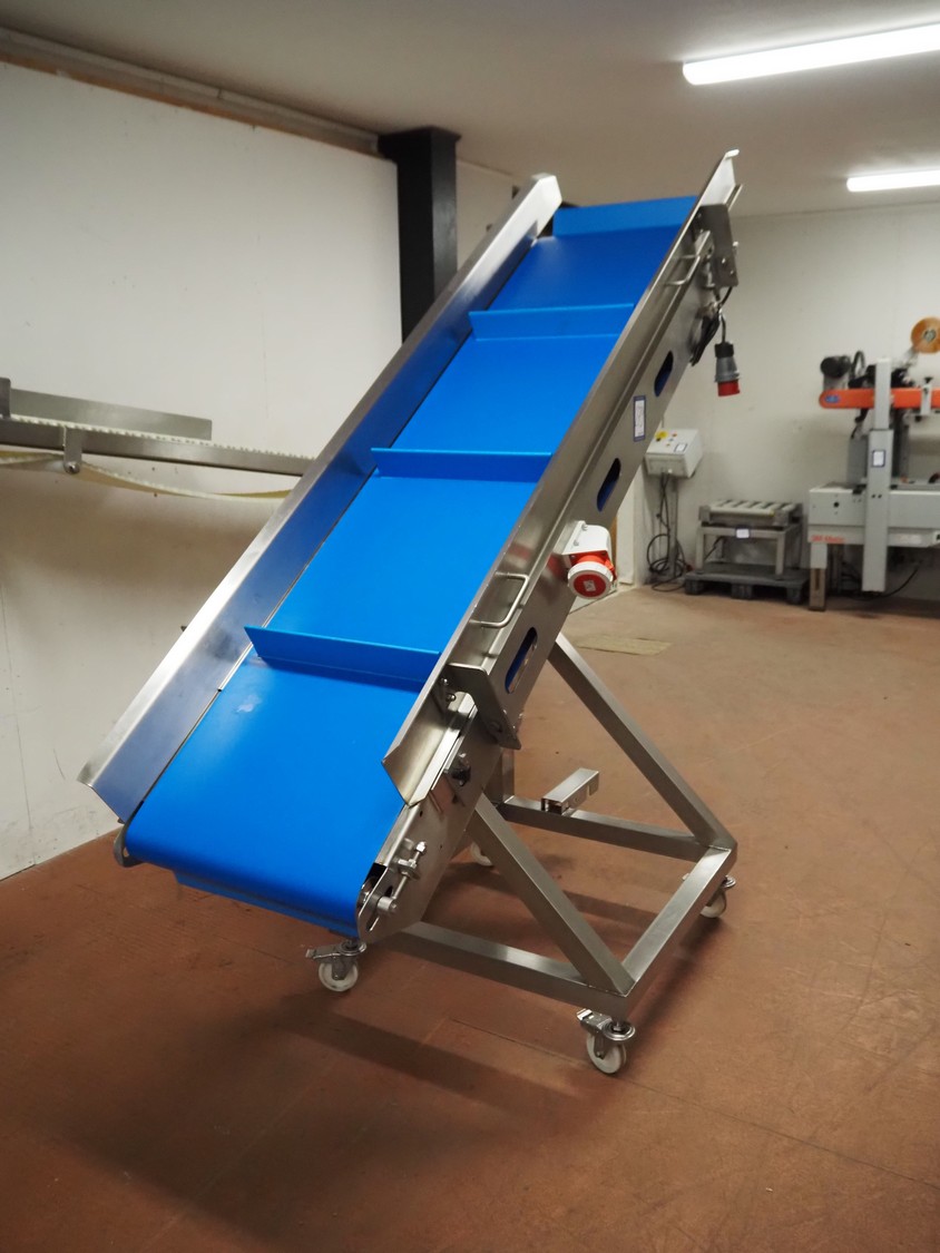 Holac mobile elevating belt, type: GFA-5-2000, serial number: 006-50-108, year of construction: 2017, 400 V, 50 Hz, 2 A, 0.55 kW, plastic belt with dividers, belt width: 490 mm, divider height: 75 mm, distance between dividers: 540 mm, elevating height: 1850 mm, total dimensions: 2000 mm x 800 mm x 2050 mm.