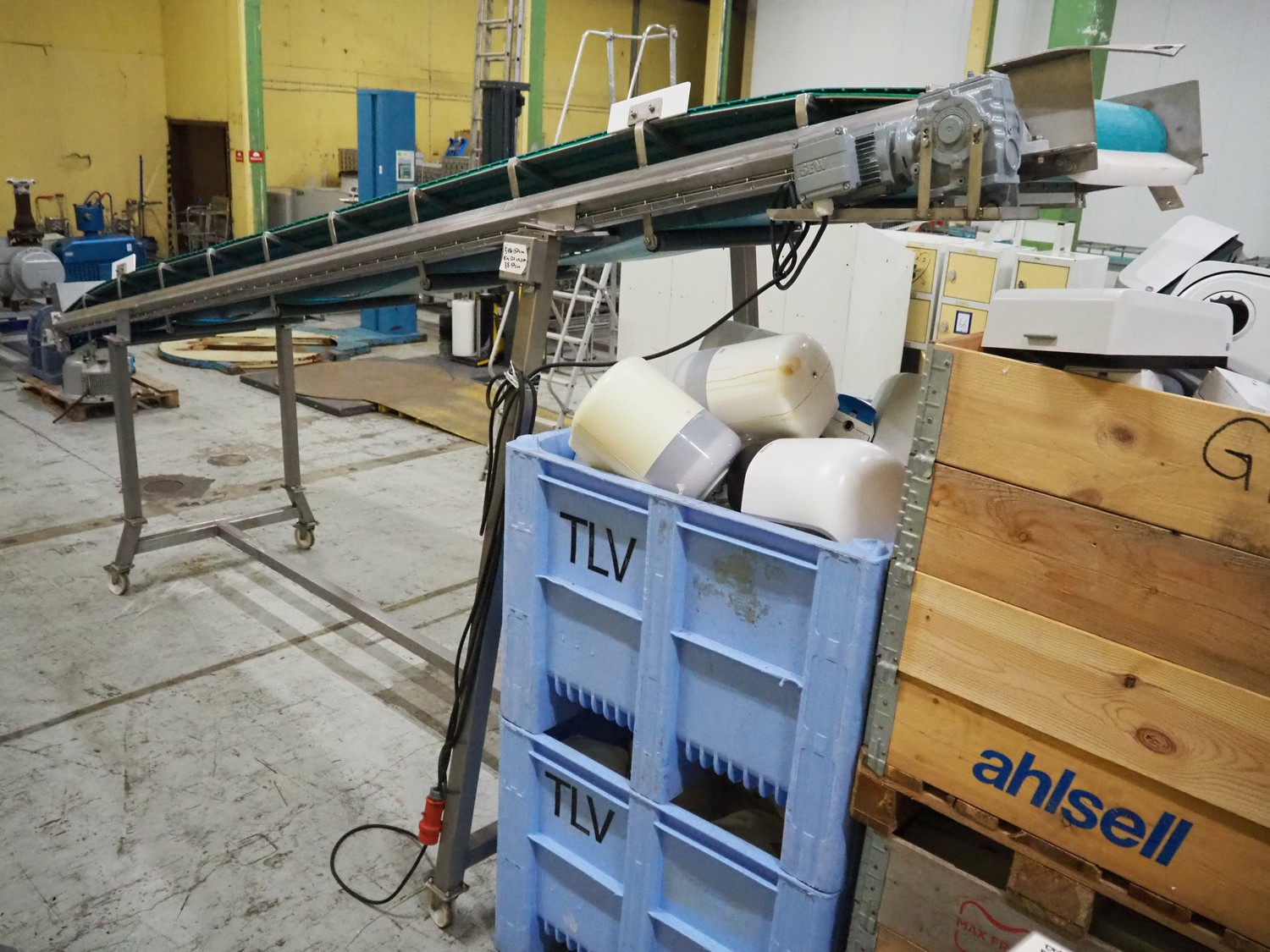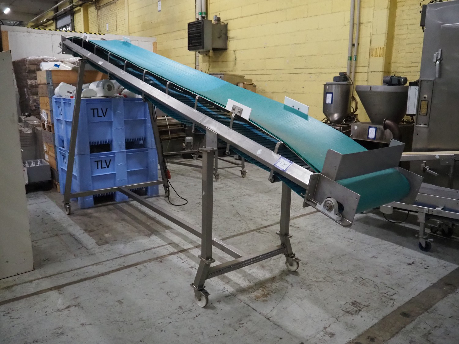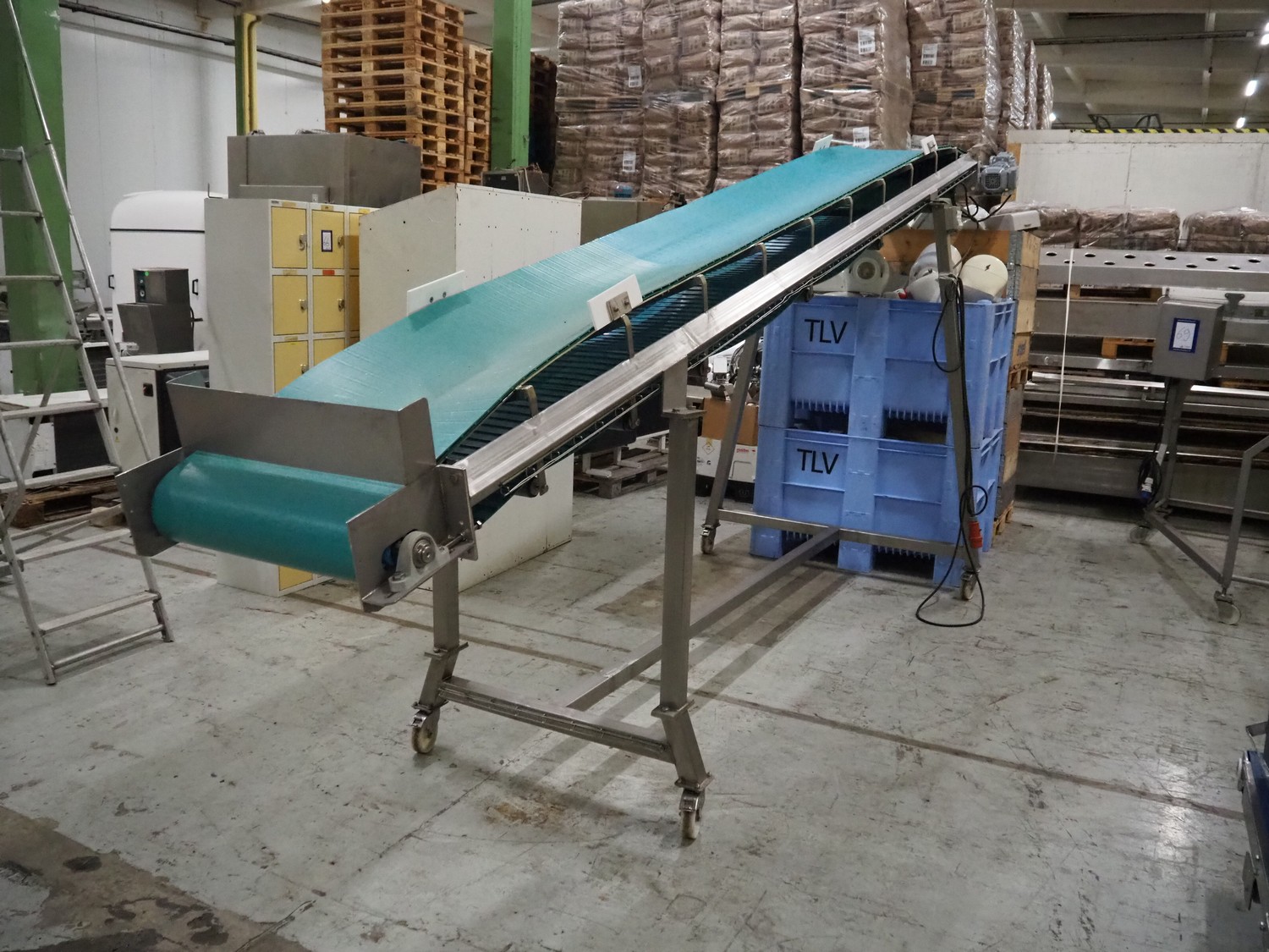 Mobile elevating belt, s/s frame, plastic belt, belt width: 590 mm, elevating height: 2300 mm, total dimensions: 5400 mm x 2450 mm x 1550 mm.