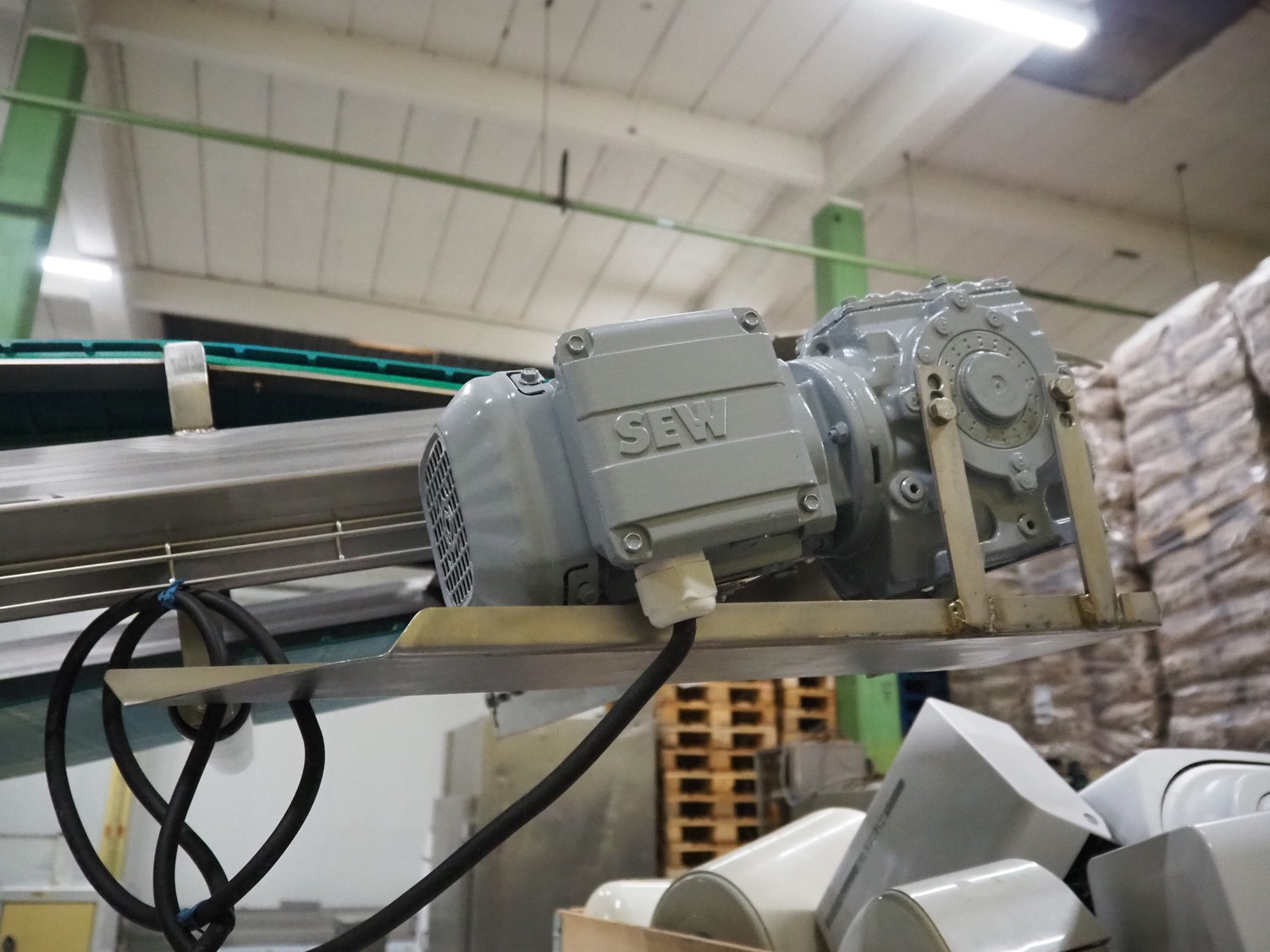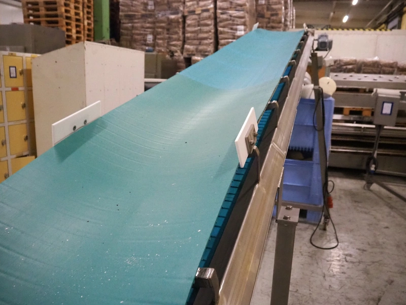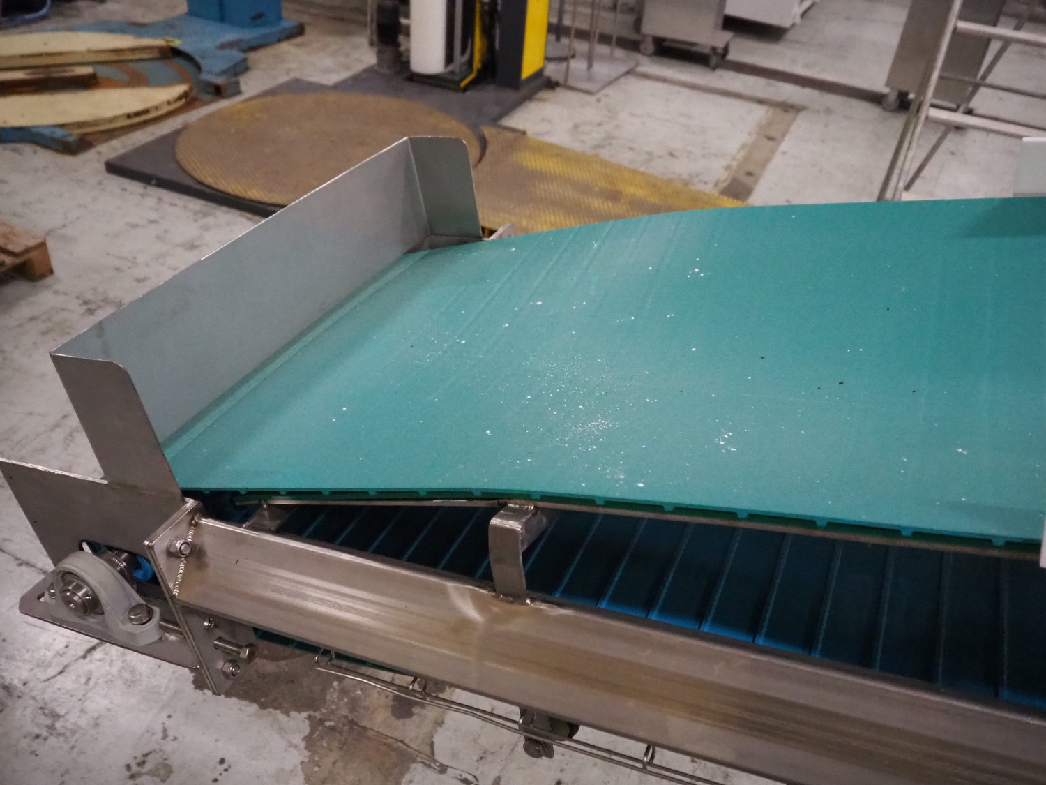 Mobile elevating belt, s/s frame, plastic belt, belt width: 590 mm, elevating height: 2300 mm, total dimensions: 5400 mm x 2450 mm x 1550 mm.