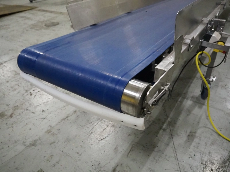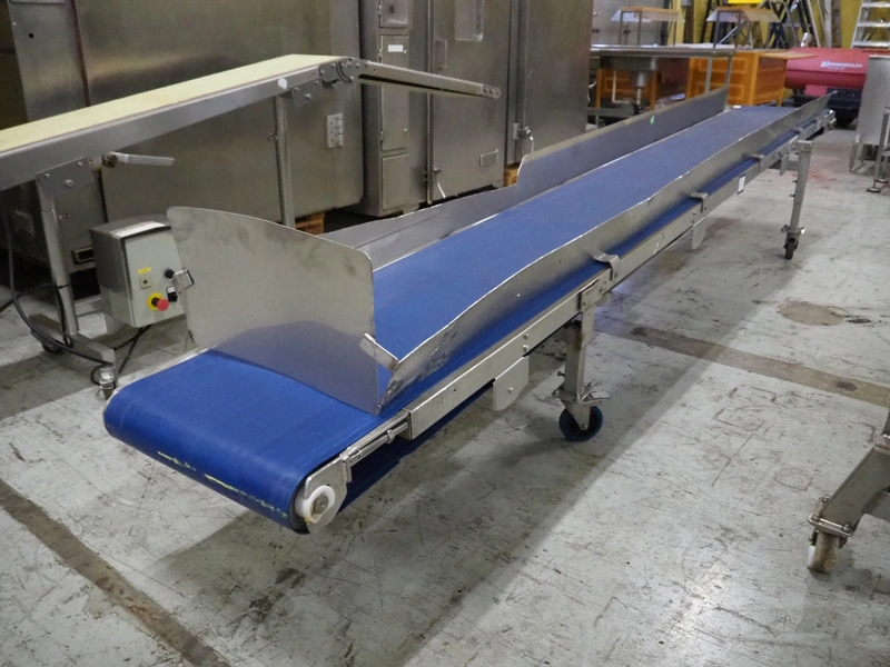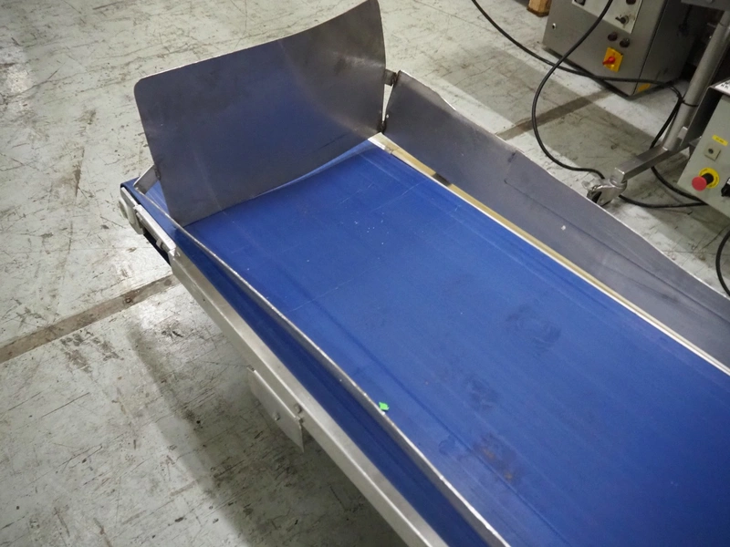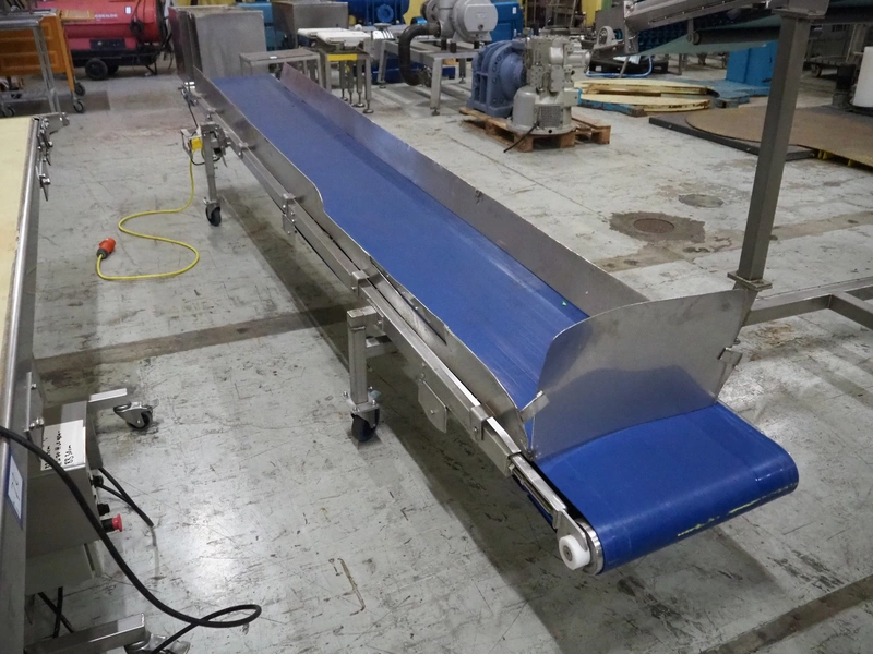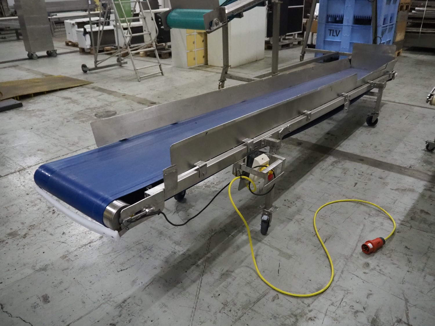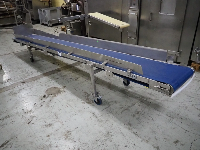 KJ Maskinfabriken A/S mobile elevating belt, type: KA69B-550B, year of construction: 1983, plastic belt, belt width: 495 mm, elevating height: 650 mm, total dimensions: 4400 mm x 880 mm x 770 mm.
