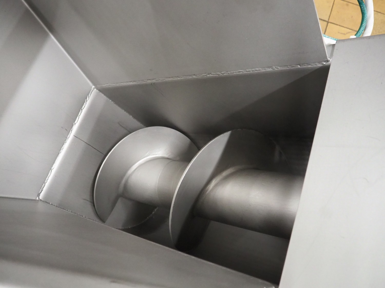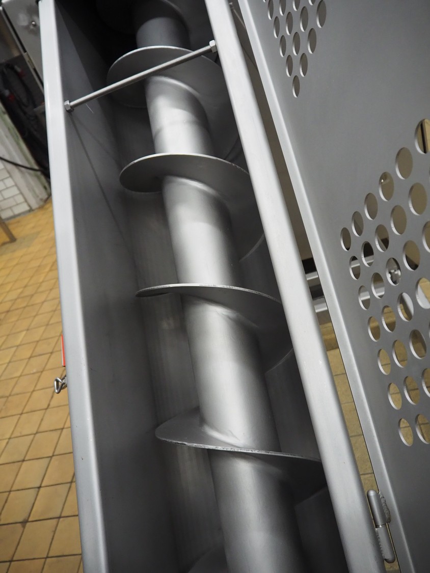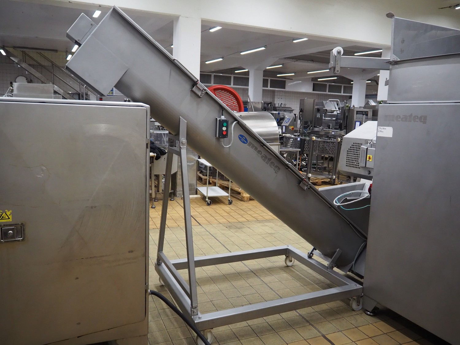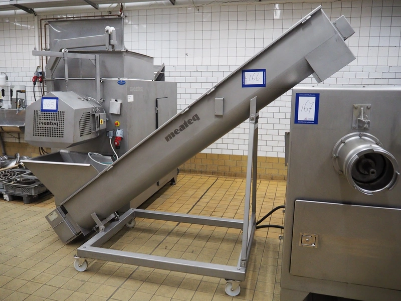 Meateq mobile elevating screw, diameter screw: 300 mm, tier: 250 mm, elevating height: 1720 mm, total dimensions: 3300 mm x 1100 mm x 2450 mm.