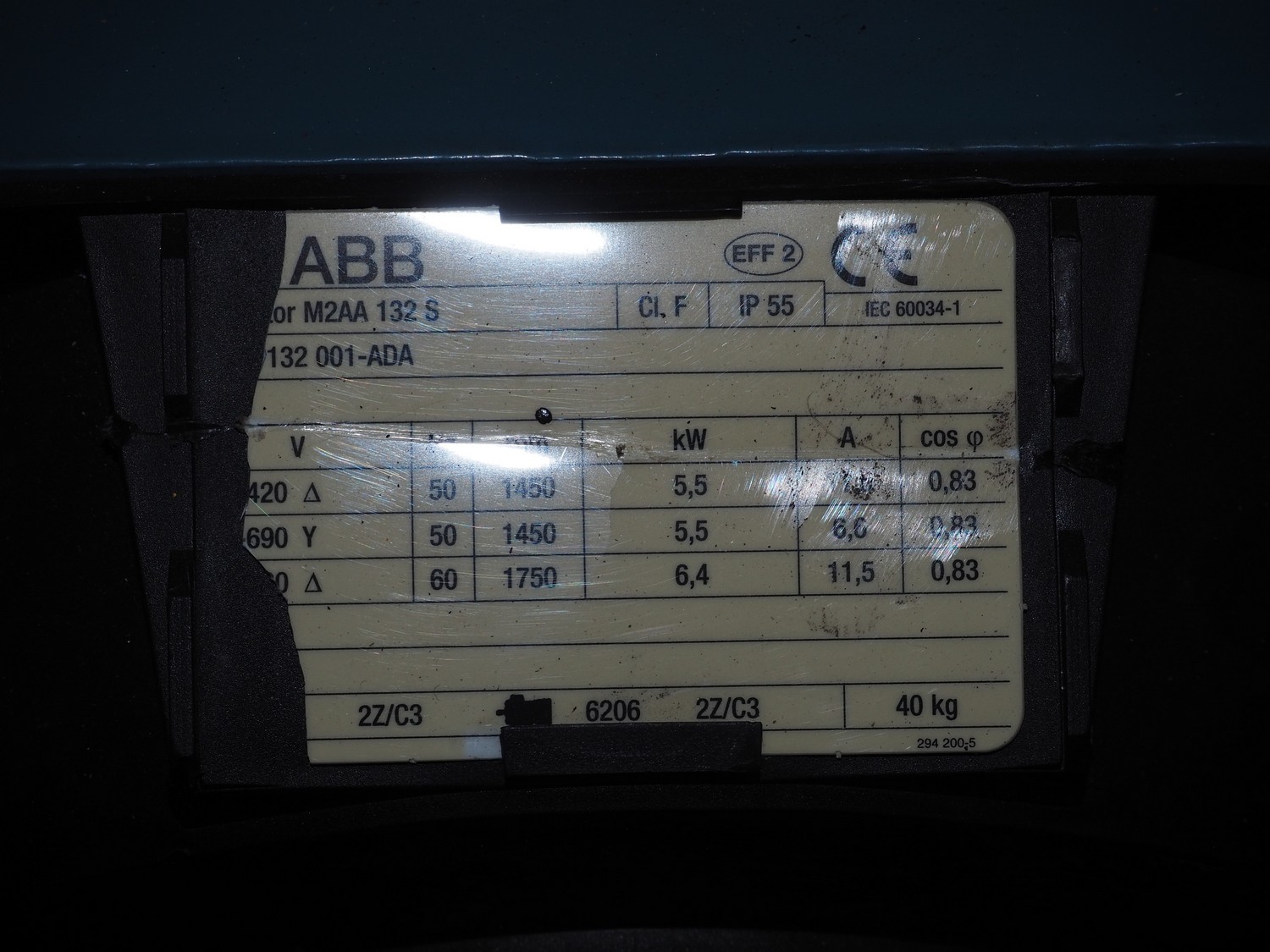 ABB motor, type: M2AA 132 S, 1450/1750 RPM, 5.5/6.4 kW, weight: 40 kg, dimensions: 500 mm x 300 mm x 300 mm.