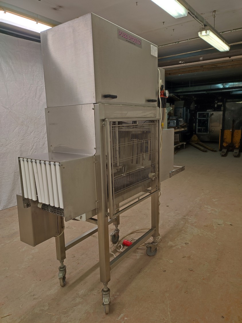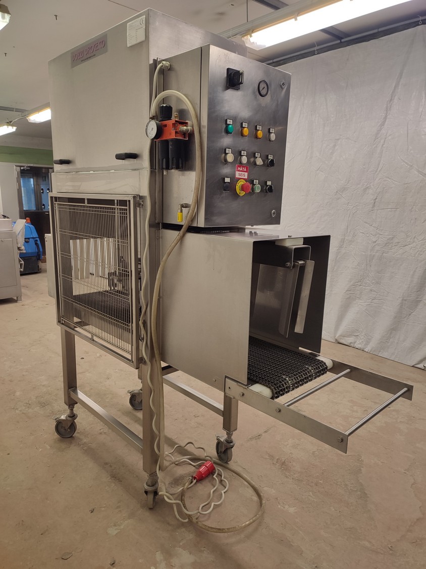 Pozzi Proge.Co S.r.l. machine for closing and pressing all types of moulds for ham, type: PRESSA STAMPI AUTOMATICA, model: PS 10LO, serial number: 008, year of construction: 2006, 400 V, 3 Ph, pressure: 6 bar, s/s mesh belt, belt width: 345 mm, dimensions: 2100 mm x 800 mm x 2120 mm.