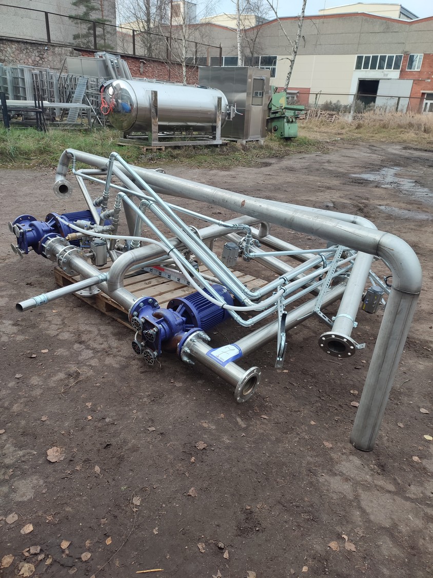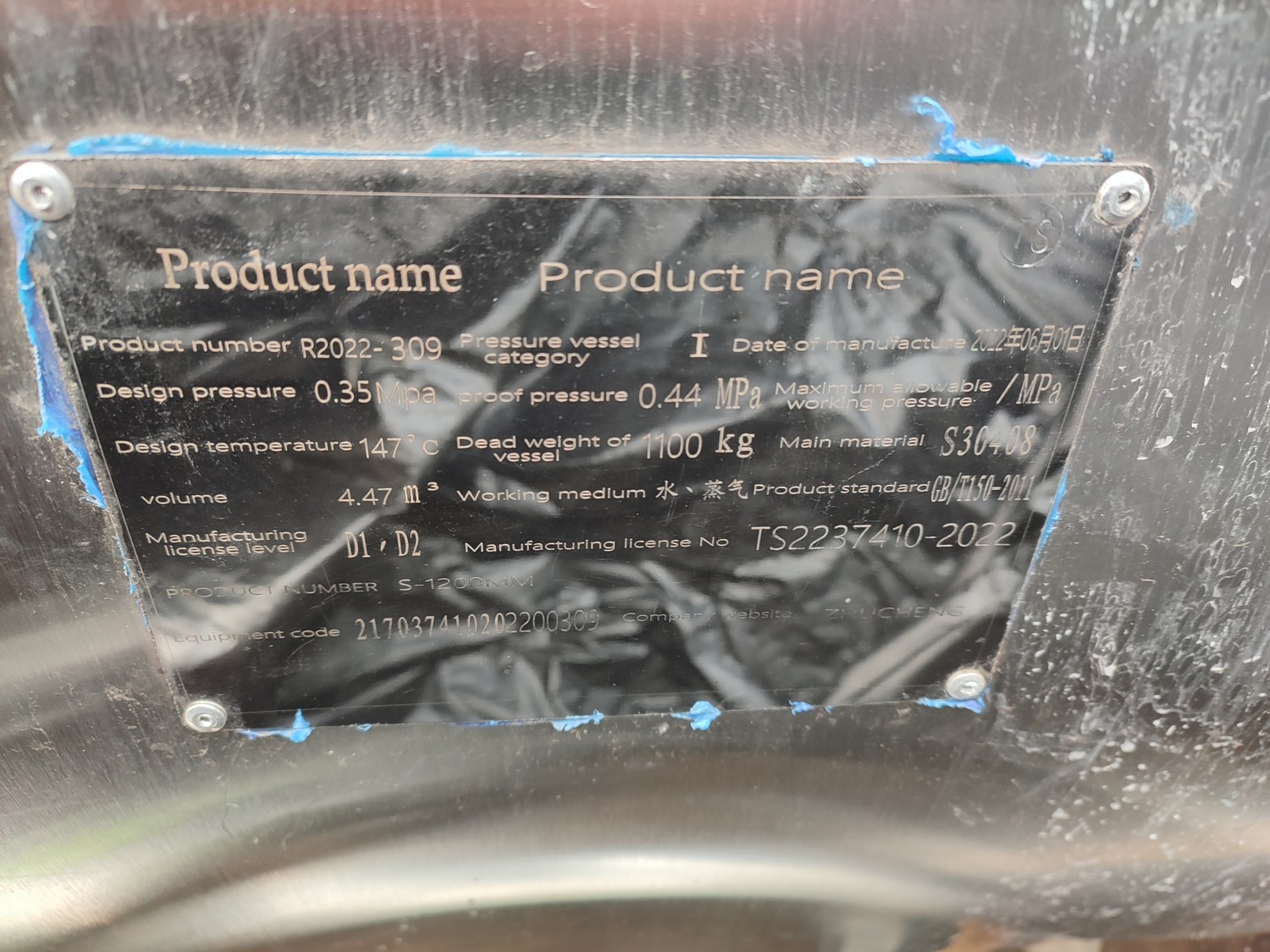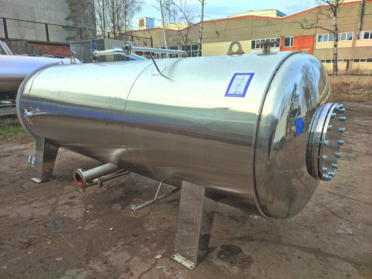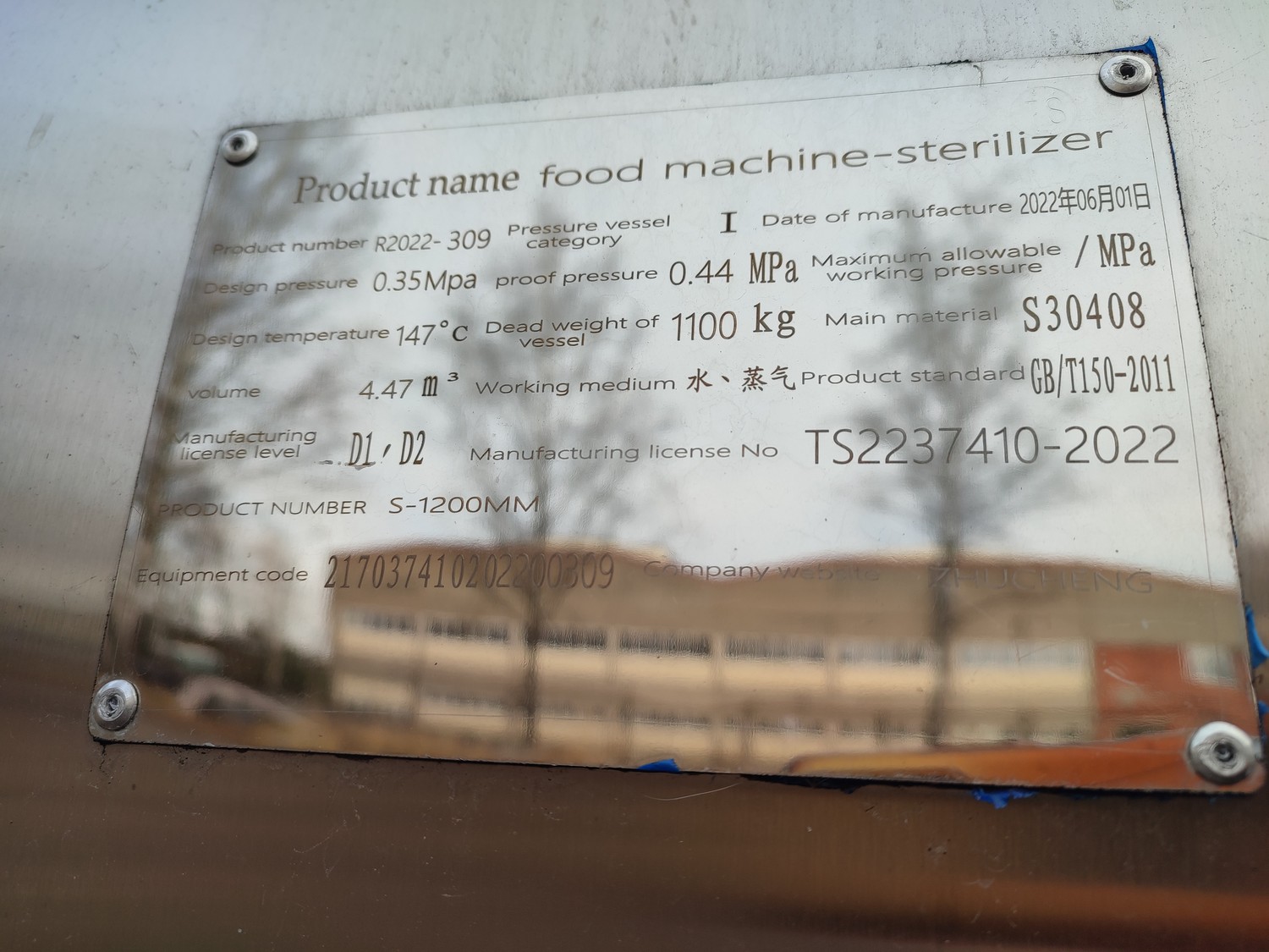 Zhucheng Tianshun Machinery Co., Ltd. autoclave, number: R2022-309, year of construction: 01.06.2022, pressure: 0.35 Mpa, temperature: 147°C, volume: 4,47 m³, weight: 1100 kg, top tank dimensions: 4200 mm x 1700 mm x 1950 mm, bottom tank dimensions: 4300 mm x 1600 mm x 1800 mm, s/s tank dimensions: 1800 mm x 1800 mm x 3000 mm. Including pallet with parts, dimensions: 2700 mm x 3000 mm x 1000 mm.