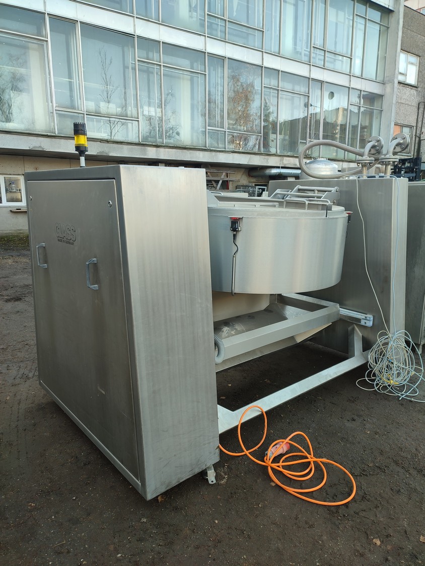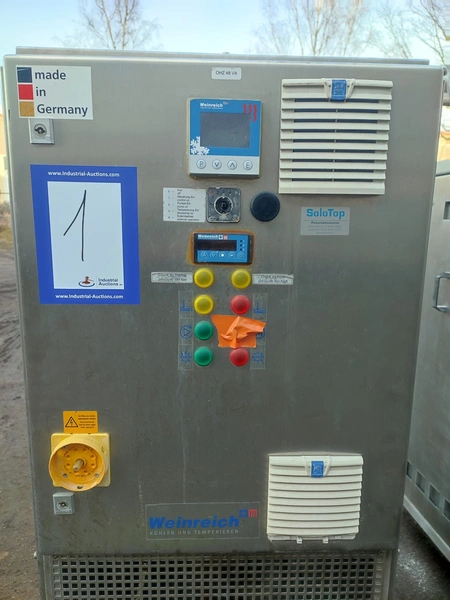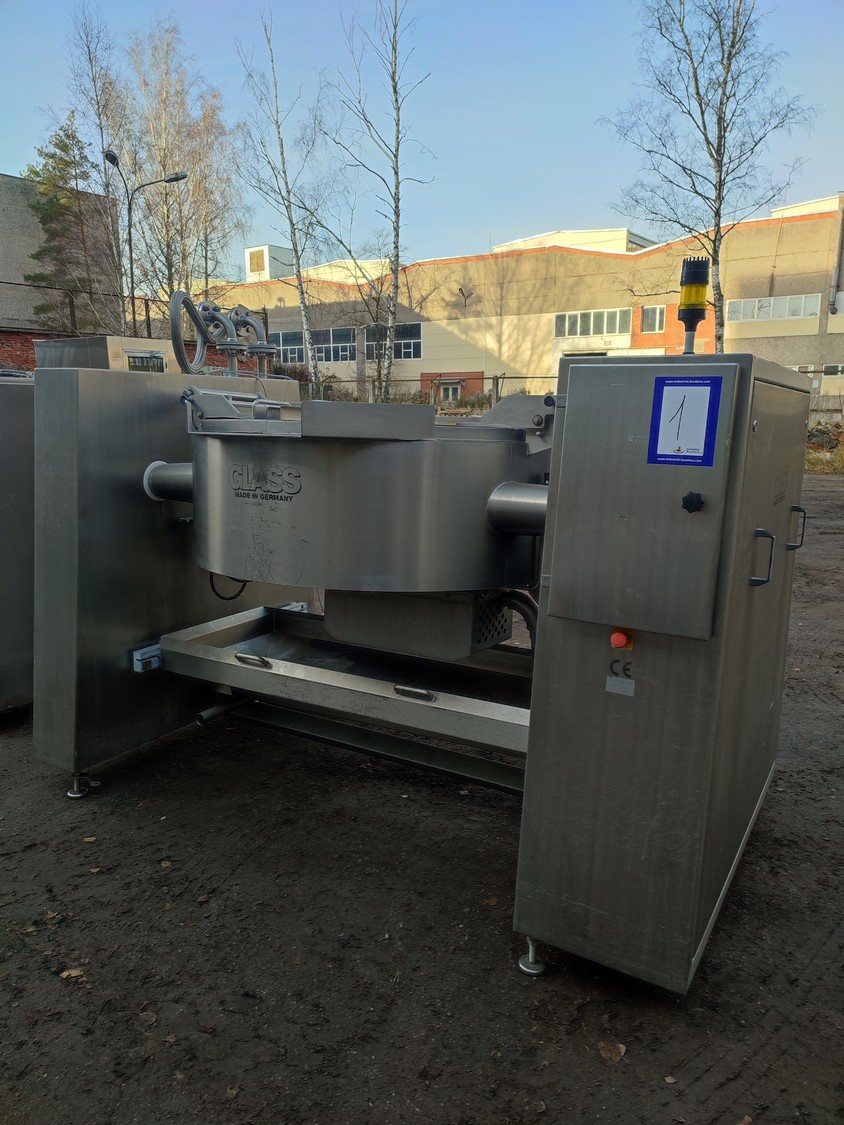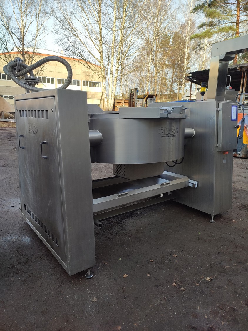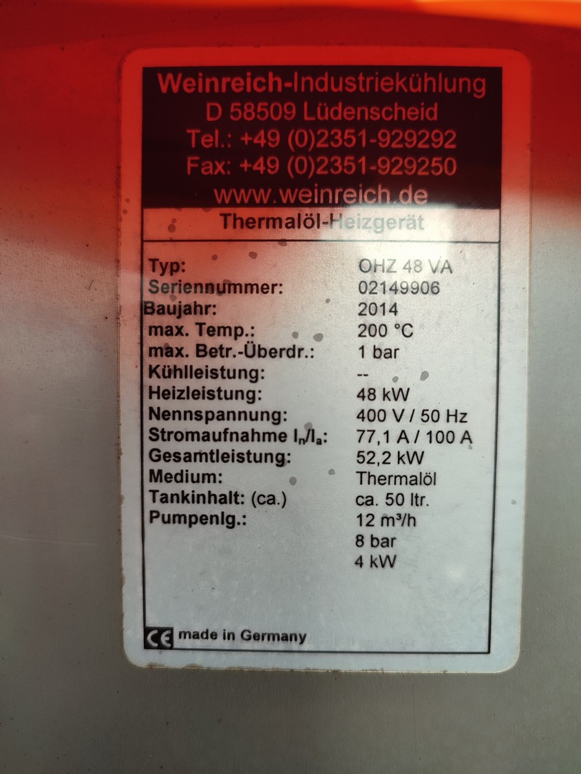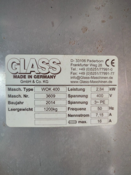 Glass GmbH & Co. KG tiltable frying pan with agitator, type: WOK 400, machine number: 3609, year of construction: 2014, 400 V, 50 Hz, 3 Ph, 7.15 A, 2.84 kW, weight: 1200 kg, dimensions: 2700 mm x 1500 mm x 2000 mm. Including Weinreich-Industriekuhlung thermal oil heater, type: OHZ 48 VA, serial number: 02149906, year of construction: 2014, 400 V, 50 Hz, 77,1/100 A, 52.2 kW. total dimensions: 620 mm x 1800 mm x 1600 mm.