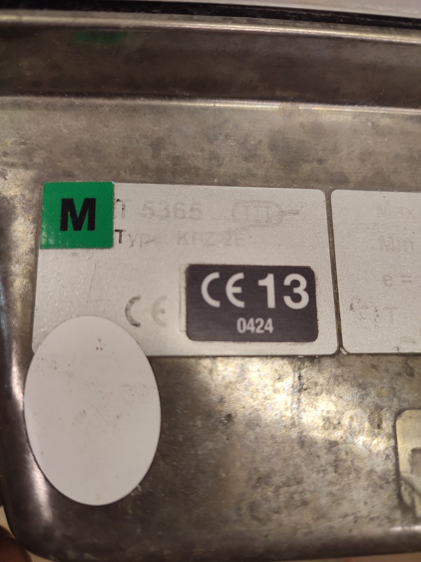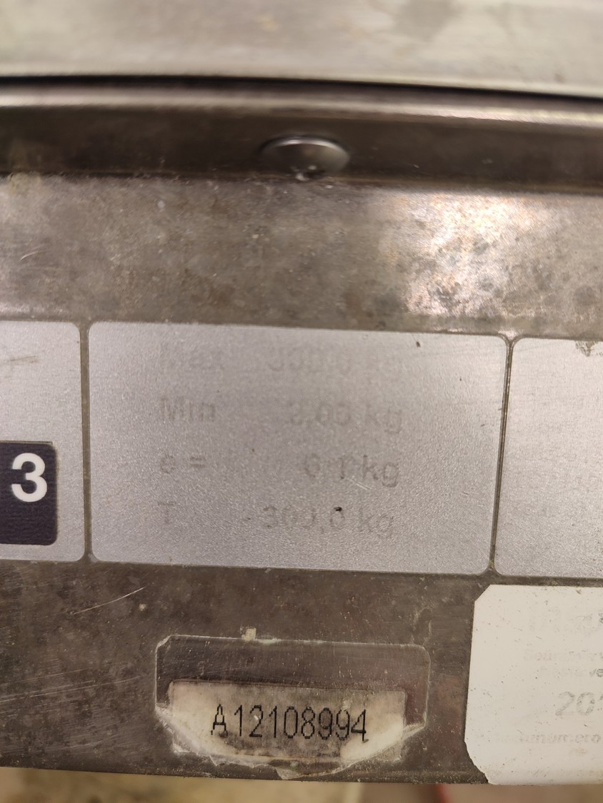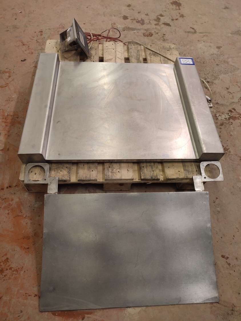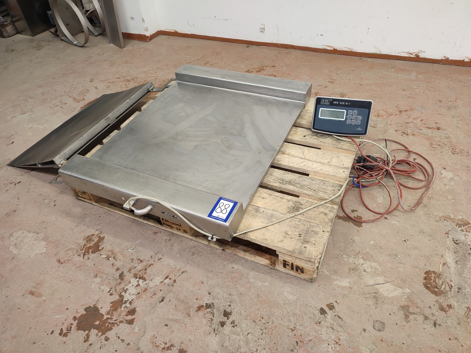S/s floor weighing scale with K-PZ Waagen indicator, type: KPZ 52E-9-1, number: A12108994, maximum weight: 300 kg, minimum weight: 2 kg, e=: 0.1 kg, T=- 300 kg, dimensions: 800 mm x 1100 mm x 100 mm. Including ramp.