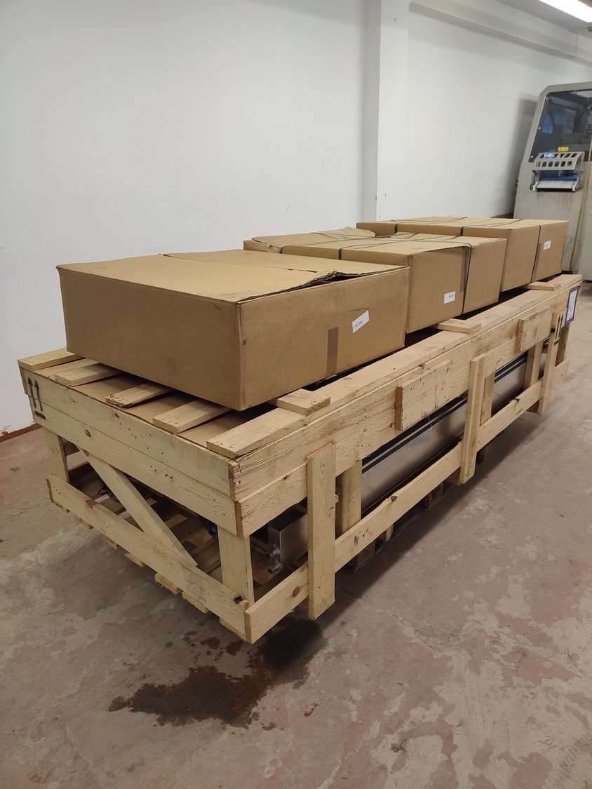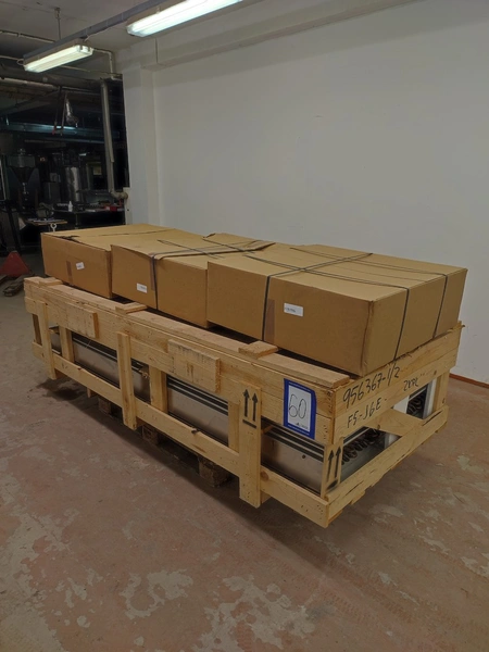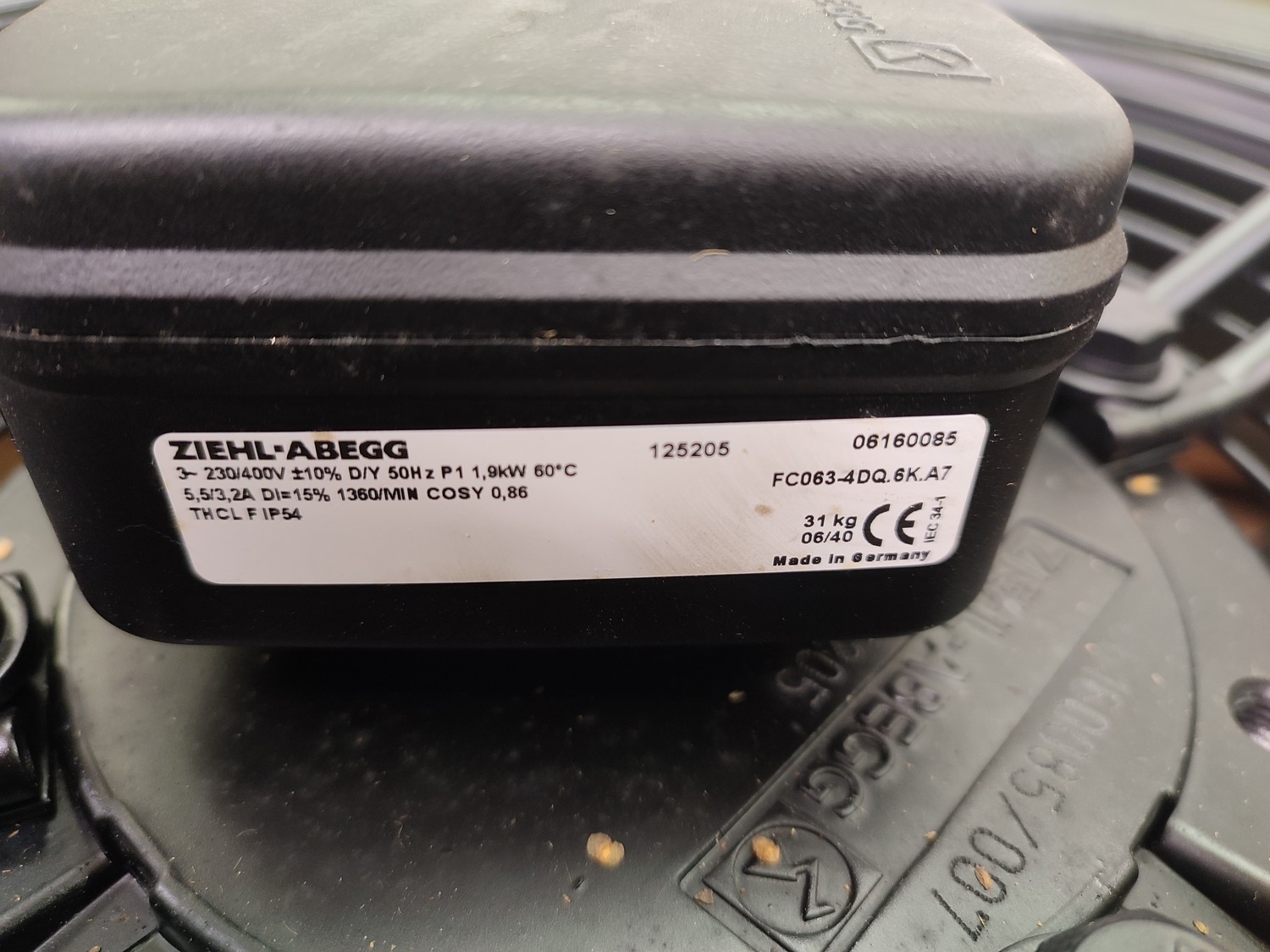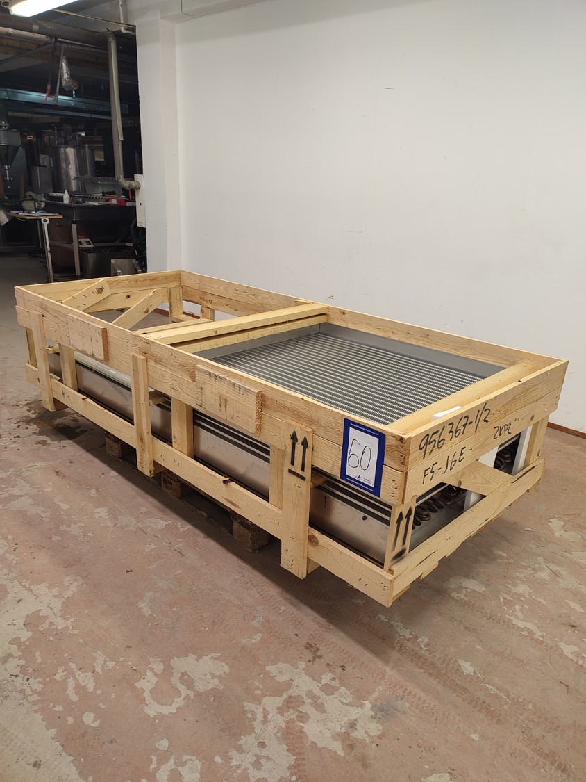 2 Fincoil plate heat exchangers and 3 Ziehl-Abegg fans, plate heat exchangers type: F5-JGE-1150-945-2-7-032L4 / F5-JGE-2100-945-2-7-040L6, year of construction: 9/2006, pressure: 10 bar, max. temperature: 150°C, volume: 8 / 14 L, weight: 26 / 42 kg, dimensions: (1x) 1270 mm x 1000 mm x 240 mm, (1x) 2370 mm x 1000 mm x 240 mm, fans type: FC063-4DQ.6K.A7, 230/400 V, 50 Hz, 1.9 kW, 5.5/3.2 A, weight: 31 kg, dimensions: (3x) 800 mm x 800 mm x 200 mm, total dimensions: 2600 mm x 1100 mm x 960 mm.