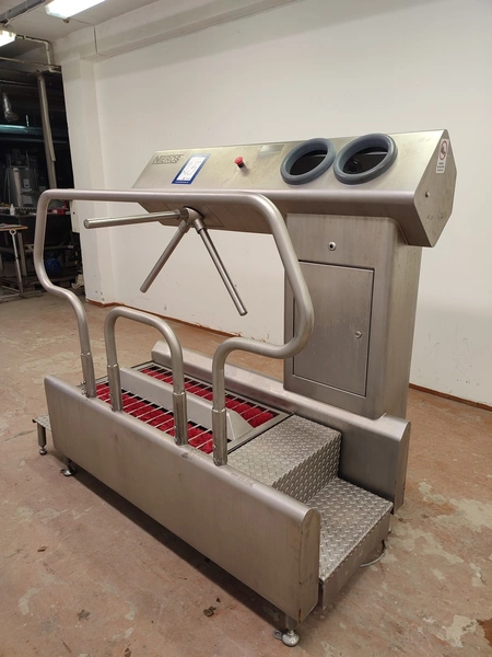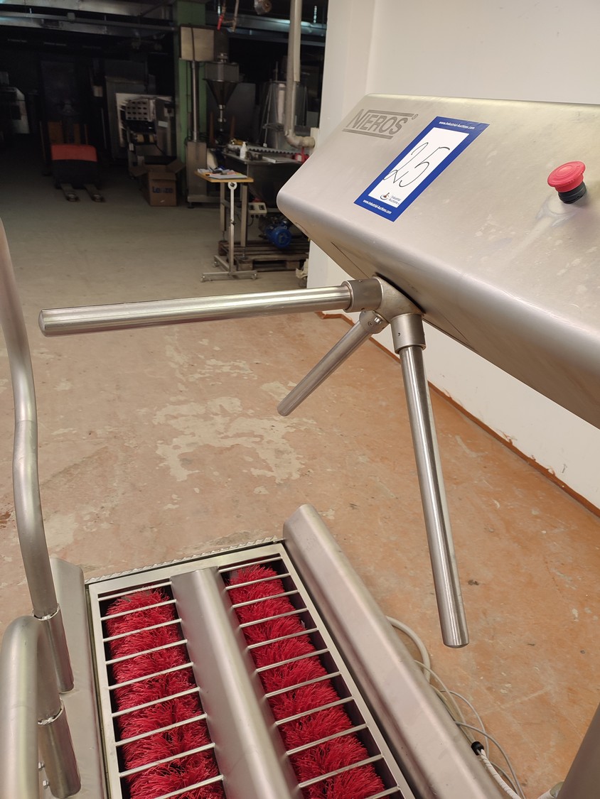 Nieros hygiene station with sole cleaner, tourniquet and hand disinfection, type: URK, serial number: N3F14-20, year of construction: 04/2015, 400 V, 3 Ph, 50 Hz, 0.71 kW, brush length: (2x) 900 mm, total dimensions: 1880 mm x 1000 mm x 1600 mm.