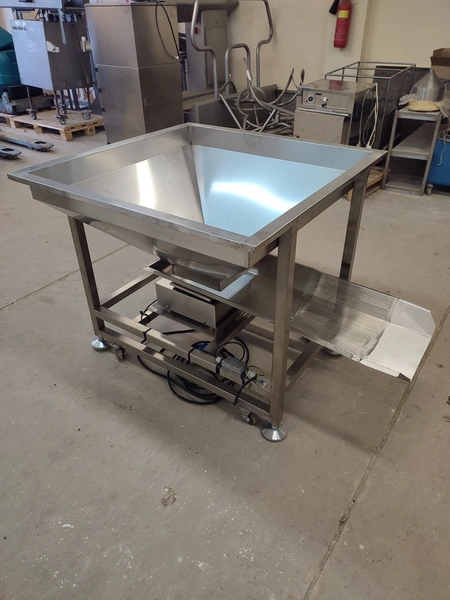 S/s mobile infeed bunker with vibrating gutter, dimensions: 1400 mm x 1000 mm x 900 mm.