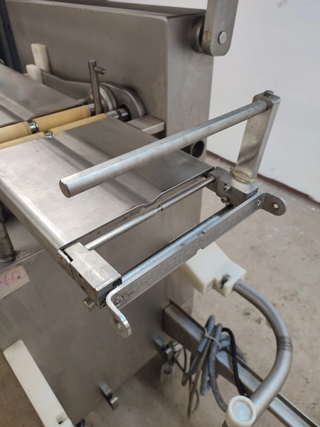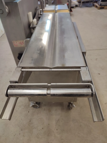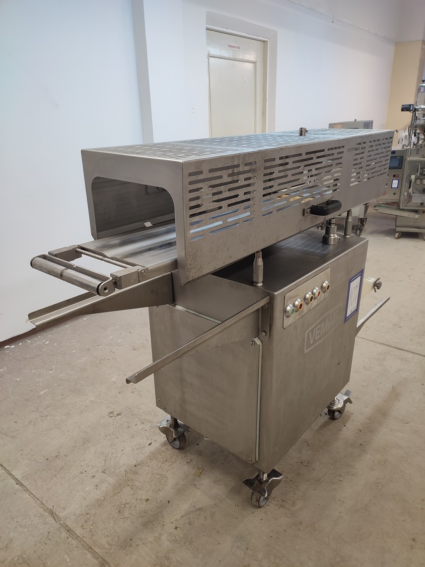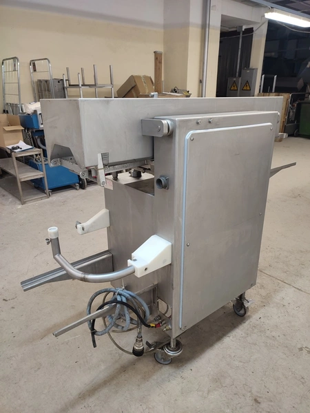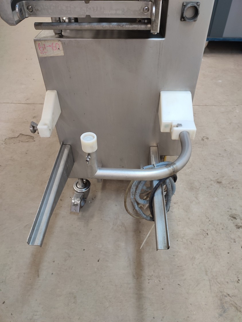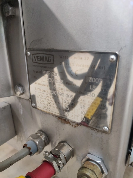 Vemag mobile portioning machine, model: MMP 220, number: 220 0122, year of construction: 2007, 220-240 V / 6.3 A, 400-460 V / 3.5 A, 575 V / 2.5 A, 1.5 kW, pressure: 6 bar, belt width: 260 mm, total dimensions: 1770 mm x 620 mm x 1360 mm. Without belts.