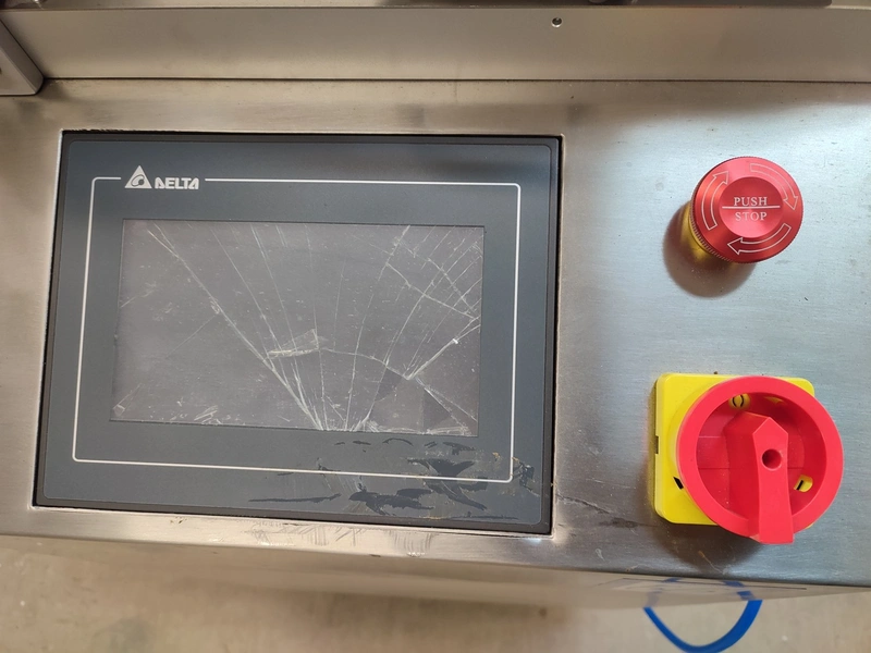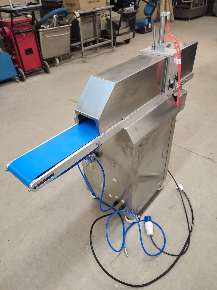 Mobile portioning machine, working width: 130 mm, plastic belt, belt width: 130 mm, total dimensions: 1200 mm x 405 mm x 1130 mm. Screen is broken.