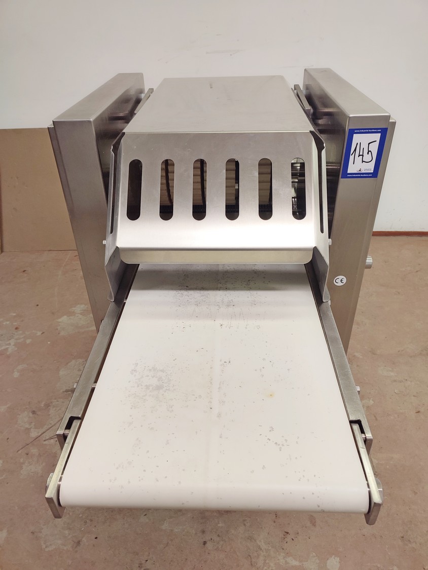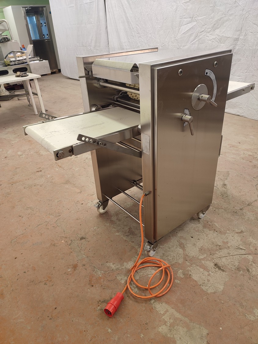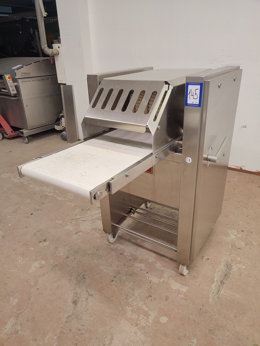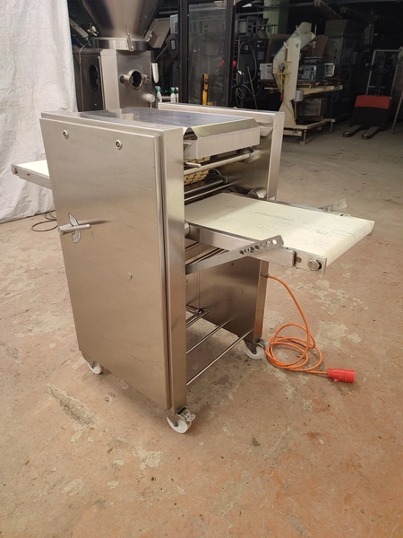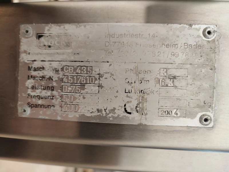 Nock mobile skinning machine, type: CB 435, number: 4517610, year of construction: 2004, 400 V, 3 Ph, 50 Hz, 0.75 kW, 6.3 A, working width: 440 mm, plastic belt, belt width: 370 mm, total dimensions: 800 mm x 1700 mm x 1200 mm.