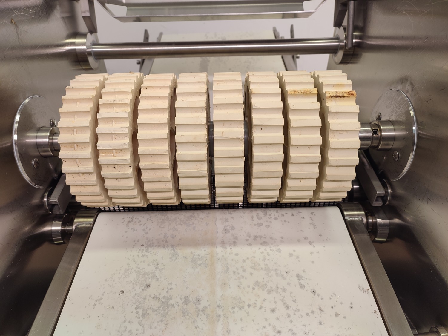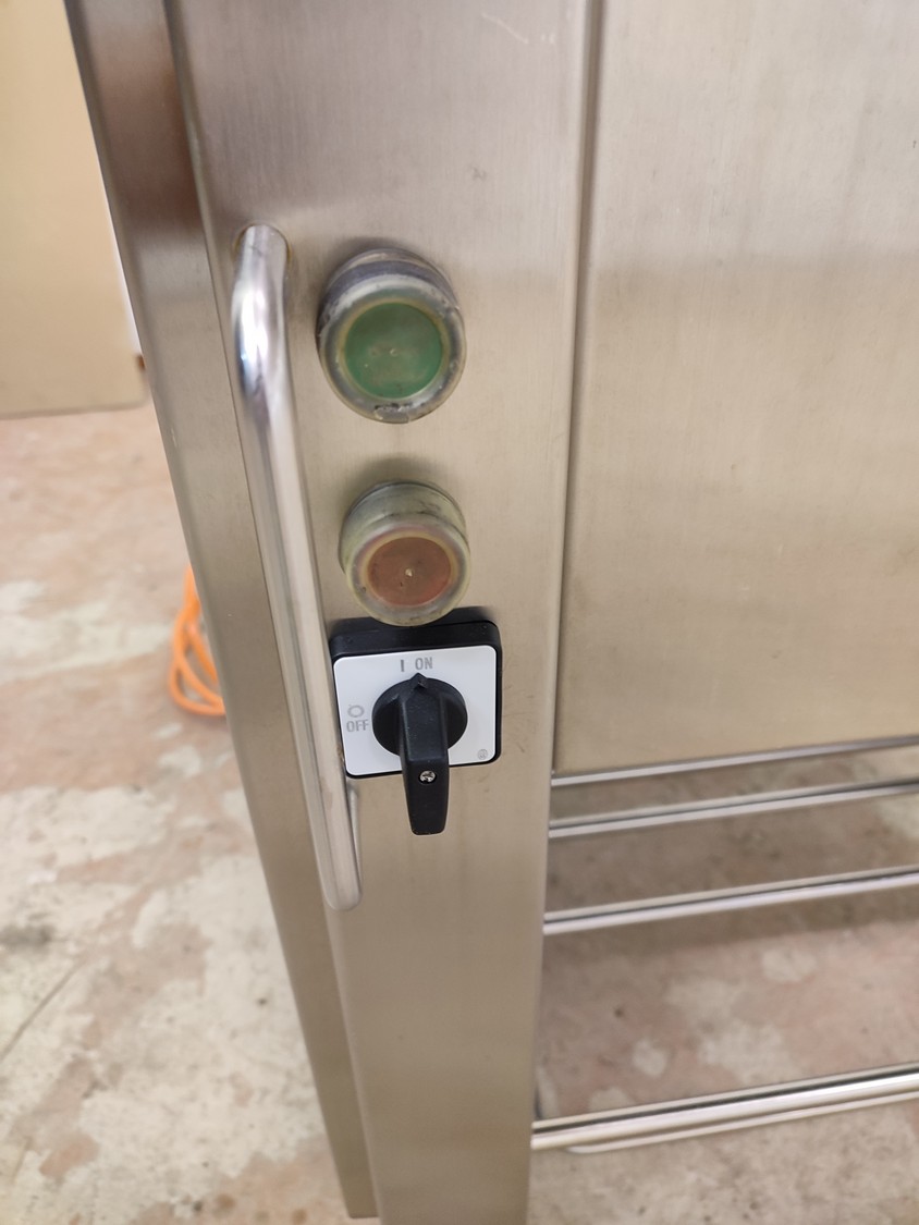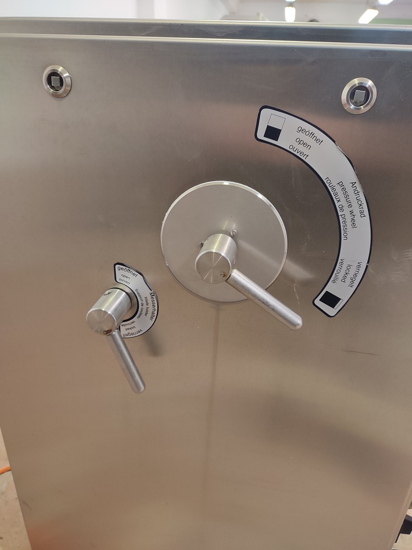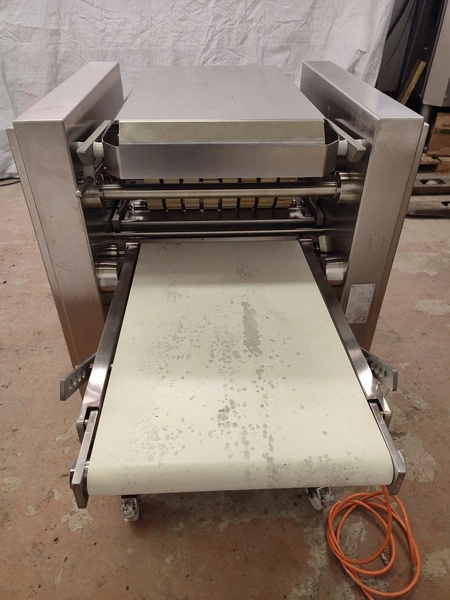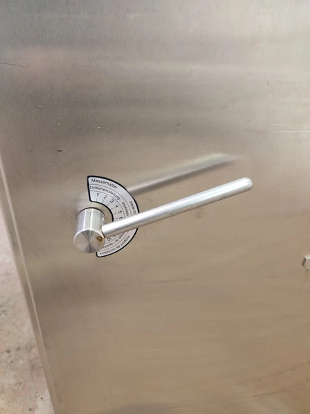 Nock mobile skinning machine, type: CB 435, number: 4517610, year of construction: 2004, 400 V, 3 Ph, 50 Hz, 0.75 kW, 6.3 A, working width: 440 mm, plastic belt, belt width: 370 mm, total dimensions: 800 mm x 1700 mm x 1200 mm.
