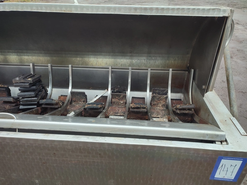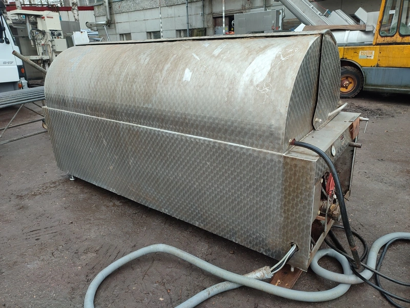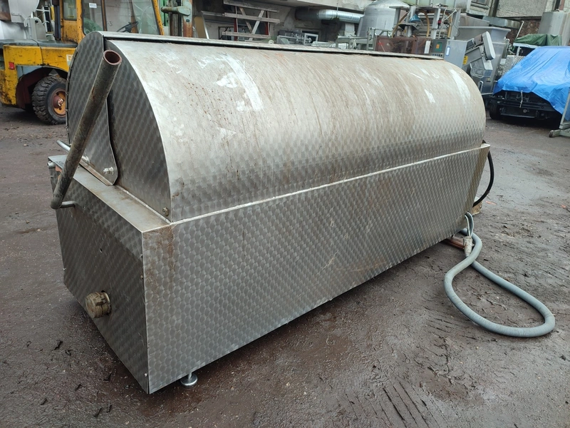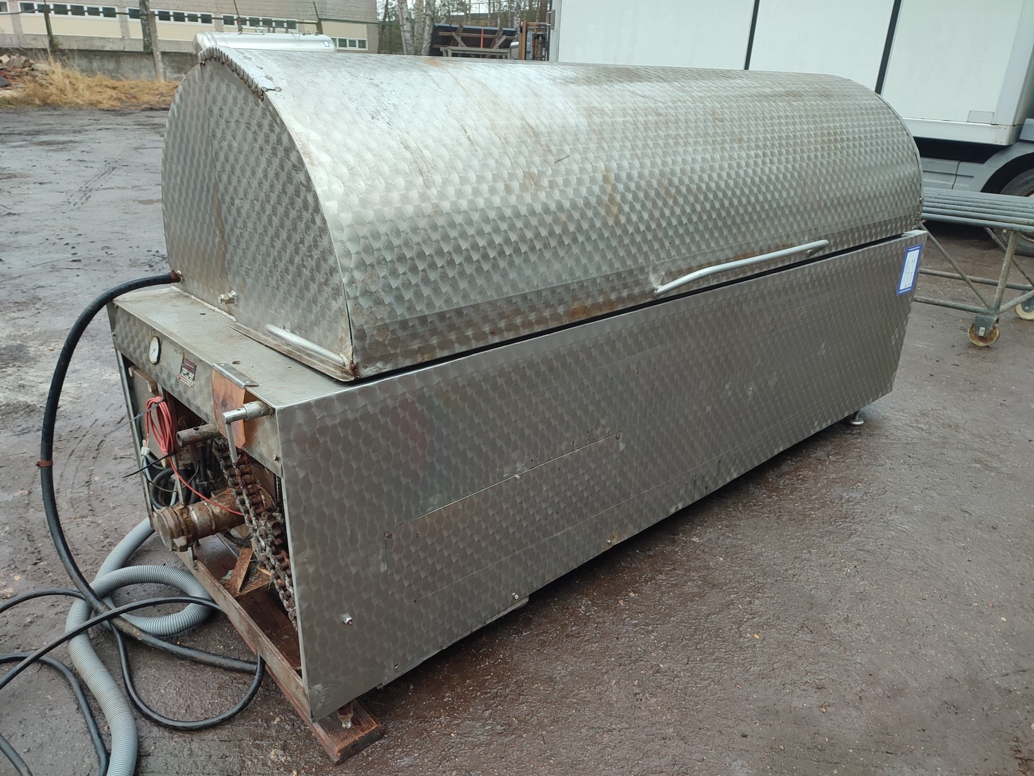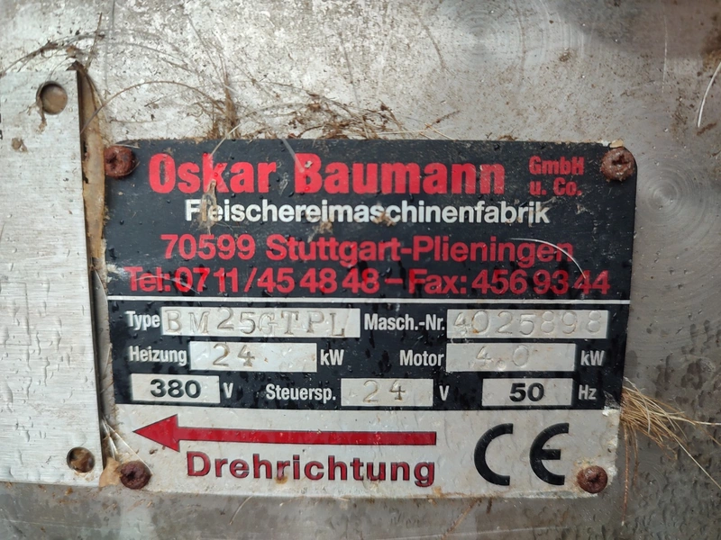 Oskar Baumann scalding and dehairing machine for pigs, type: BM25GTPL, machine number: 4025898, 380 V, heating: 24 kW, motor: 4.0 kW, working width: 2470 mm, total dimensions: 3000 mm x 1100 mm x 1400 mm. Including steel mobile table, dimensions: 1200 mm x 1610 mm x 750 mm.