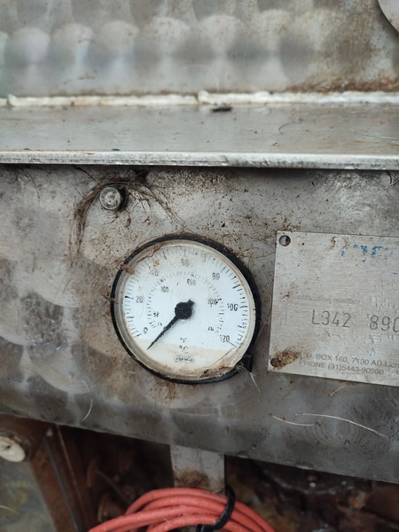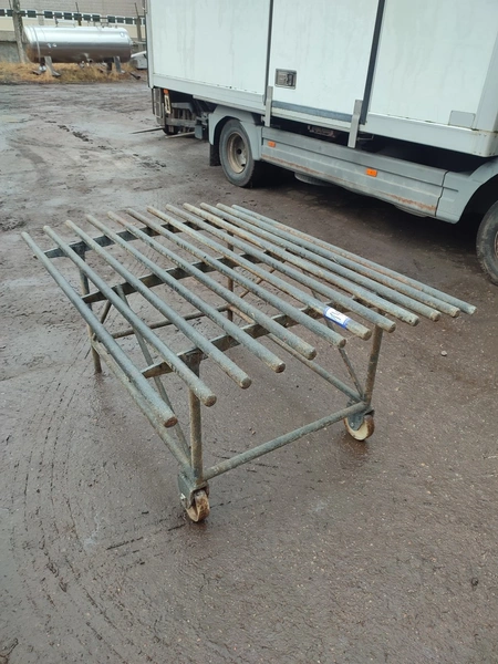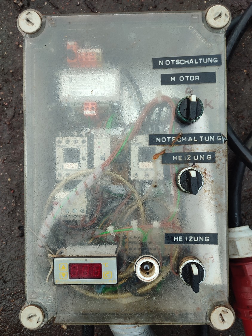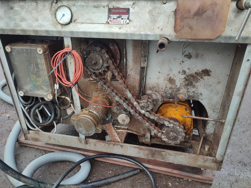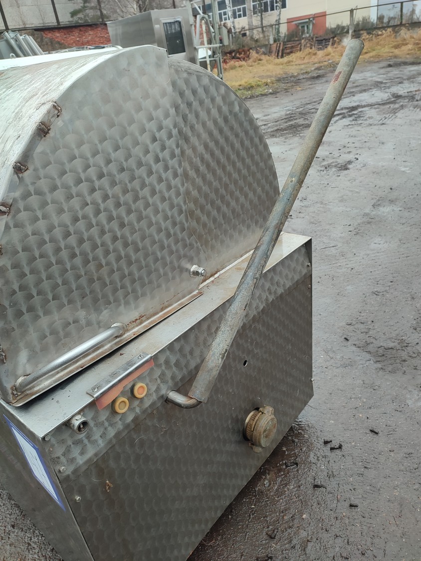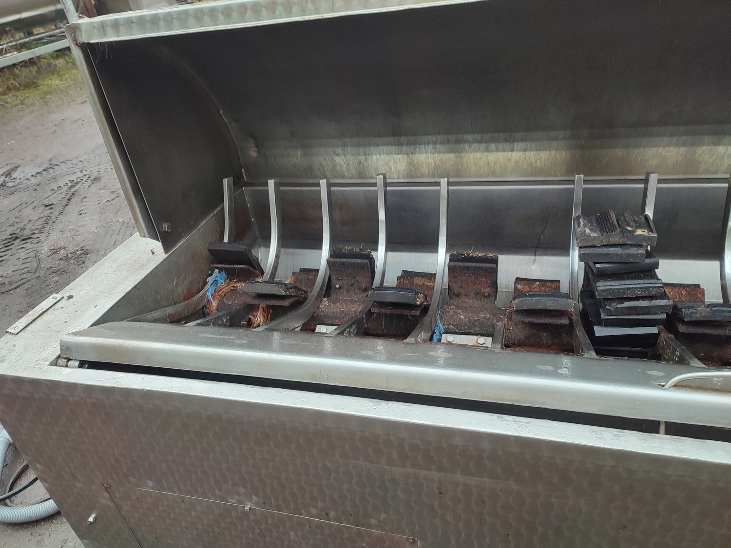 Oskar Baumann scalding and dehairing machine for pigs, type: BM25GTPL, machine number: 4025898, 380 V, heating: 24 kW, motor: 4.0 kW, working width: 2470 mm, total dimensions: 3000 mm x 1100 mm x 1400 mm. Including steel mobile table, dimensions: 1200 mm x 1610 mm x 750 mm.