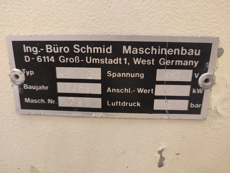 Ing.- Buro Schmid Maschinenbau traysealer, type: 462 VGA, machine number: 795, year of construction: 04/89, 380 V, 5 kW, 6 bar, dye: 290 mm x 230 mm, film width: 265 mm, Busch vacuum pump, type: 063-136, serial number: 184432, total dimensions: 900 mm x 900 mm x 1400 mm.