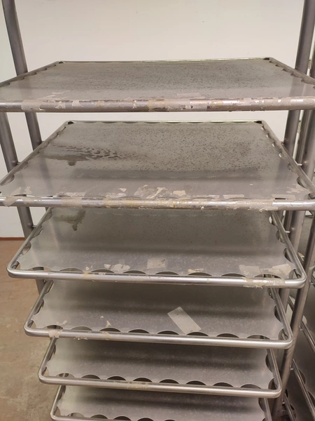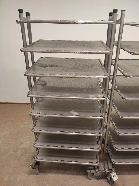 3 s/s defrosting trolleys, 8 floors, floor dimensions: (8x) 750 mm x 600 mm, distance between floors: 180 mm, total dimensions: (3x) 880 mm x 640 mm x 1810 mm.