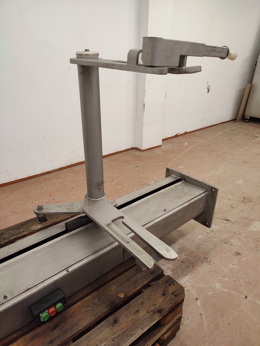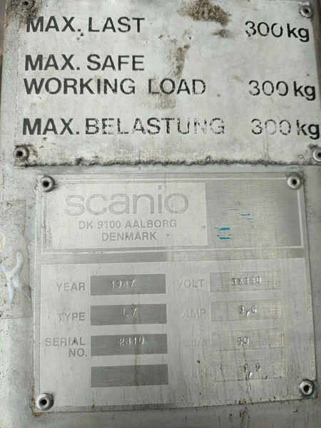 Scanio lifter for 200 liter meat bins, type: L7, serial number: 2810, year of construction: 1987, 380 V, 3 Ph, 50 Hz, 3.6 A, 1.5 kW, capacity: 300 kg, dimensions: 2830 mm x 600 mm x 1360 mm.