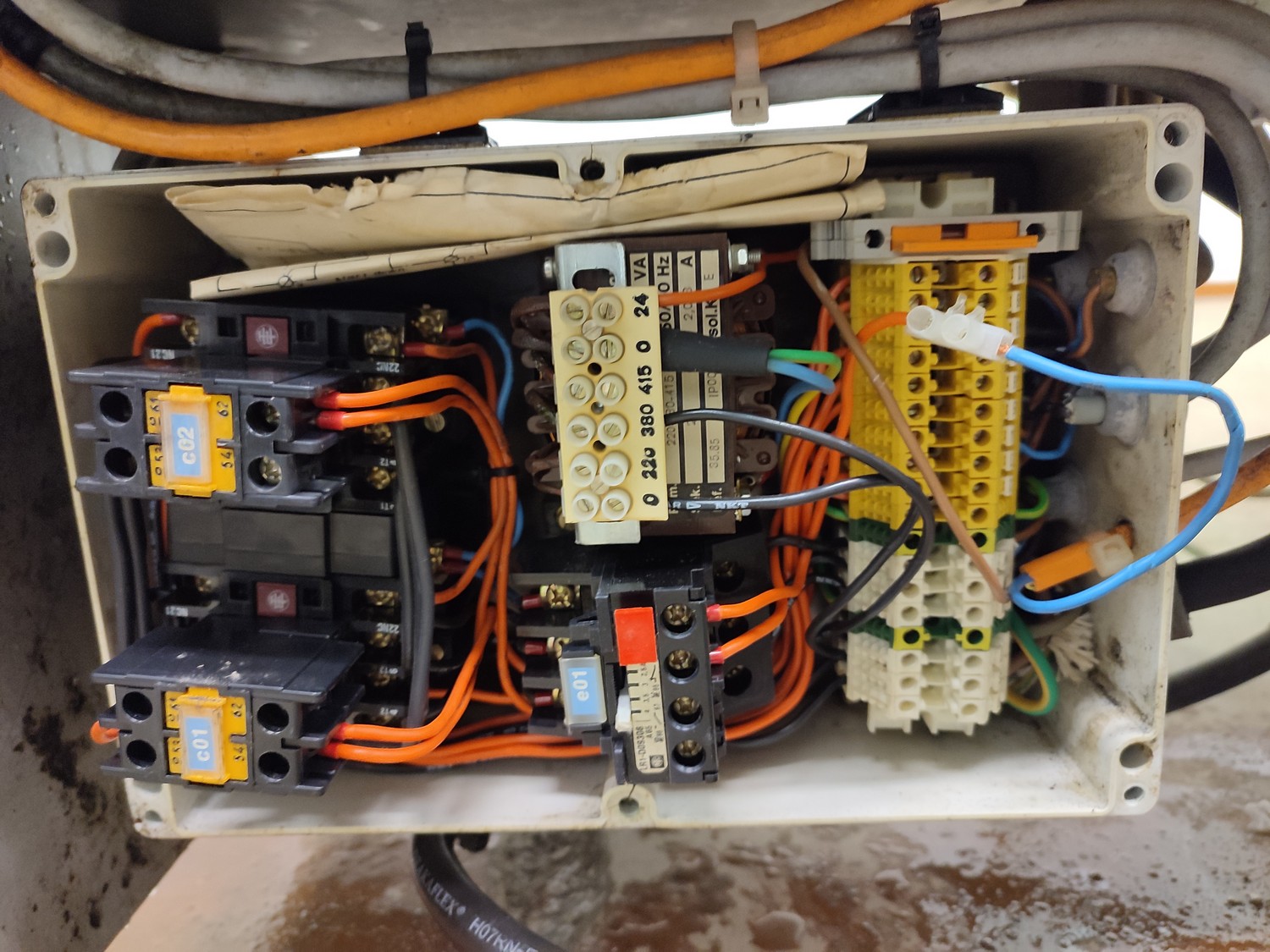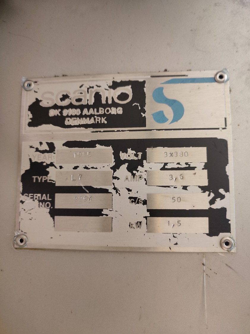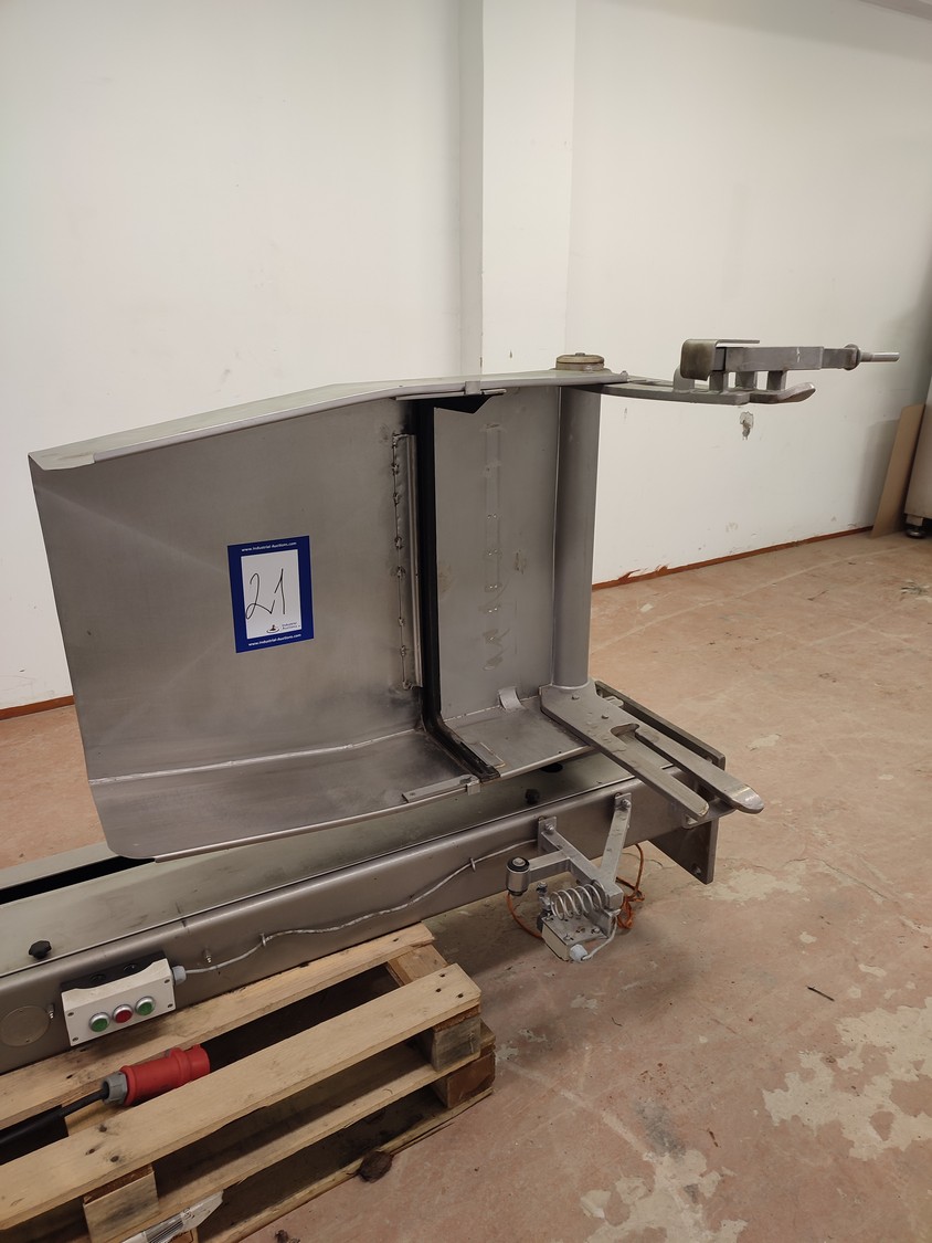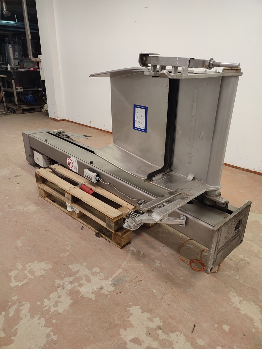 Scanio lifter for 200 liter meat bins, type: L7, serial number: 2294, year of construction: 1985, 380 V, 3 Ph, 50 Hz, 3.6 A, 1.5 kW, dimensions: 2830 mm x 700 mm x 1335 mm.