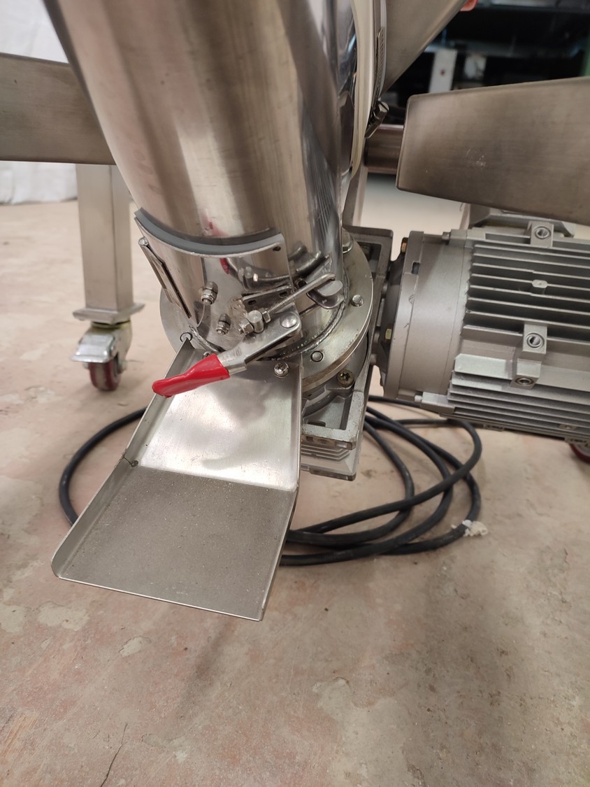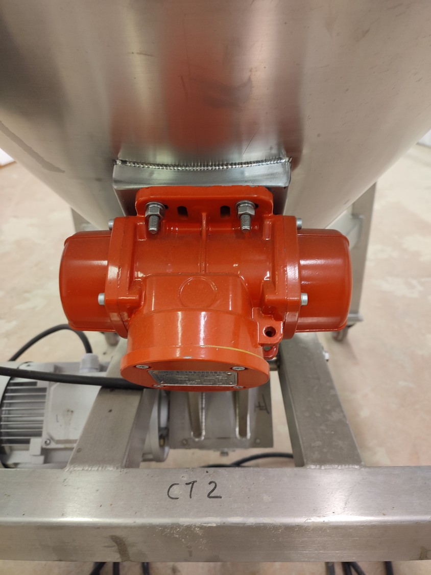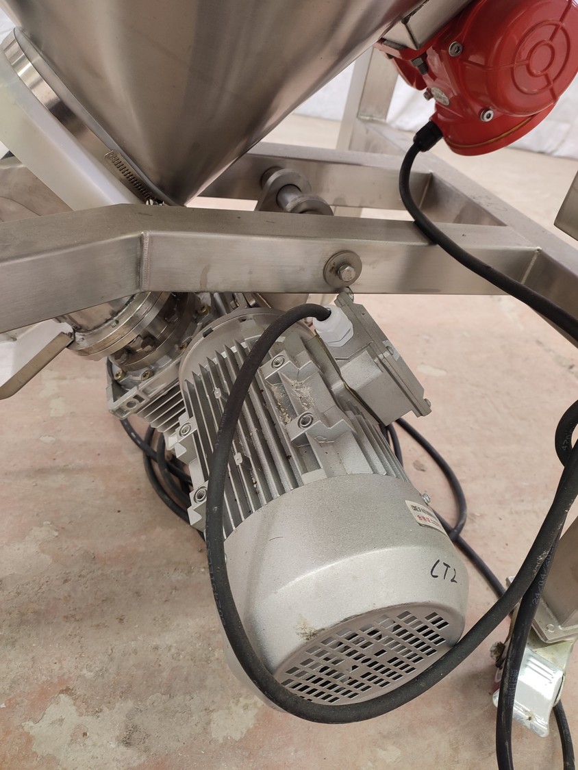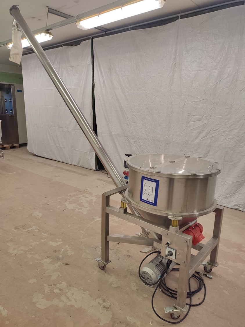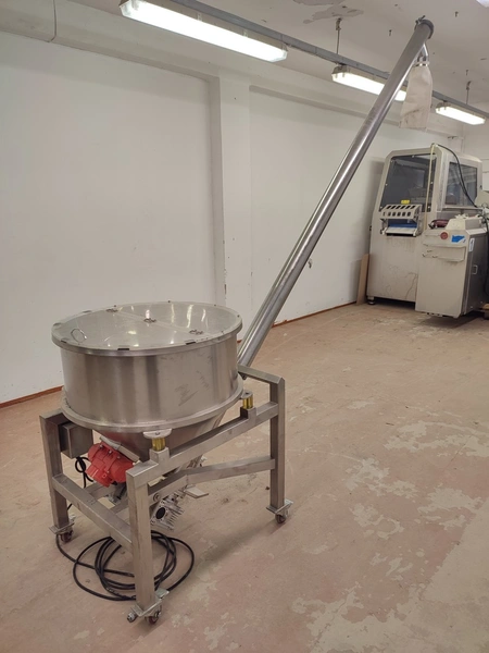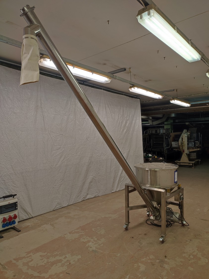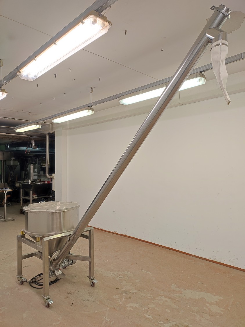 Mobile vibrating elevating screw, s/s screw, screw diameter: 100 mm, elevating height: 2300 mm, dimensions: 2800 mm x 750 mm x 2700 mm.