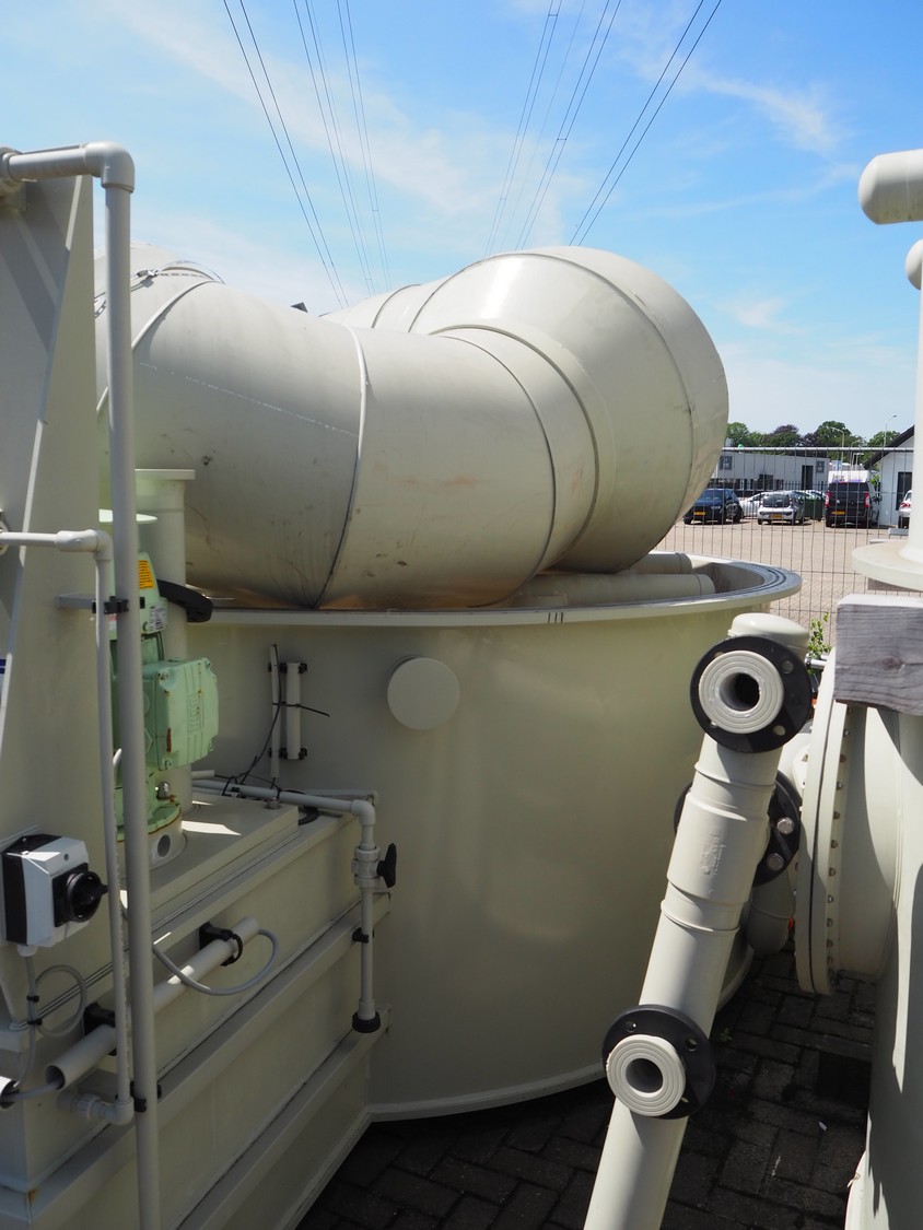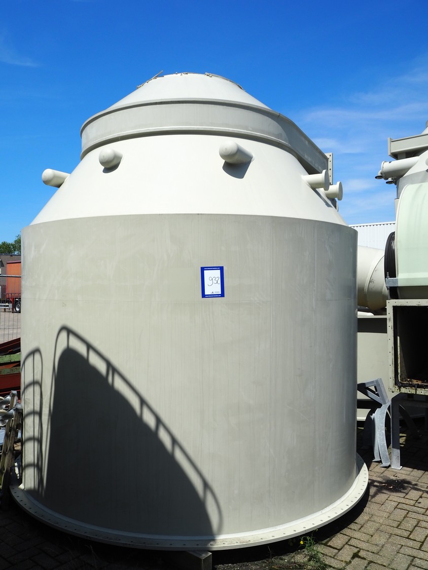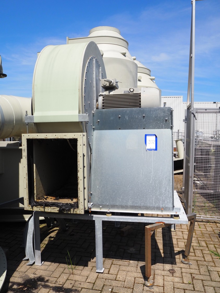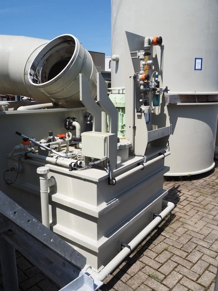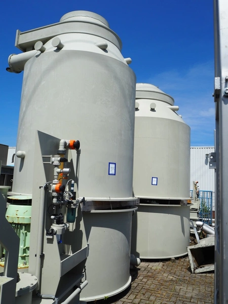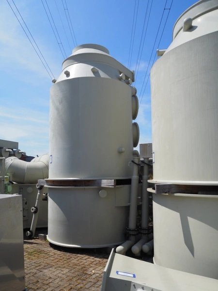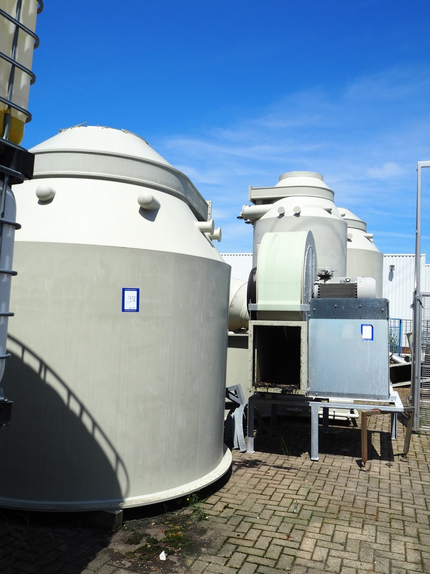 E.S.A. Group Odor Technology gas washing installation, consisting of: 4 plastic gas washing tanks, dimensions: (3x) 3000 mm x 4200 mm x 4450 mm, (1x) 3200 mm x 2900 mm x 4450 mm, blower, dimensions: 2700 mm x 3700 mm x 2850 mm, switch cabinet, dimensions: 1800 mm x 500 mm x 2200 mm, 4 plastic cabinets with Prominent dosing pump, capacity: 13.5 liter per hour, dimensions cabinets: (4x) 700 mm x 550 mm x 1000 mm. Lot has already been dismantled.