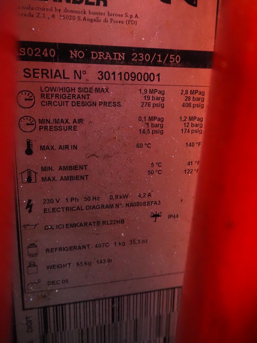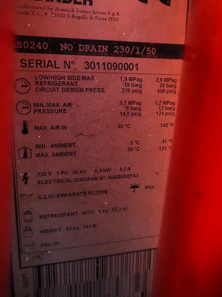 Zander air dryer, model: AS0240, serial number: 3011090001, 230 V, 1 Ph, 50 Hz, 4.2 A, 0.9 kW, dimensions: 620 mm x 570 mm x 810 mm. Technical condition unknown.