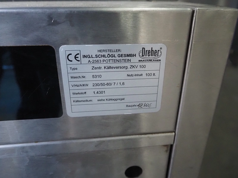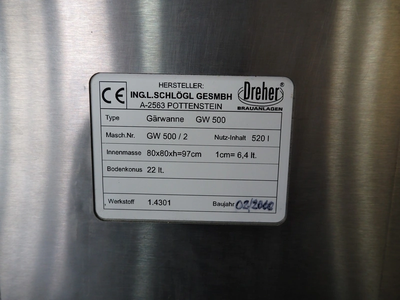 3 Dreher fermenting tanks, type: GW 500, machine number: GW 500 / 2, year of construction: 02.2006, volume: 520 litres each, inside dimensions: (3x) 800 mm x 800 mm x 970 mm, total dimensions: (2x) 950 mm x 920 mm x 1340 mm, (1x) 1060 mm x 910 mm x 1520 mm.