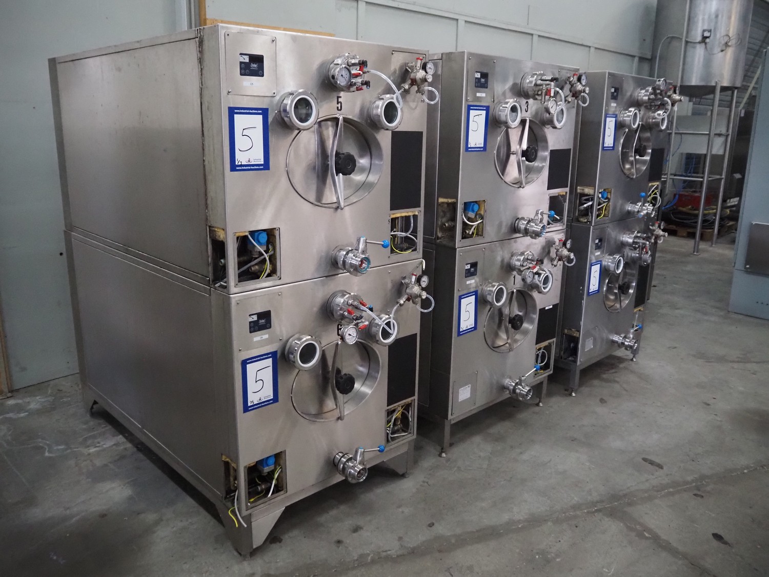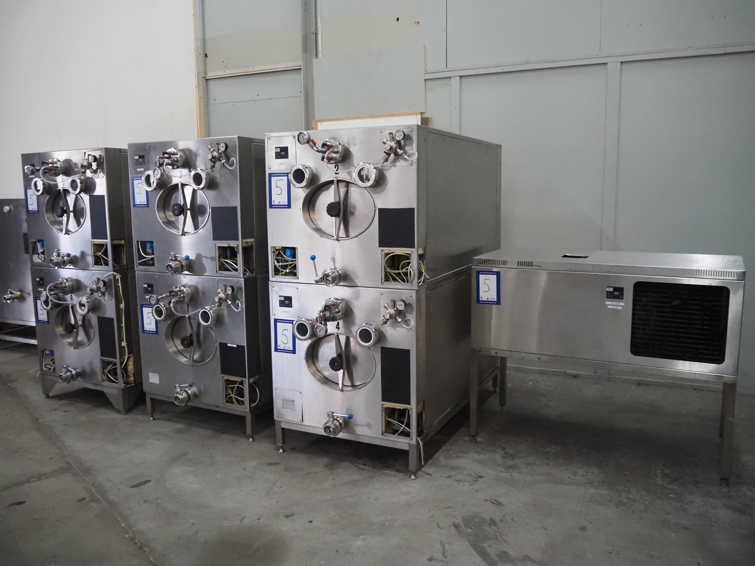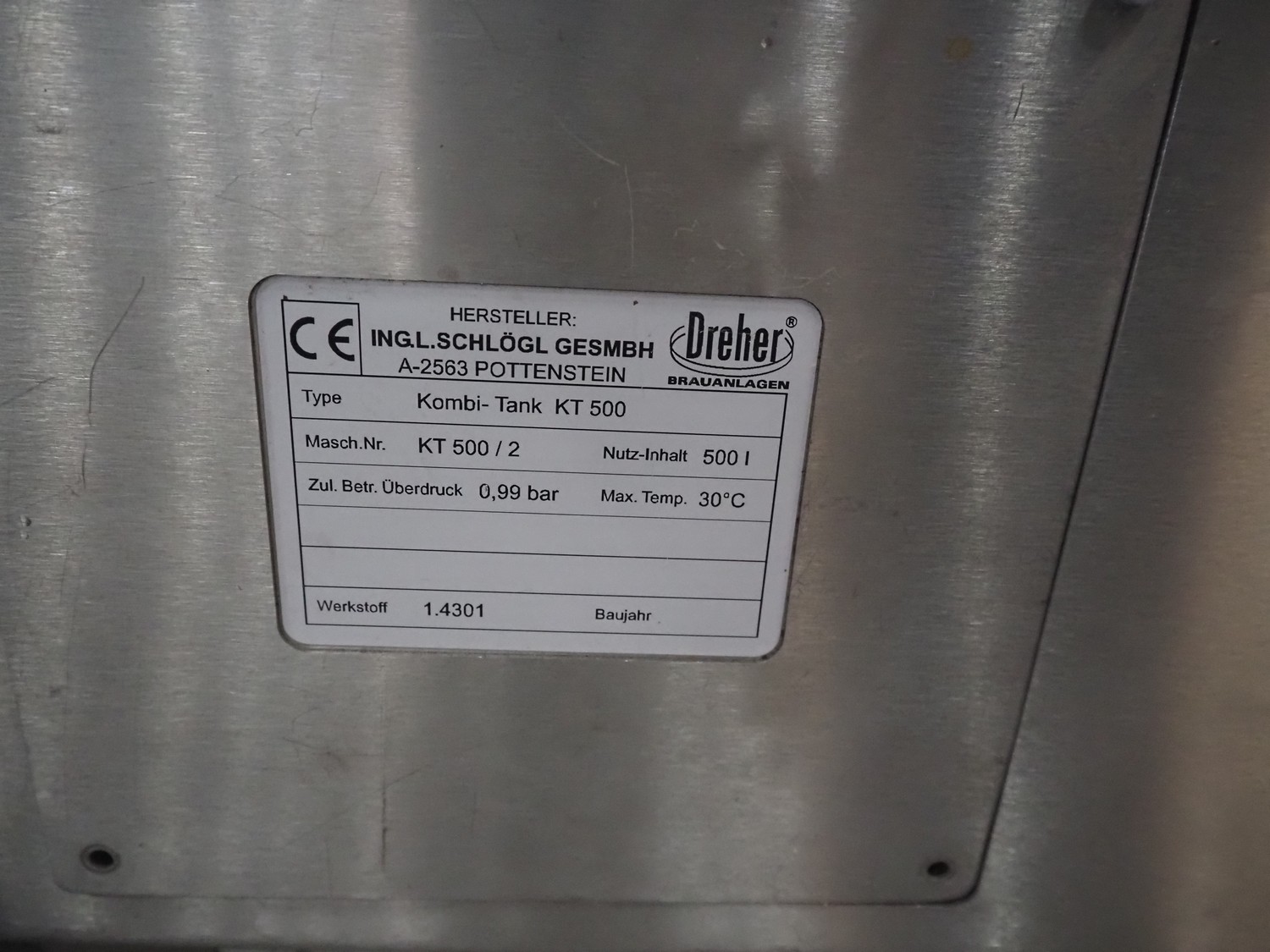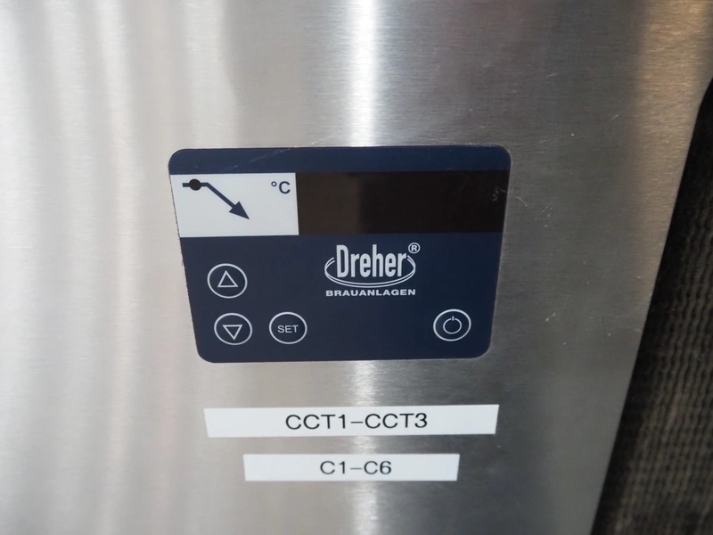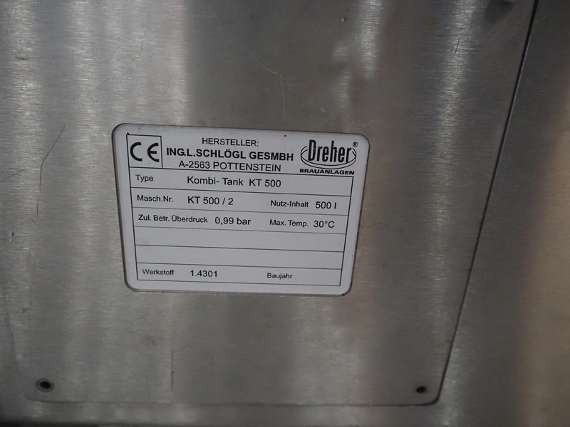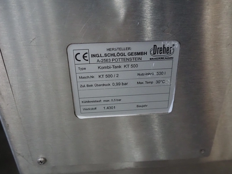 6 Dreher Kombi-tanks, type: KT500, year of construction: 2006, max. 0.5 bar, max. temperature 30 °C., volume: (6x) 500 litres, dimensions: (6x) 900 mm x 1780 mm x 820 mm. Including Dreher cooling unit, serial number: 13J04 202722 4G66831236, refrigerant: R404A, 220-240 V, 50 Hz, 7.9 A, dimensions: 1400 mm x 630 mm x 1140 mm.