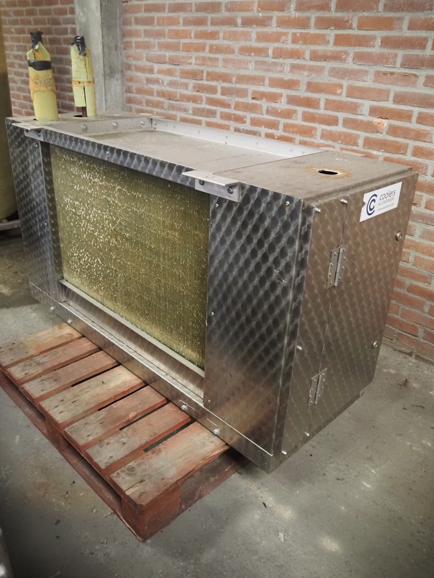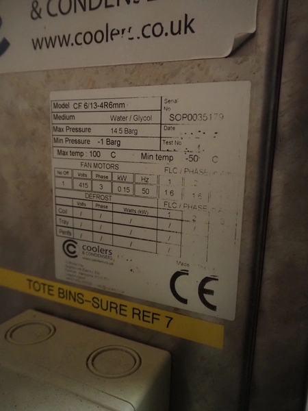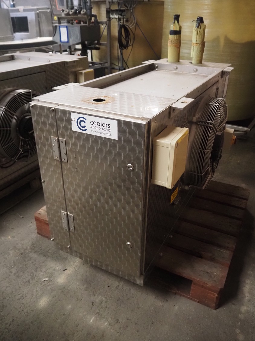 Coolers & condensers s/s evaporator, model: CF 6/13-4R6mm, serial number: SOP0035179, 415 V, 3 Ph, 50 Hz, maximum temperature: 100°C, minimum temperature: -50°C, 1 fan, total dimensions: 1850 mm x 900 mm x 1350 mm.