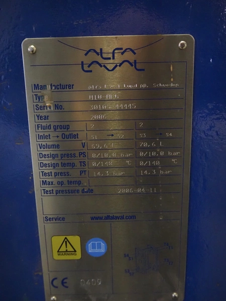 Alfa Laval plate heat exchanger, type: M10-MFG, serial number: 30105-44445, year of construction: 2006, volume: 69.6/70.6 liter, PS: 0/0.10 bar, TS: 0/140 °C, PT: 14.3 bar, total dimensions: 1800 mm x 560 mm x 1680 mm.