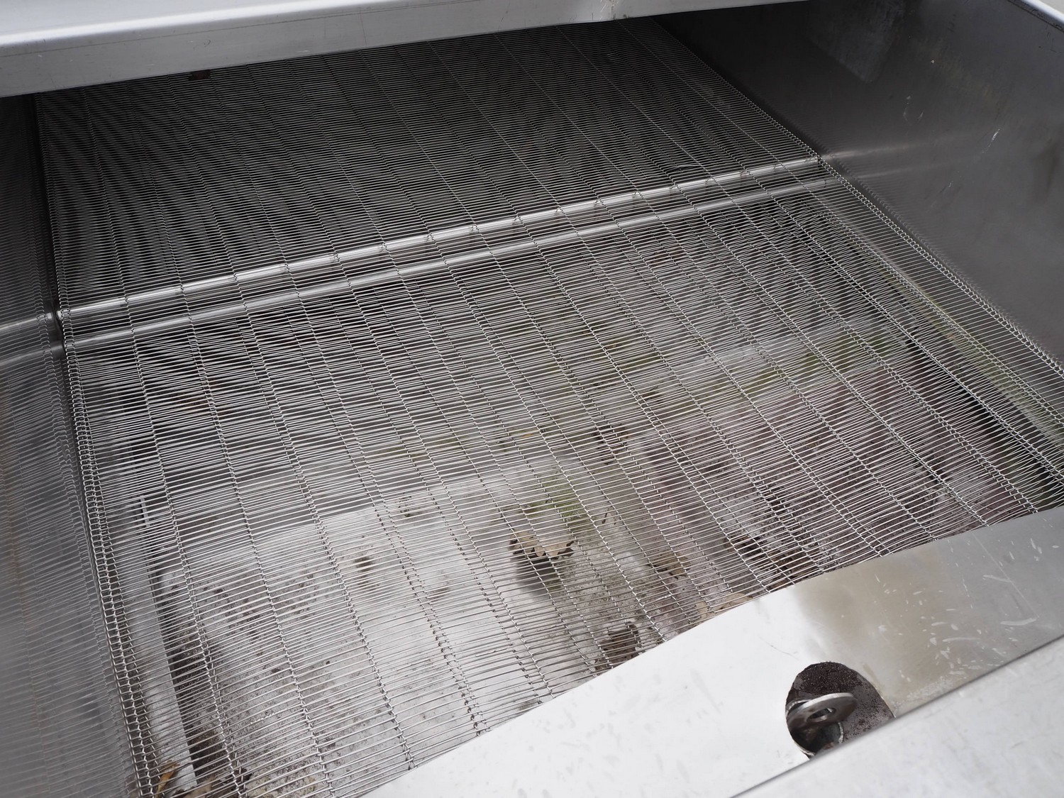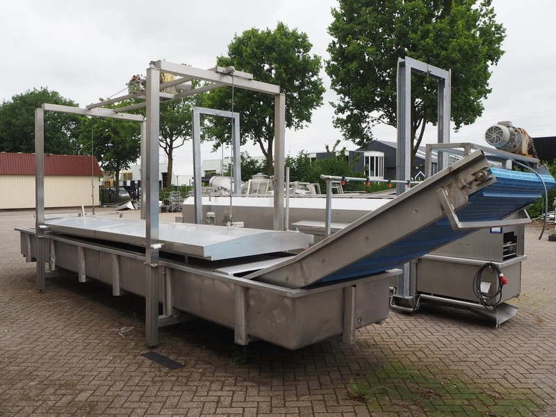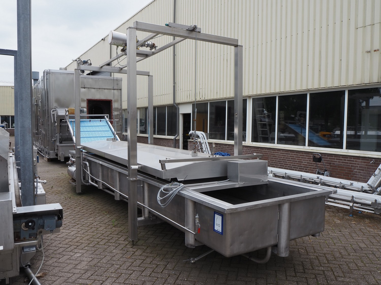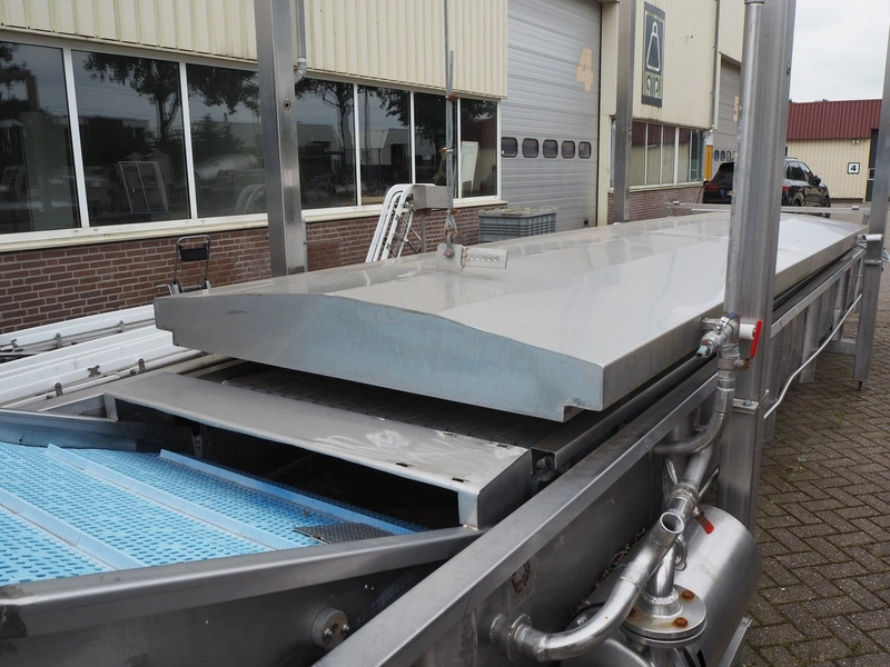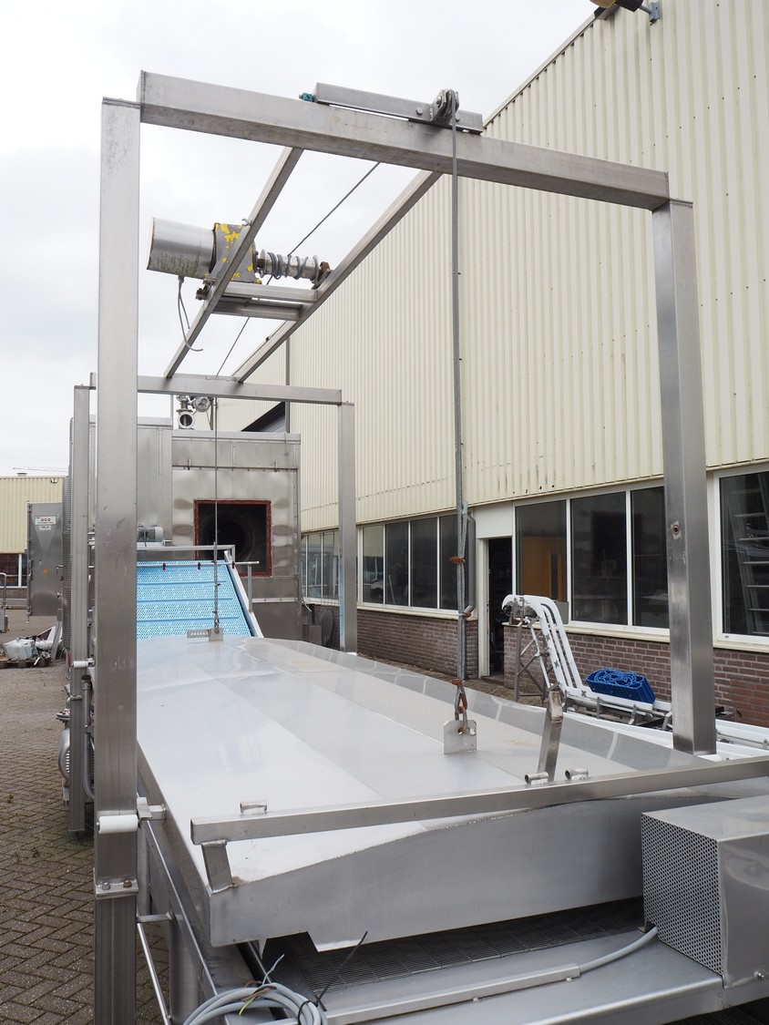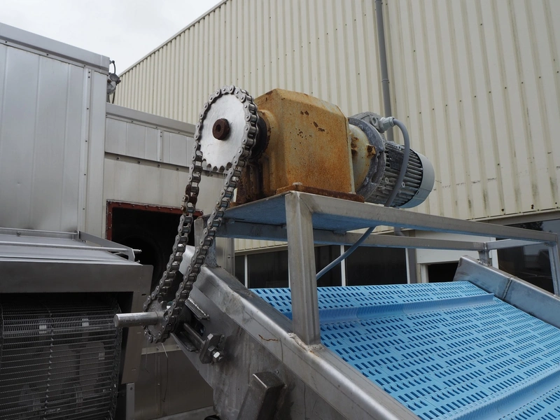 Cooking belt, s/s mesh belt, belt width: 1200 mm, plastic mesh belt with dividers, belt width: 1200 mm, distance between dividers: 350 mm, divider height: 25 mm, elevating height: 1800 mm, total dimensions: 9000 mm x 2200 mm x 3450 mm.
