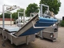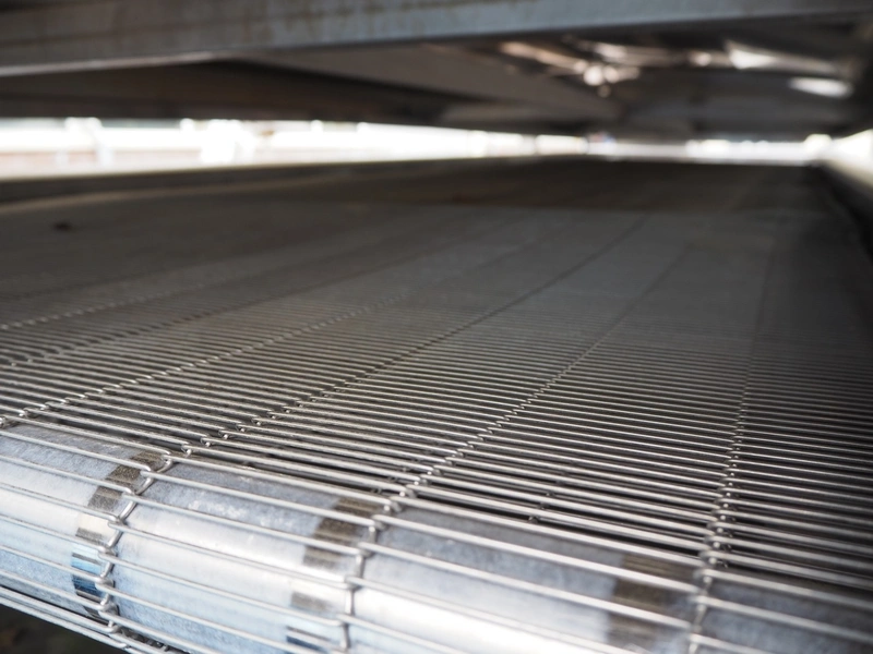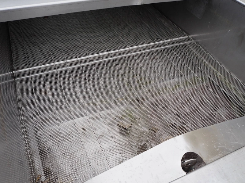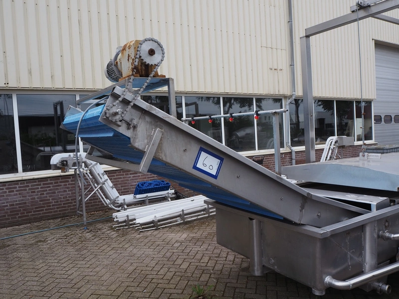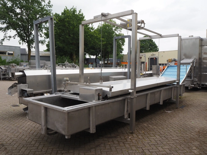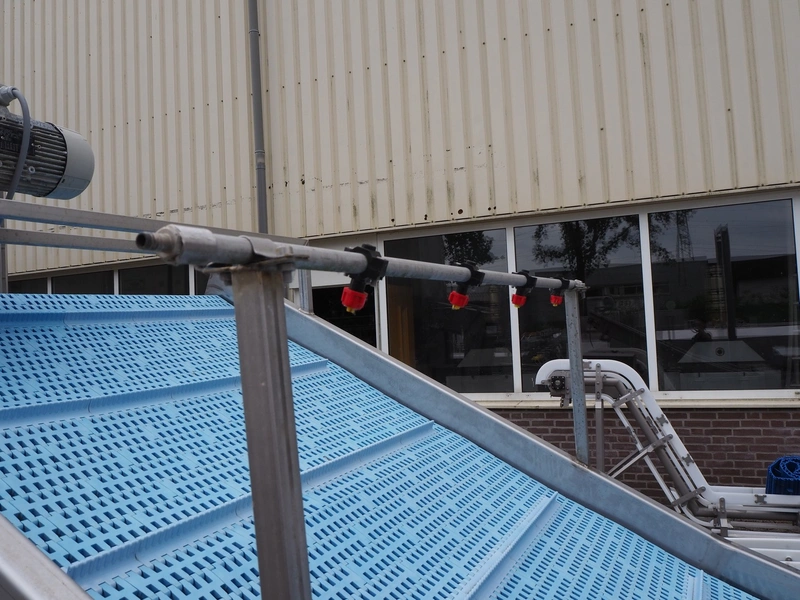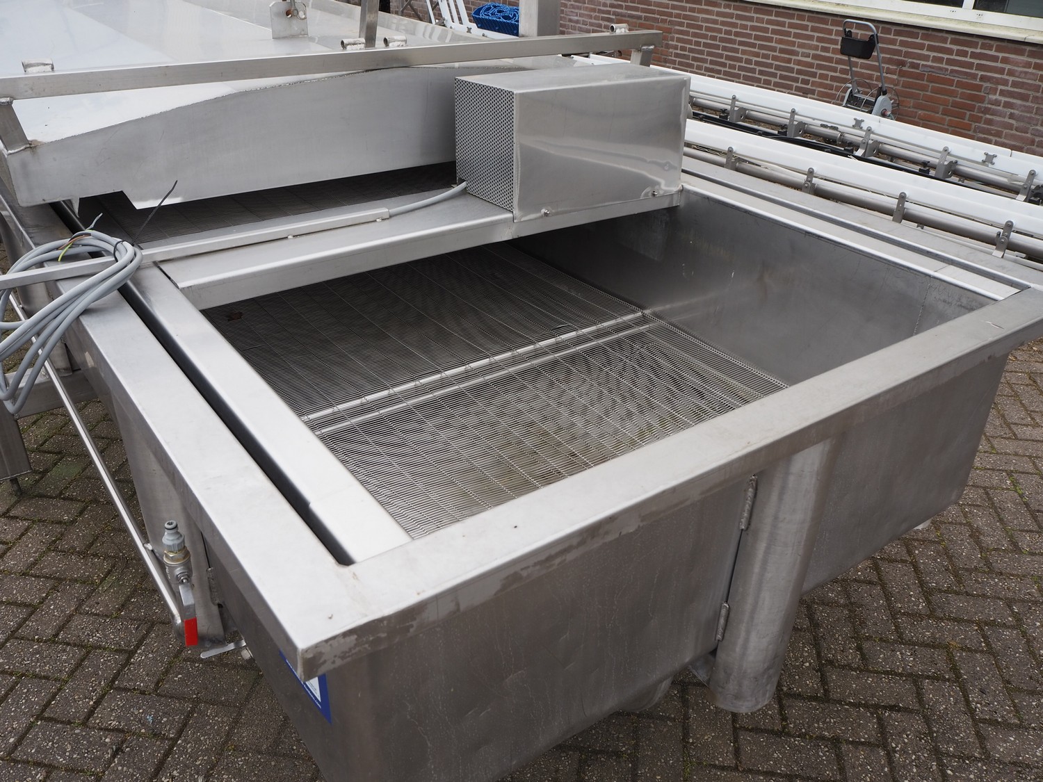 Cooking belt, s/s mesh belt, belt width: 1200 mm, plastic mesh belt with dividers, belt width: 1200 mm, distance between dividers: 350 mm, divider height: 25 mm, elevating height: 1800 mm, total dimensions: 9000 mm x 2200 mm x 3450 mm.