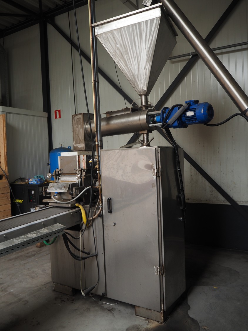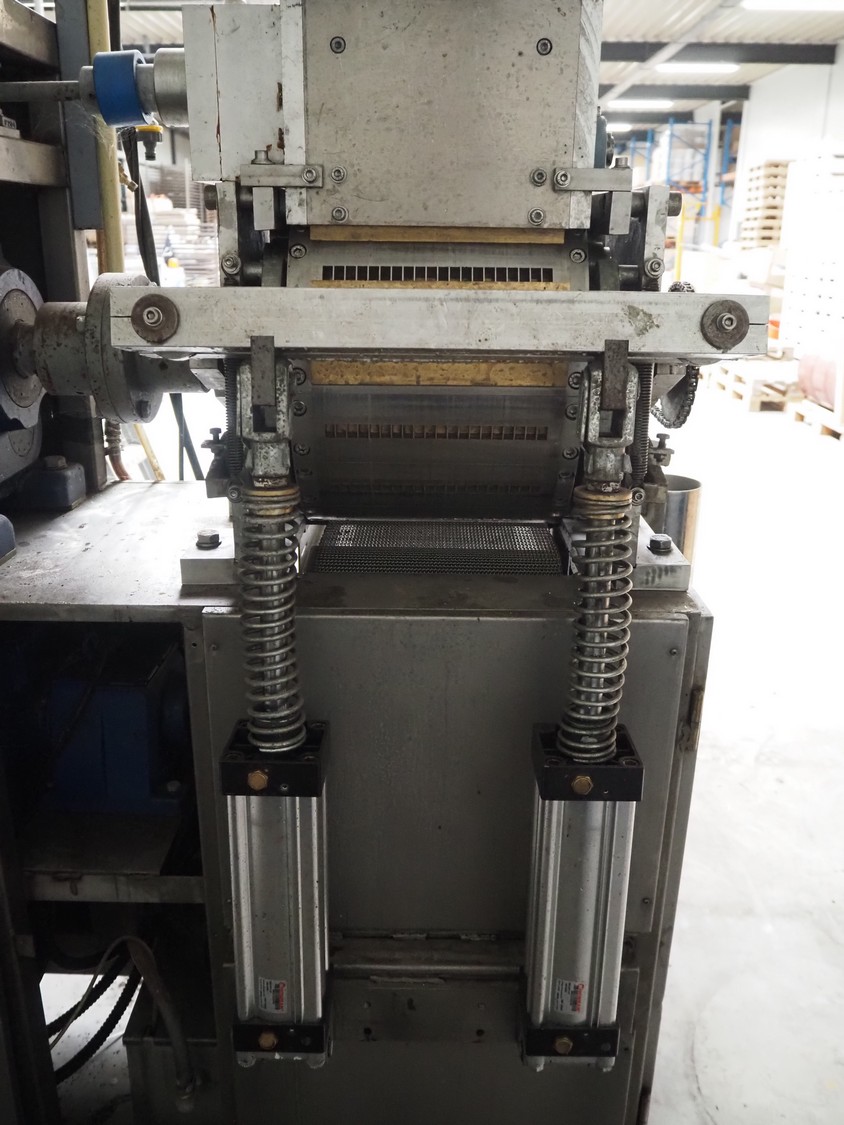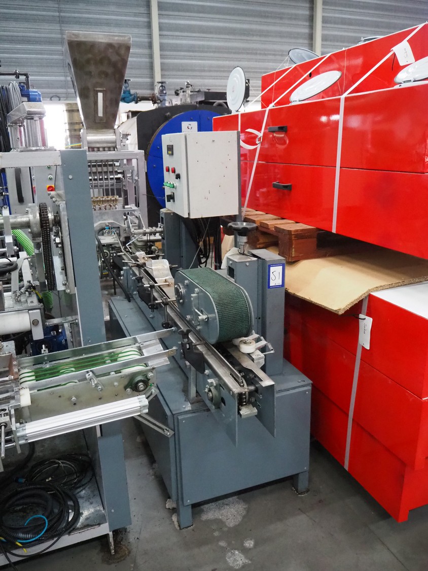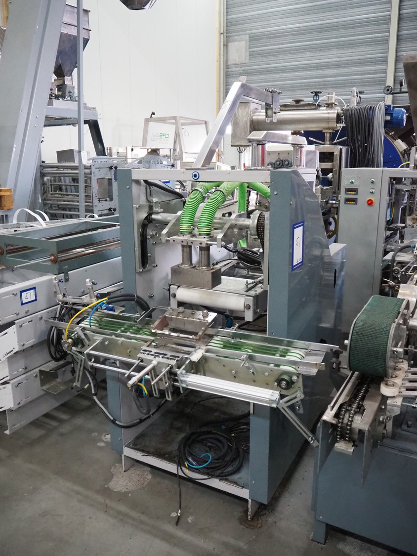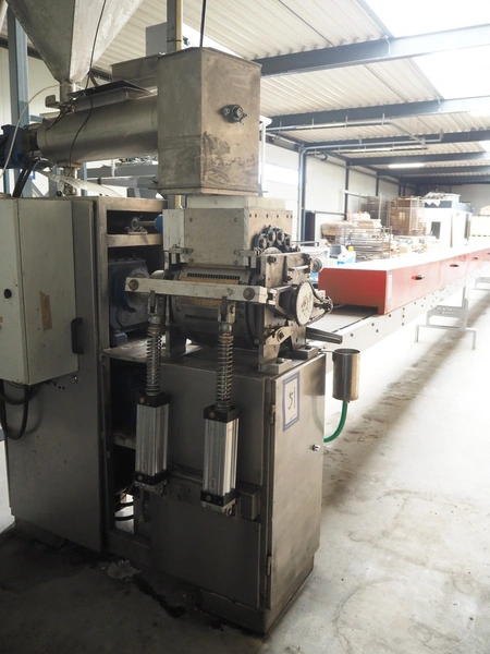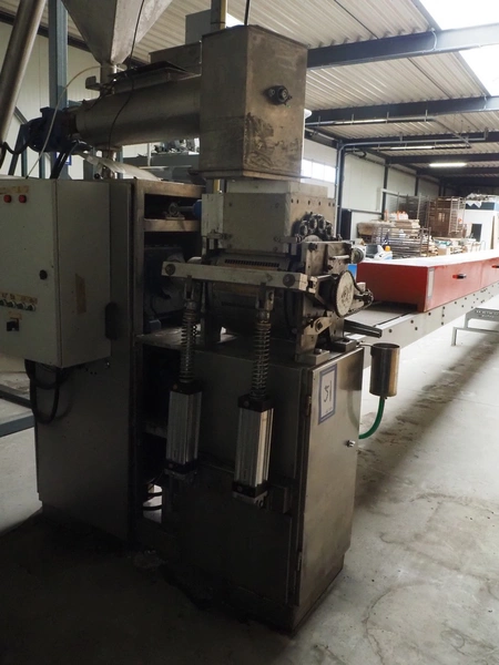 - Teknikeller Makina forming machine for sugar cubes, type: T.T.O.R. 125, 380 V, 3 Ph, 50 Hz, capacity: 12.500 kg/24 hours, dimensions forms: (20x) 10 mm x 15 mm, dimensions forming machine: 2000 mm x 900 mm x 2850 mm, with drying and cooling belt, s/s mesh belt, belt width: 295 mm, length drying area: 18000 mm, length cooling area: 4000 mm, including de-stacker, size: 100 mm x 200 mm, total dimensions: 33500 mm x 2000 mm x 2850 mm;