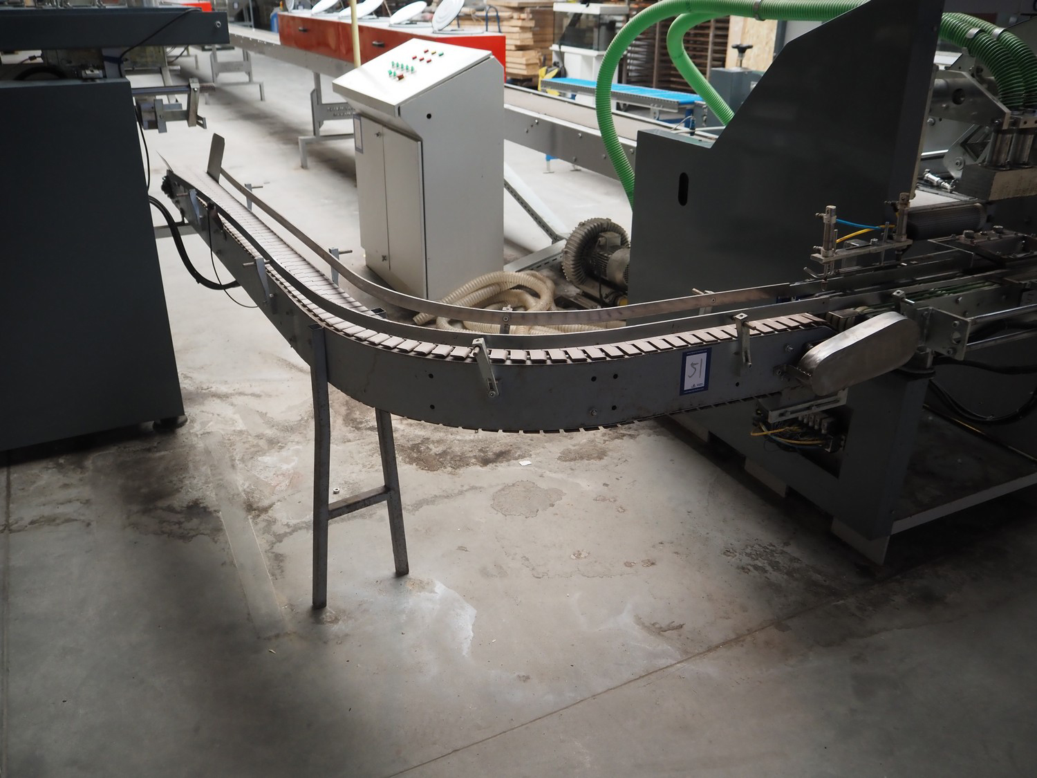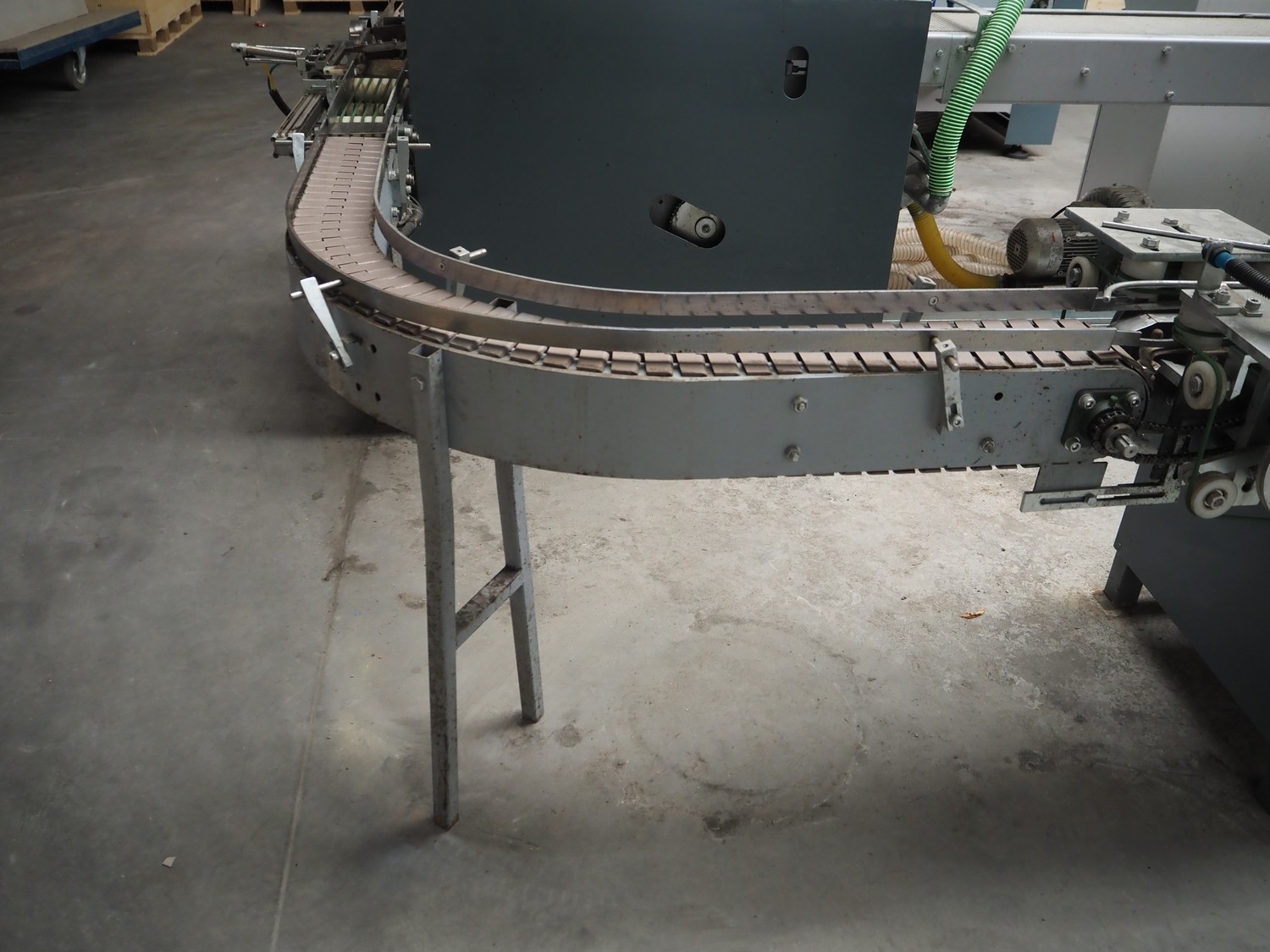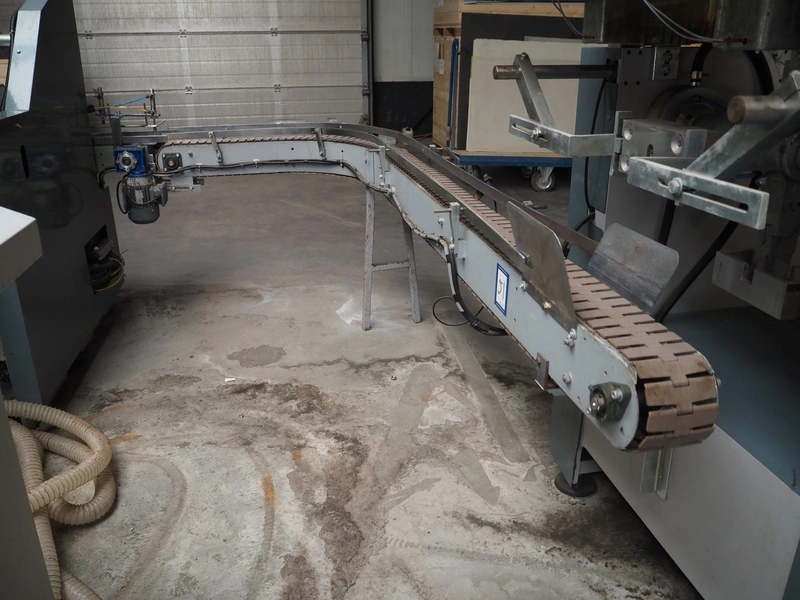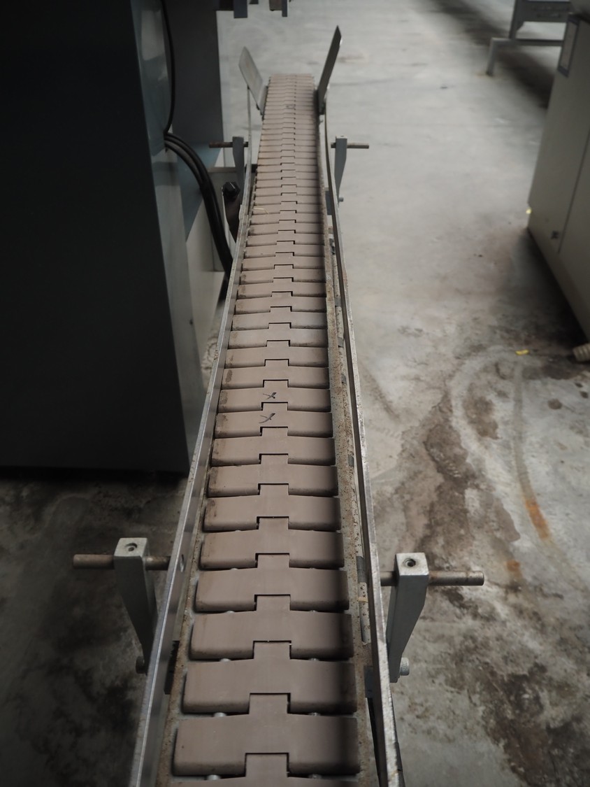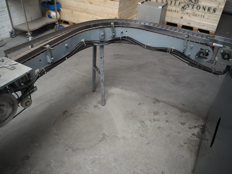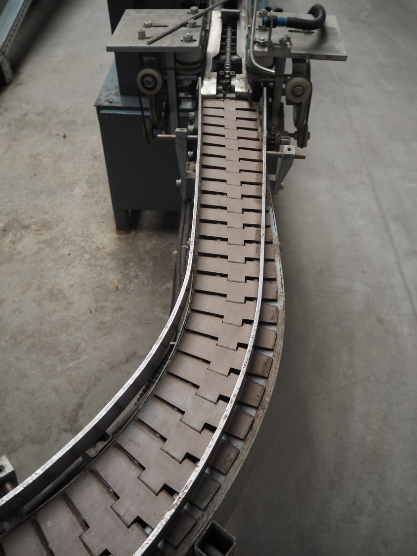 - 90° curve conveyor, steel frame, plastic belt, belt width: 120 mm, total dimensions: 1250 mm x 1100 mm x 1850 mm;