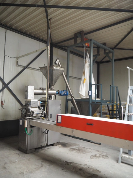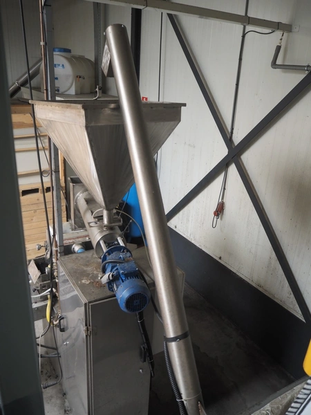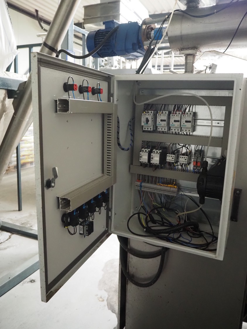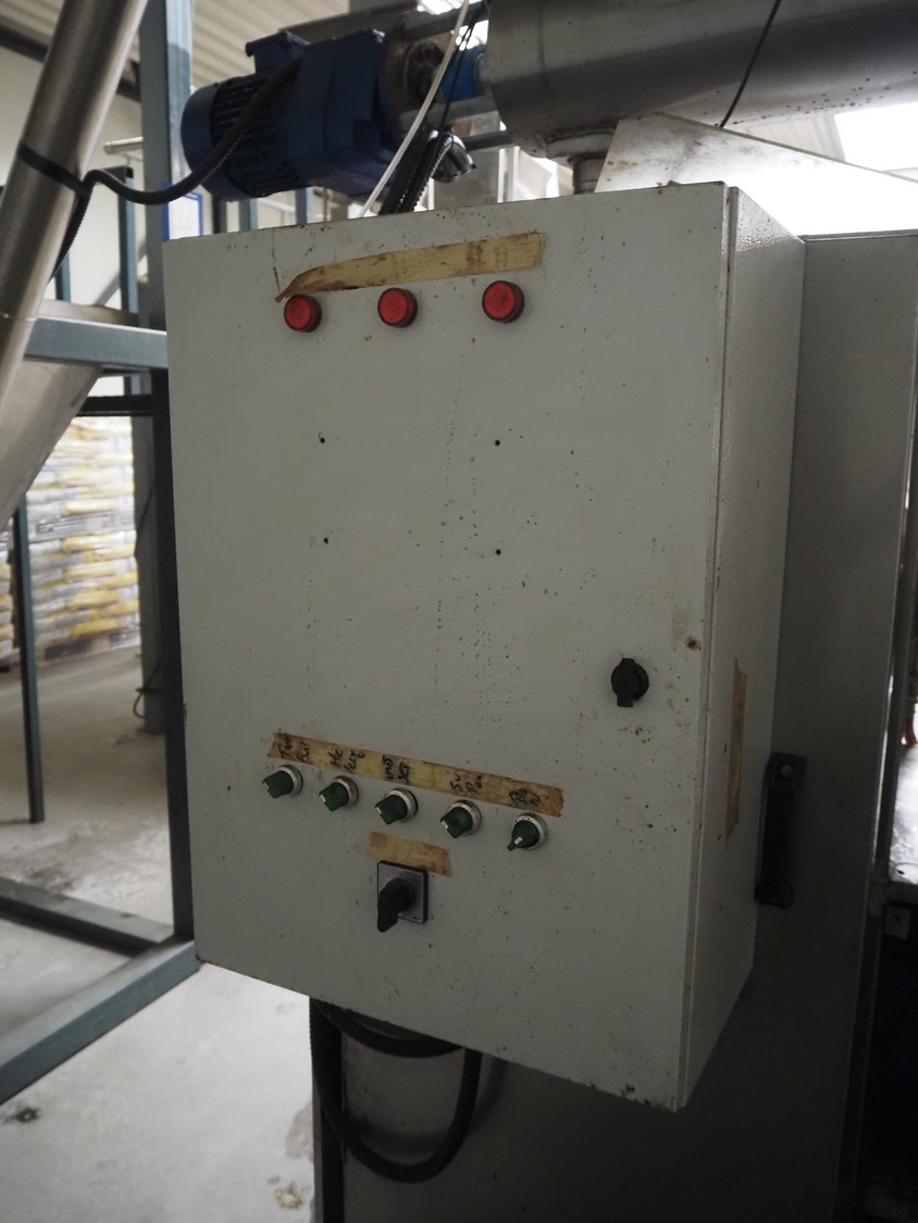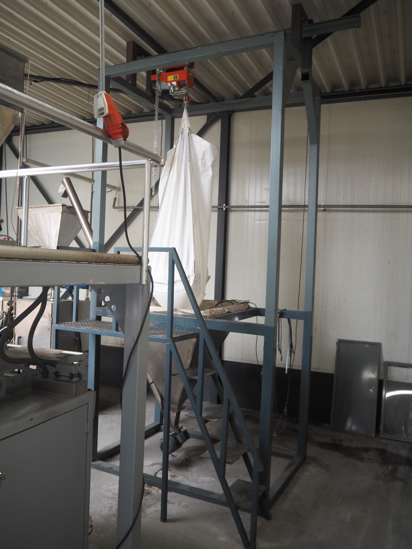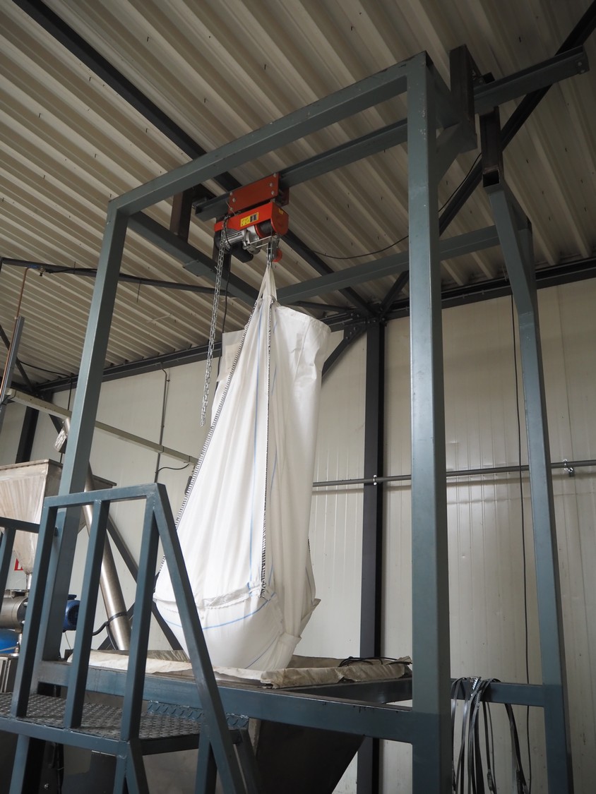 - Big bag infeed bunker, platform height: 1550 mm, with s/s elevating screw, elevating height: 3000 mm, with Electric rope hoist, type: HGS-B1200, 230 V, 50 Hz, capacity: 1200/600 kg, lifting height: 10/20 m, total dimensions: 3100 mm x 2020 mm x 4750 mm;