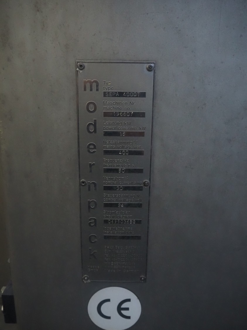 Modernpack Sepamatic separator, type: SEPA 4000T, serial number: 196607, 400 V, 50 Hz, 30 A, 15 kW, diameter drum: 380 mm, perforations drum: 4 mm, total dimensions: 1900 mm x 1600 mm x 1920